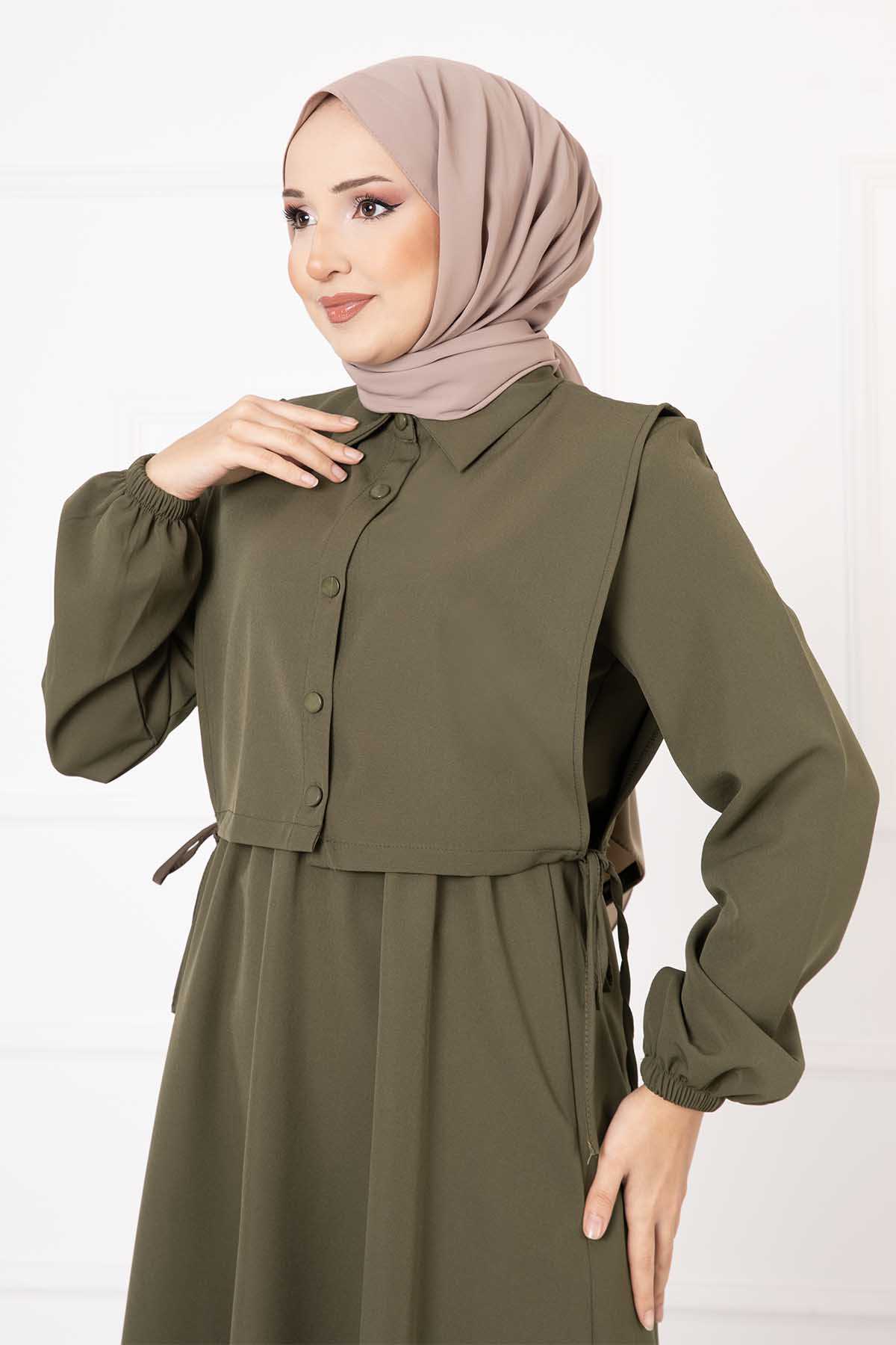 - Ürün mevsimliktir. Elbise bisiklet yaka sırtında damla düğmesi bulunmaktadır beli büzgülüdür. Crop aktif düğmelidir ve yanları bağlama detaylıdır