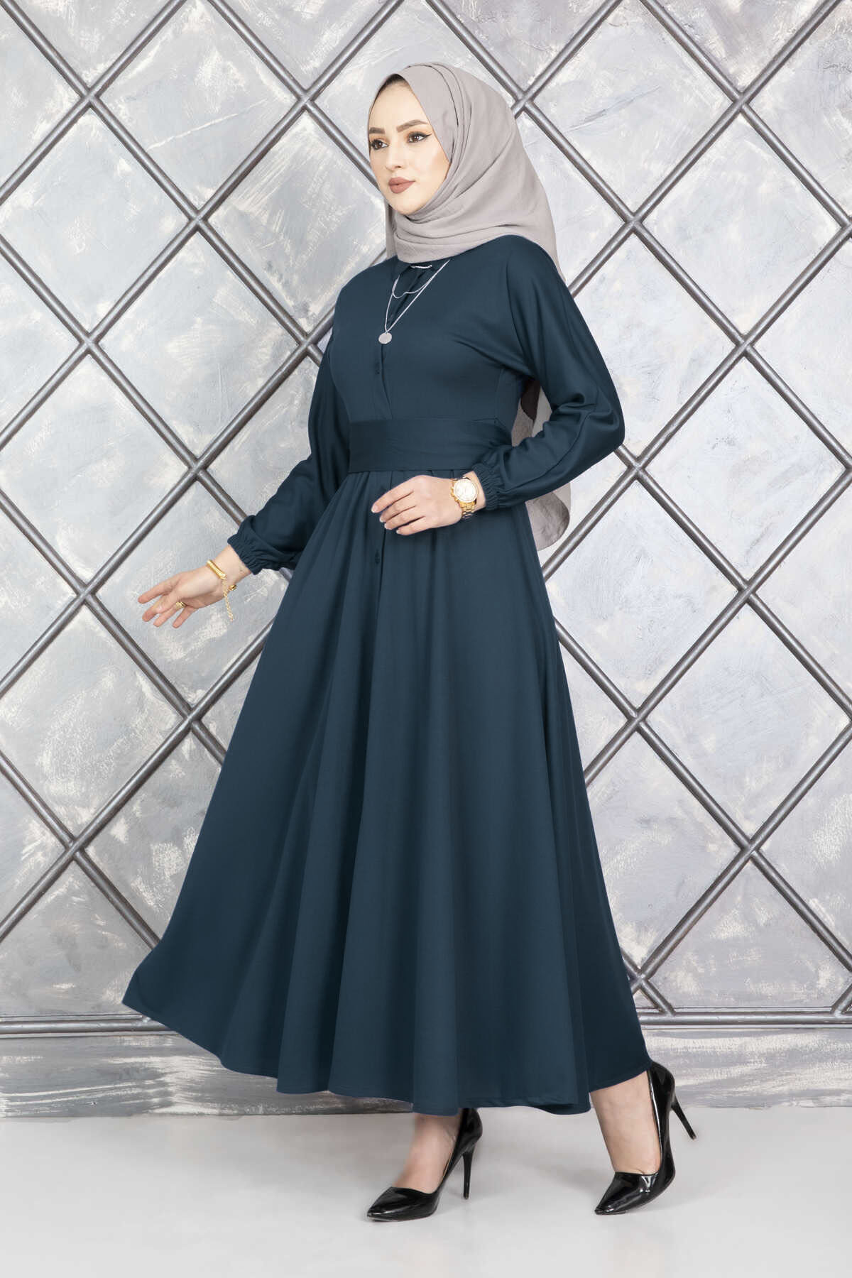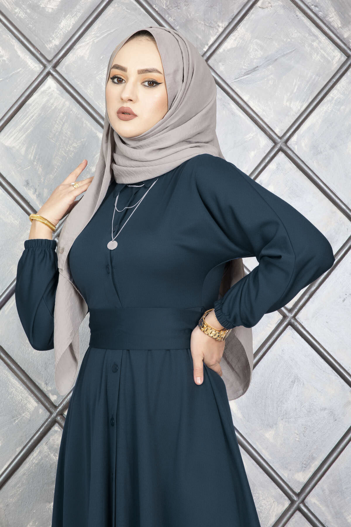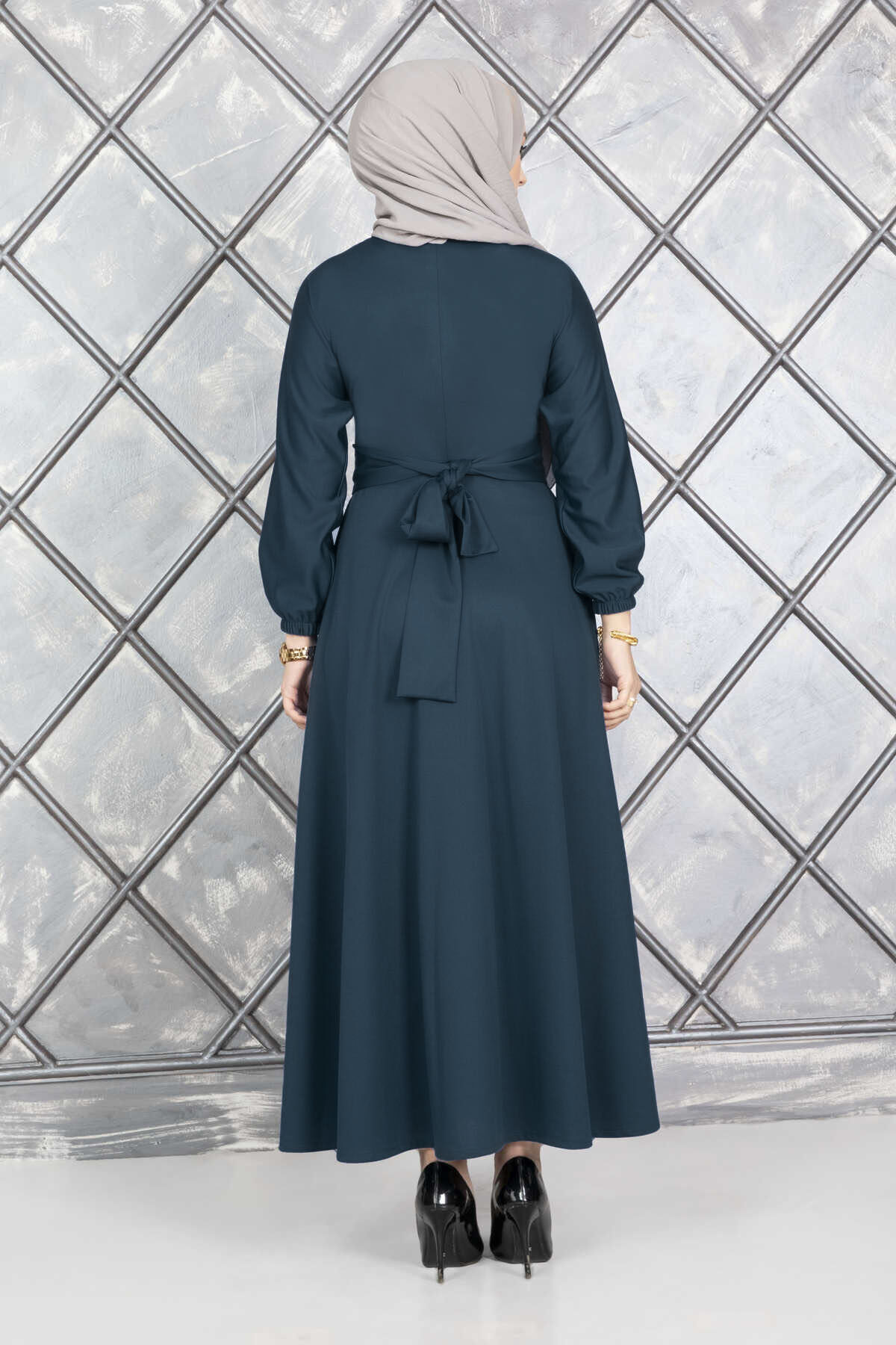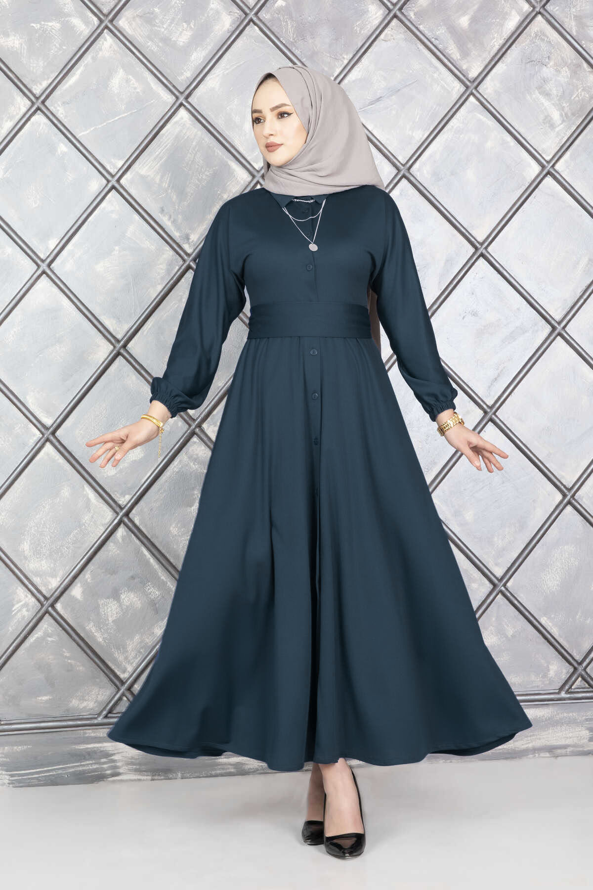 Boydan Düğmeli Kuşaklı Tesettür Elbise Petrol