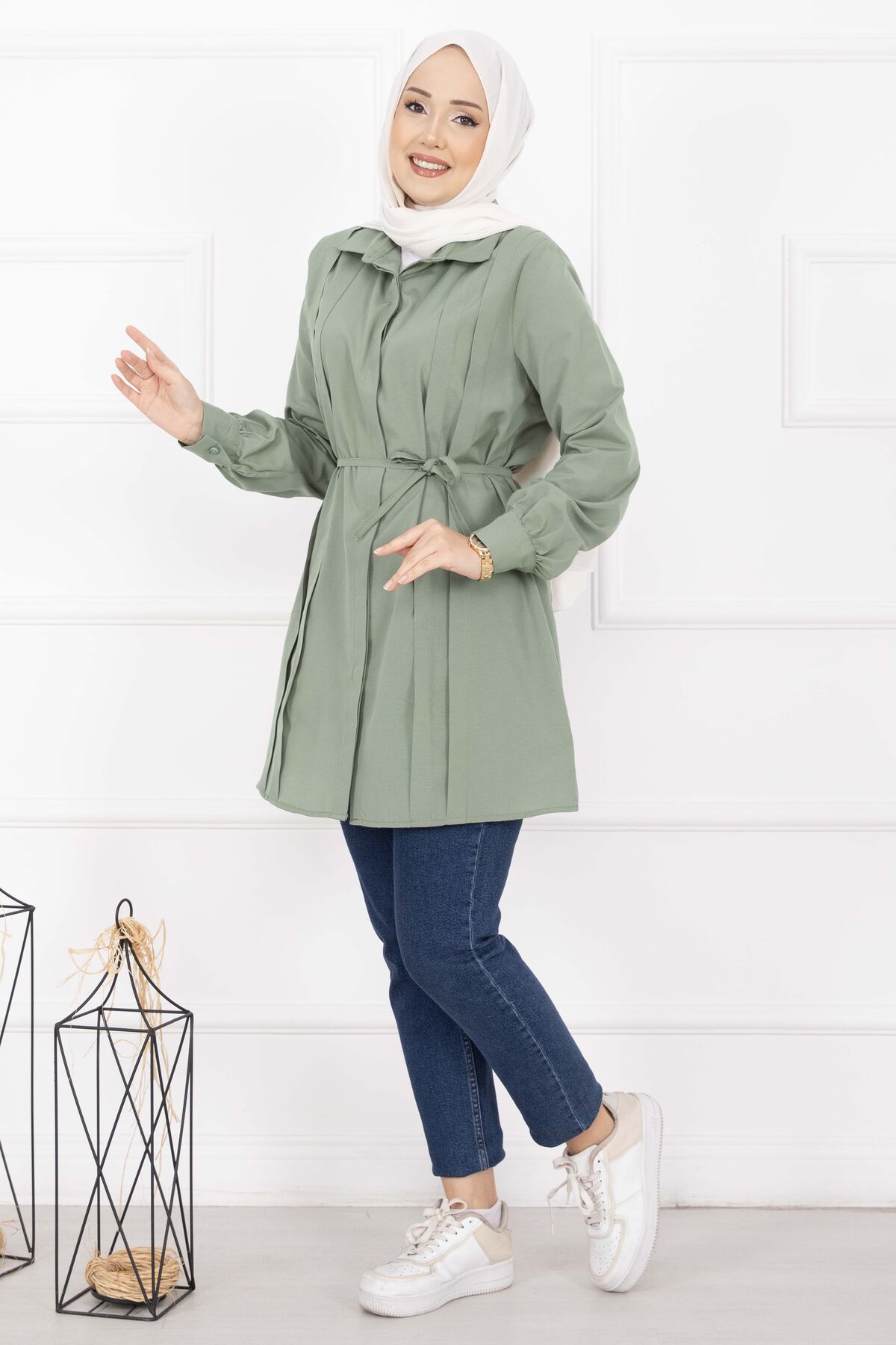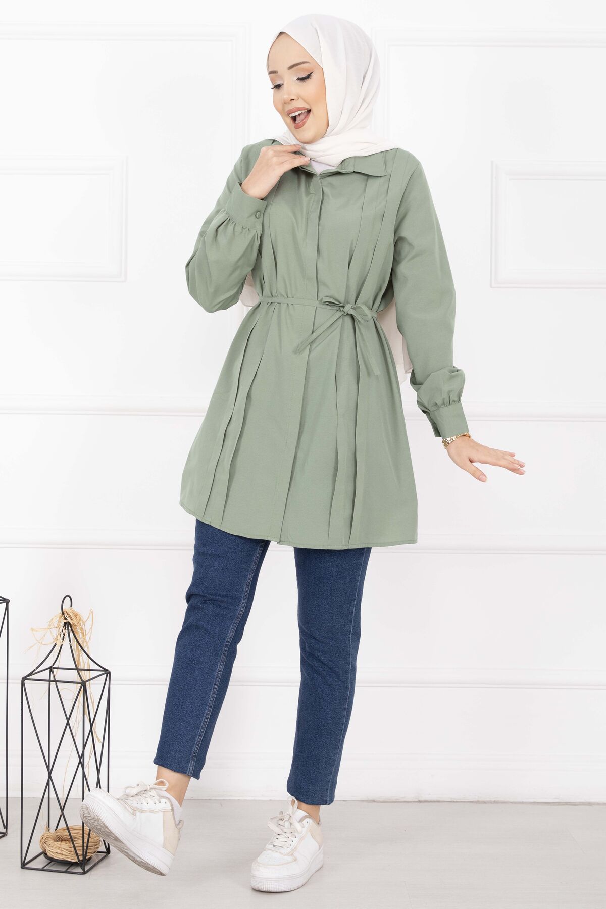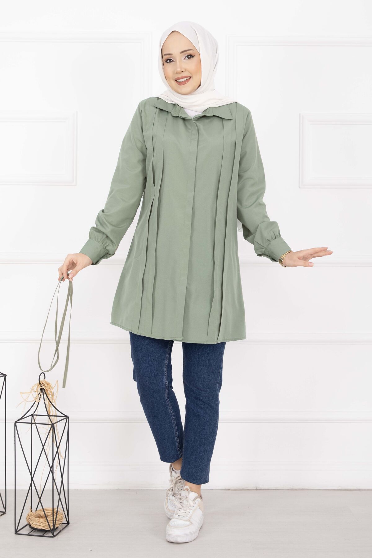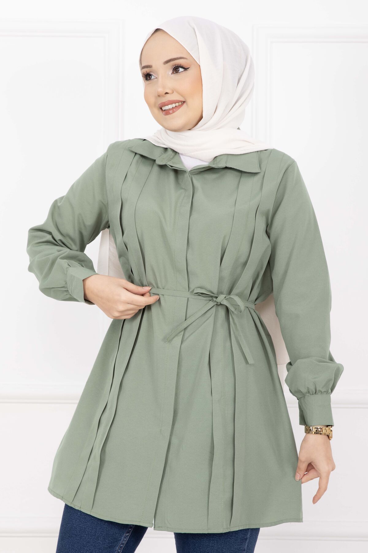 Boydan Gizli Düğmeli Pile Detaylı Tesettür Gömlek Çağla Yeşili