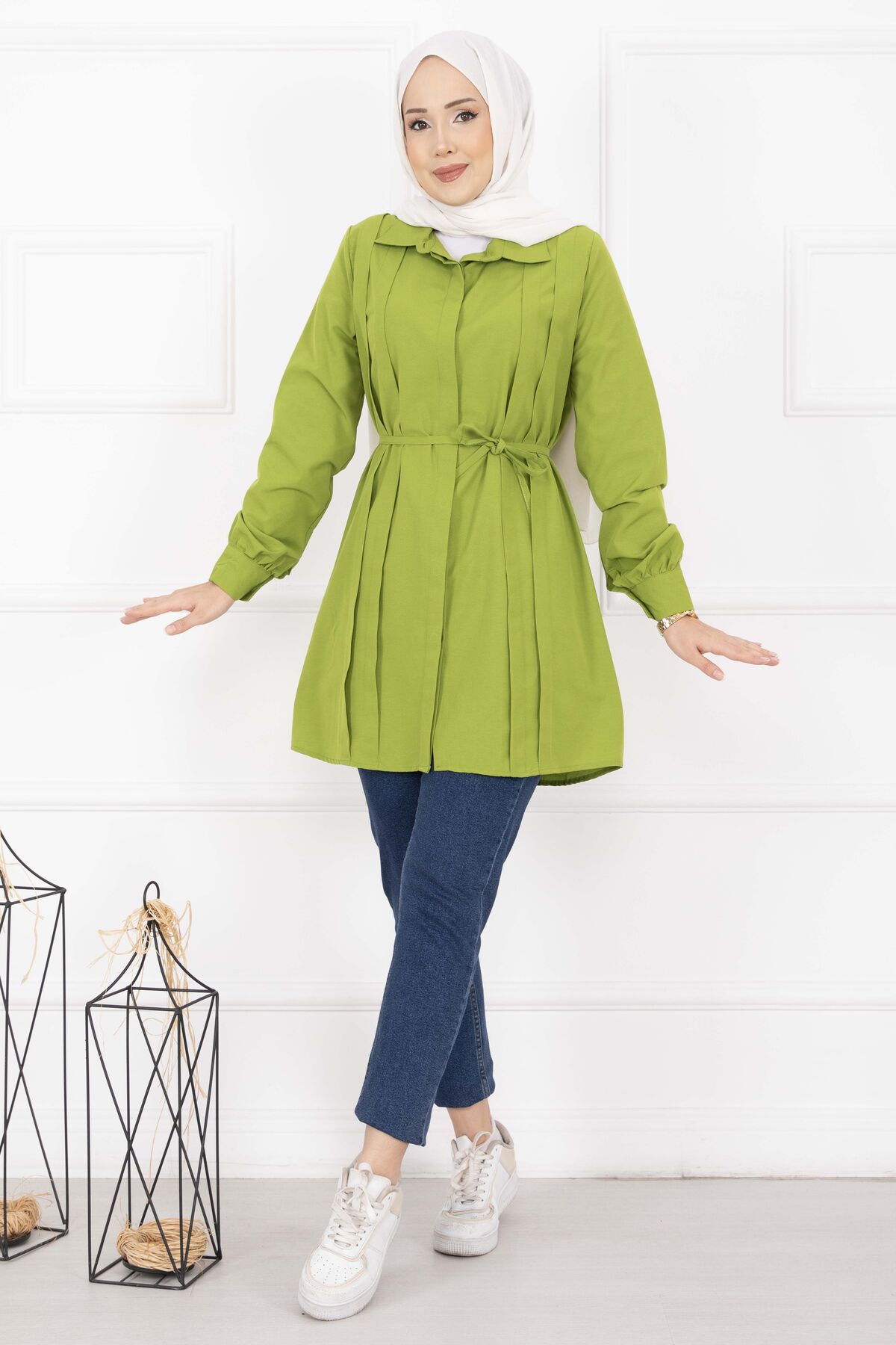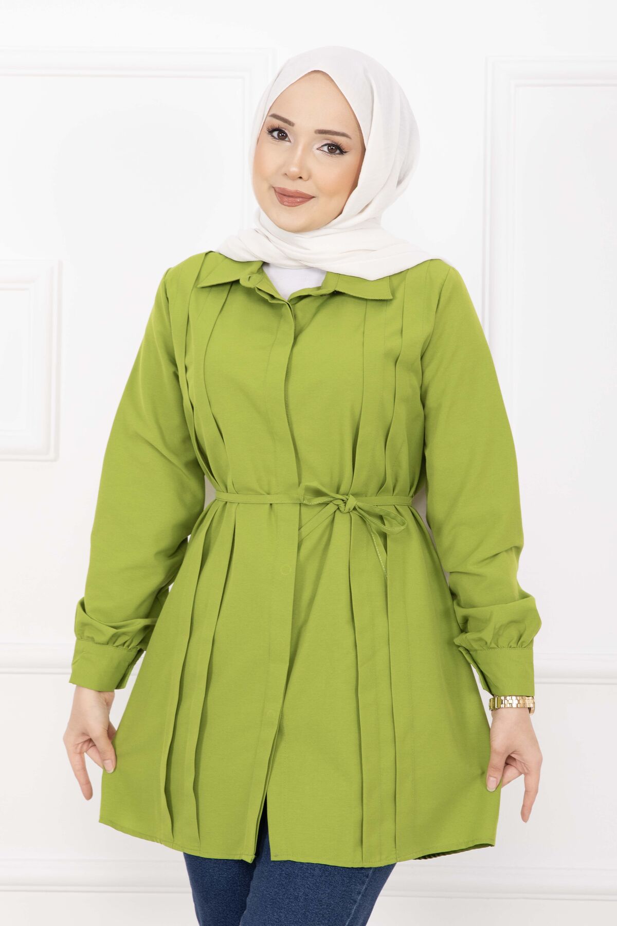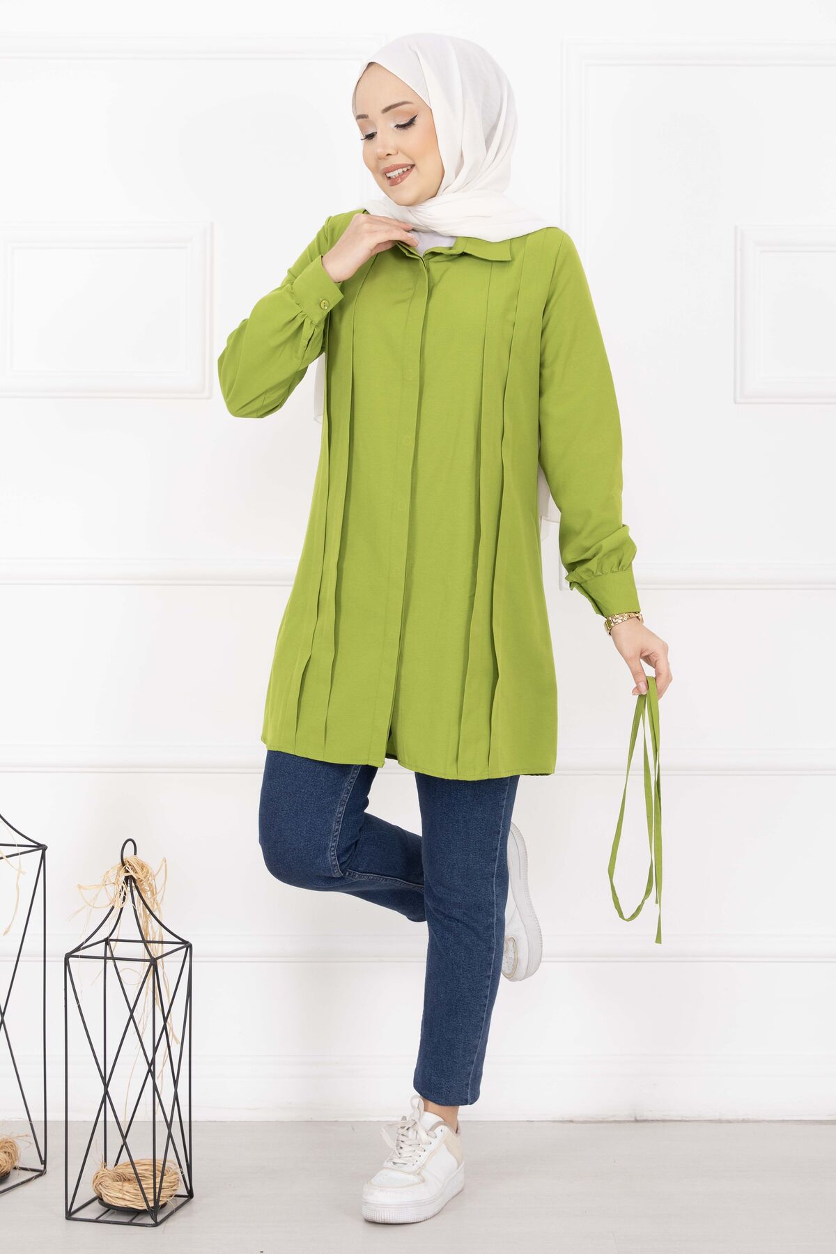 Boydan Gizli Düğmeli Pile Detaylı Tesettür Gömlek Yağ Yeşil