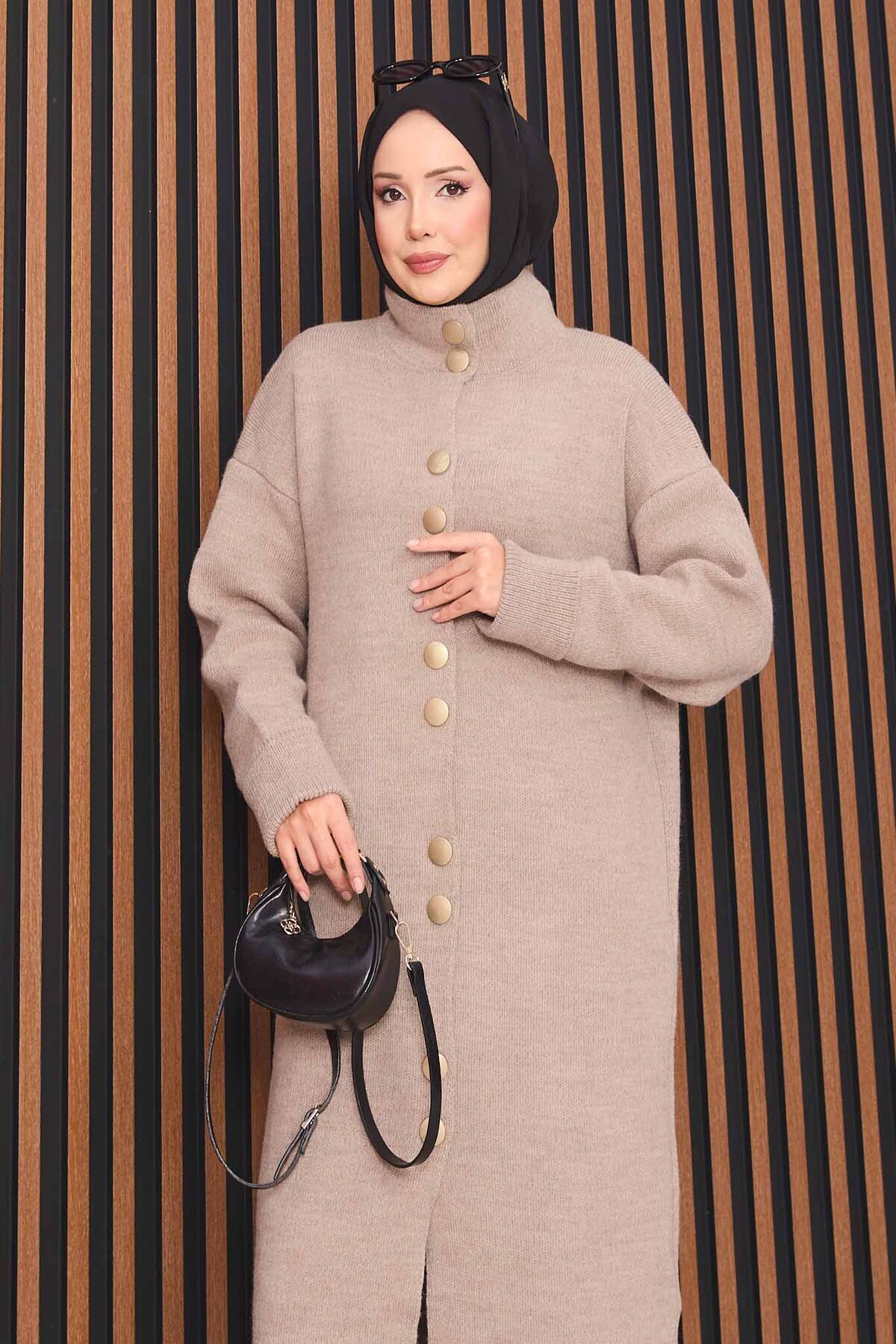 Boydan Gold Düğmeli Tesettür Triko Hırka Vizon