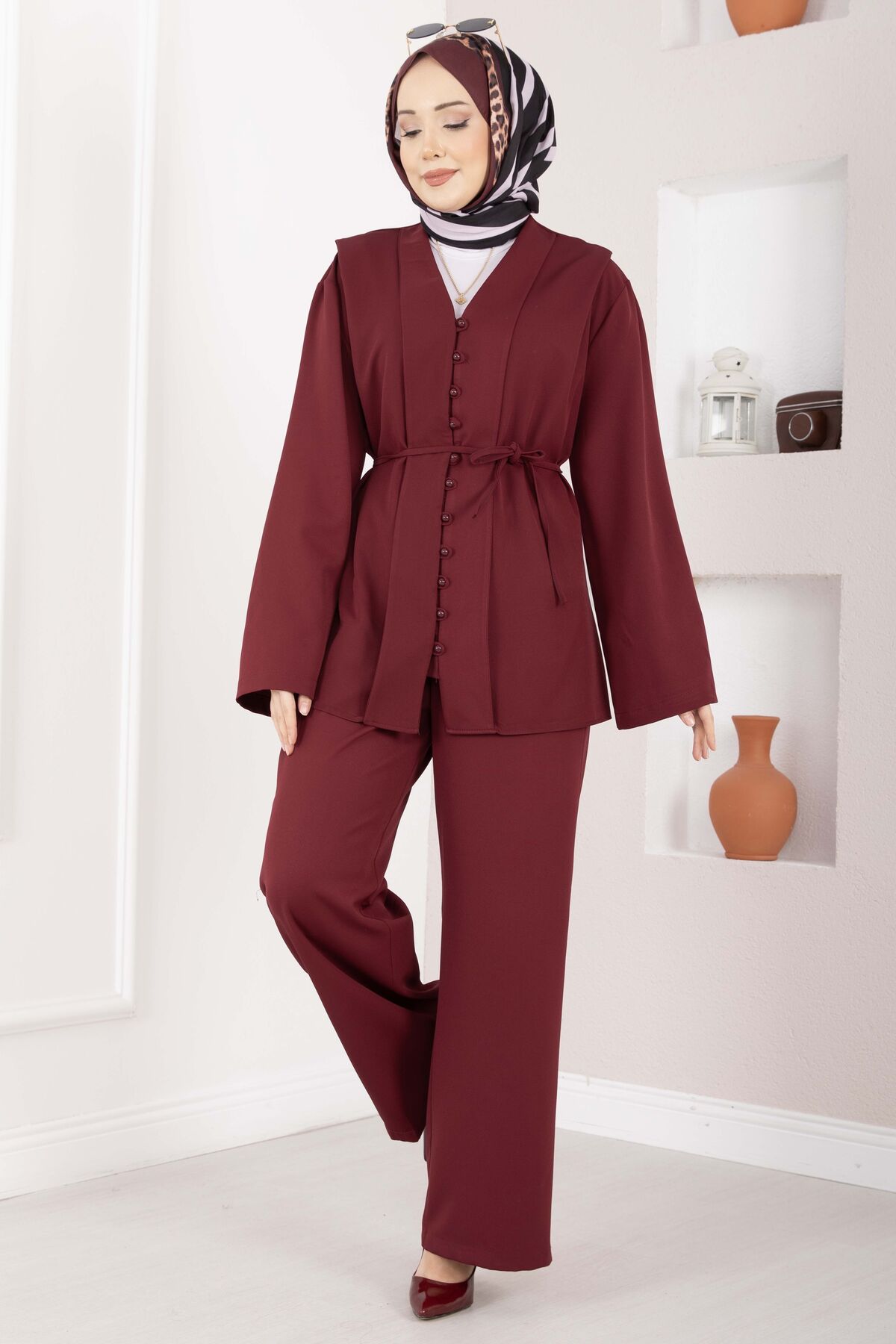 Brit Düğmeli Kuşaklı İkili Takım Bordo
