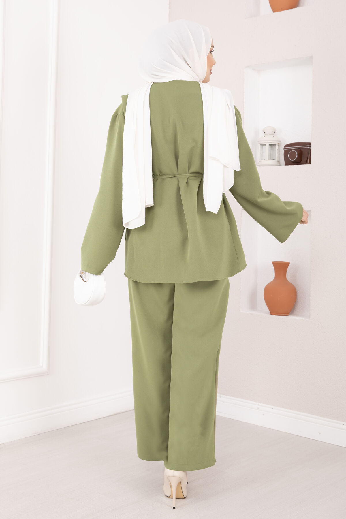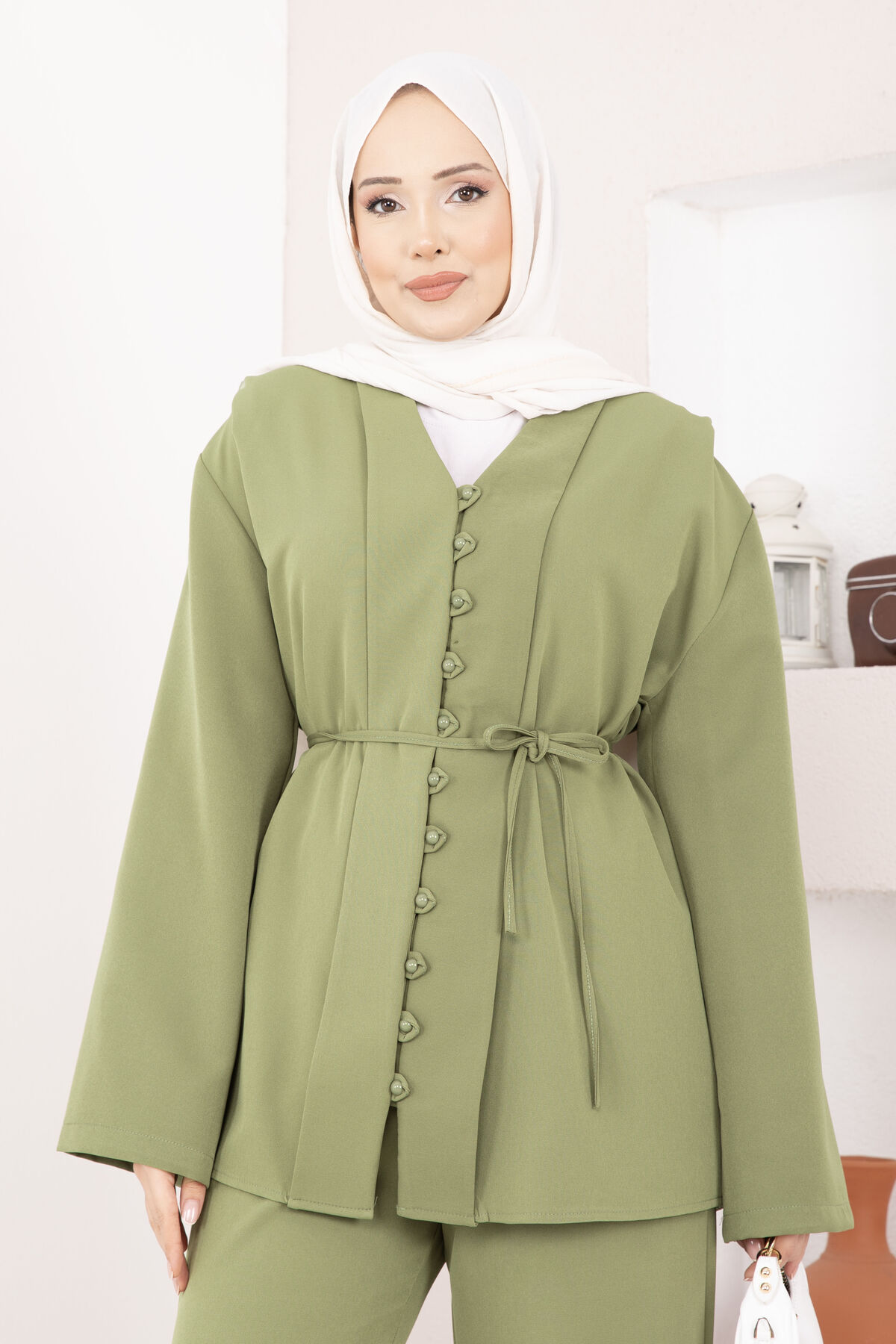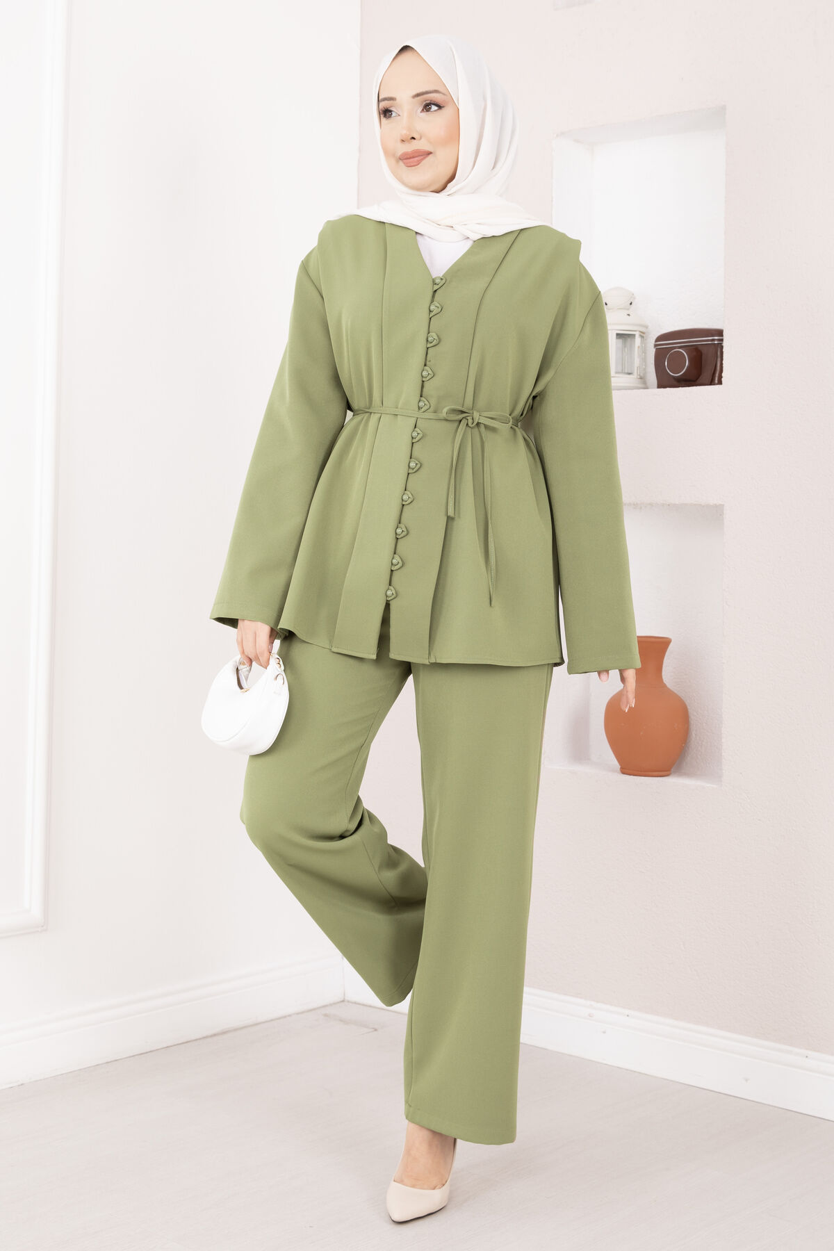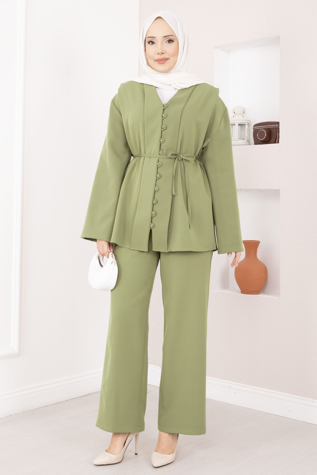 Brit Düğmeli Kuşaklı İkili Takım Haki