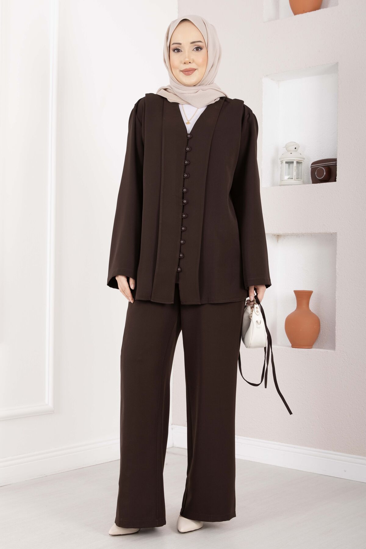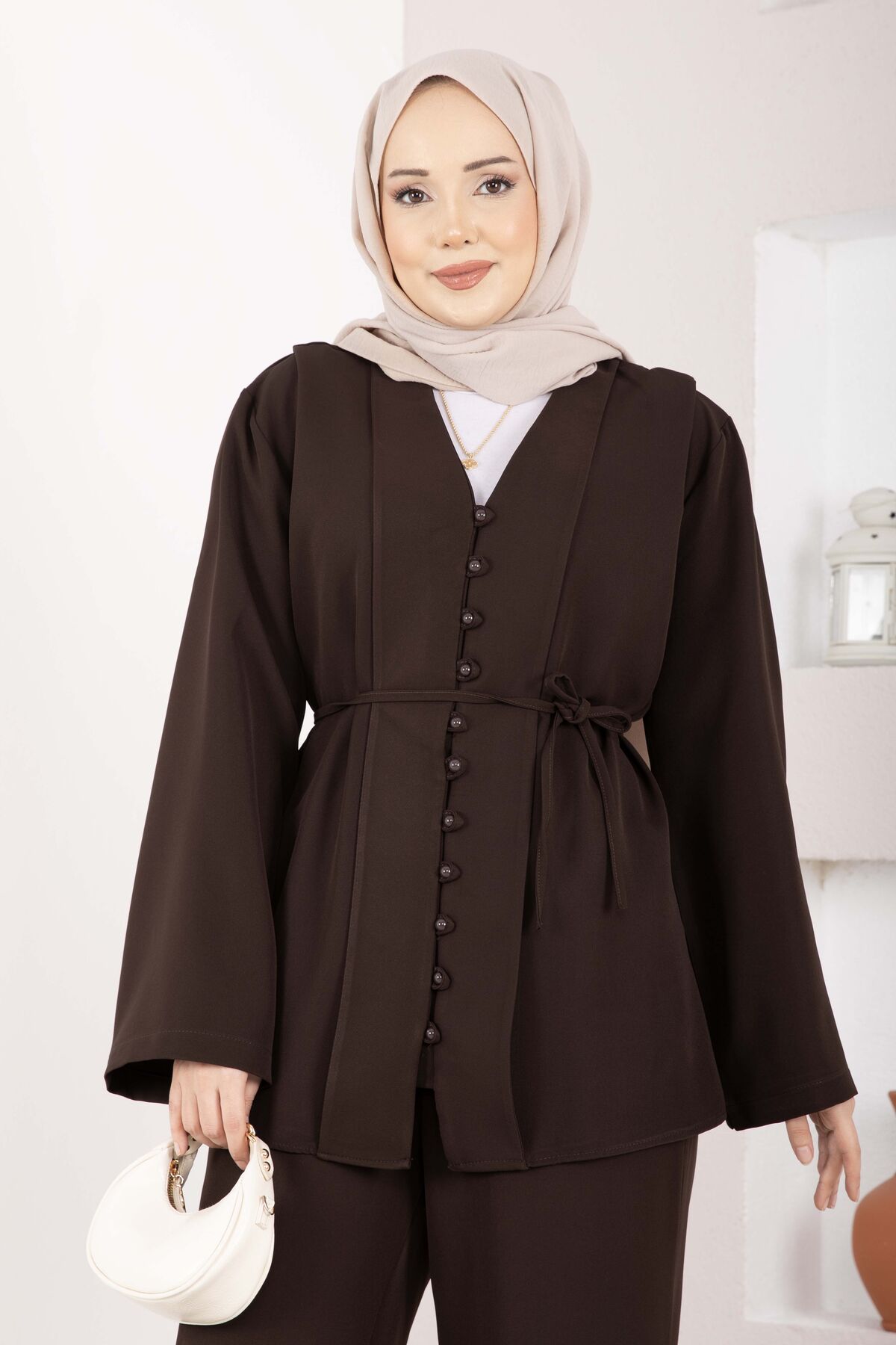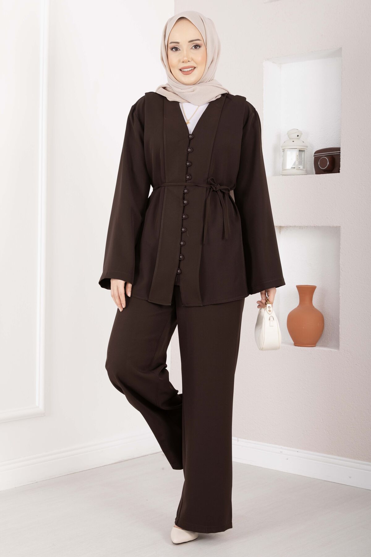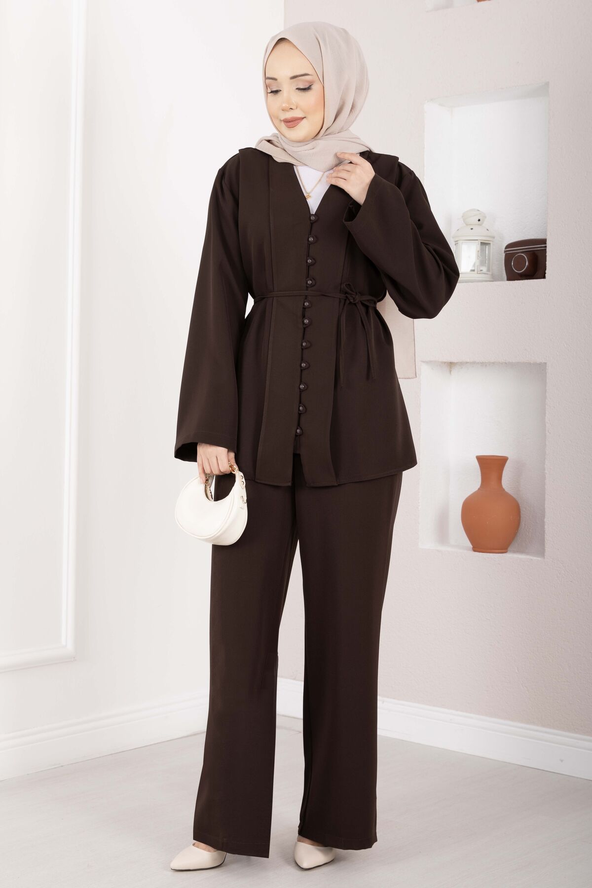 Brit Düğmeli Kuşaklı İkili Takım Kahve