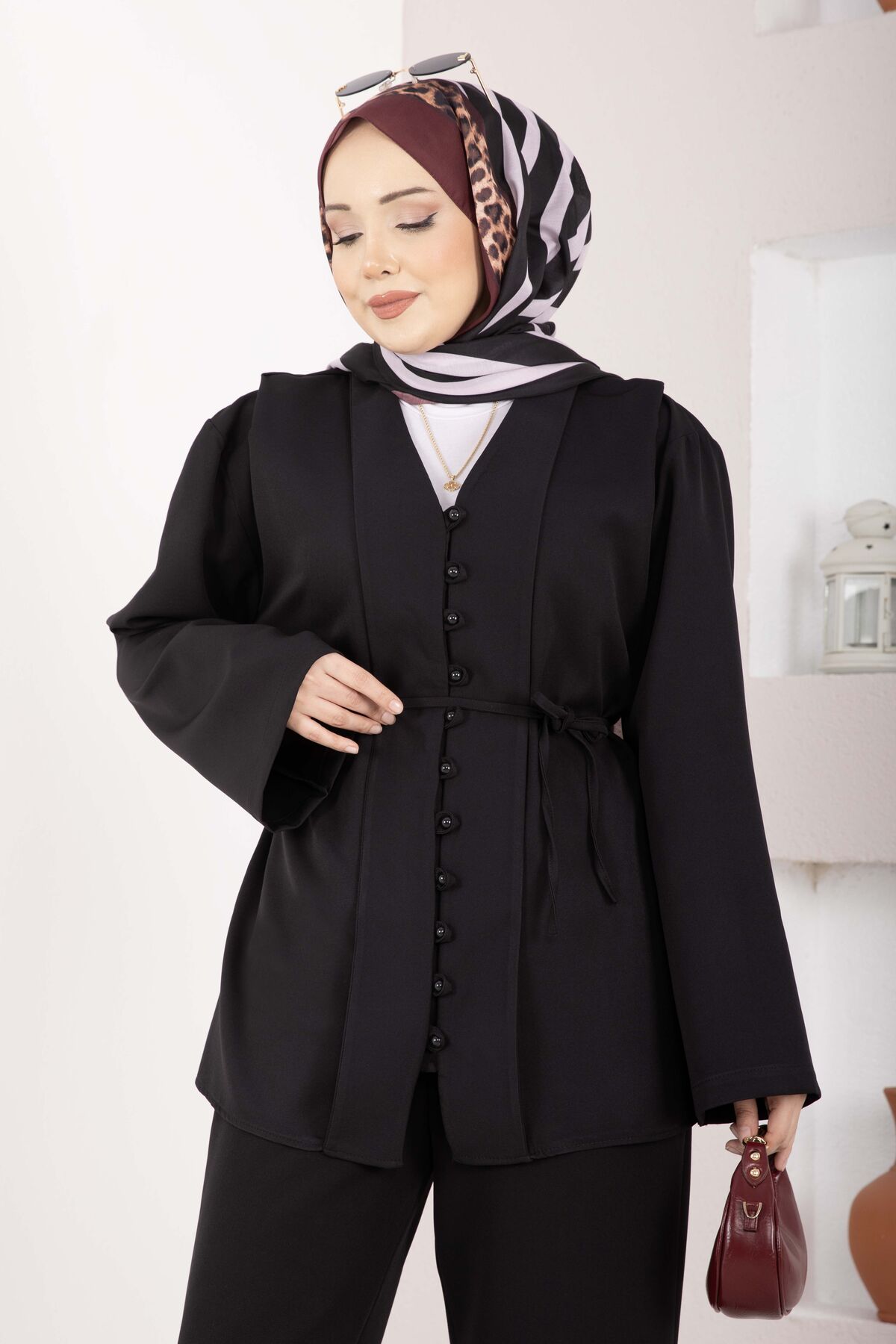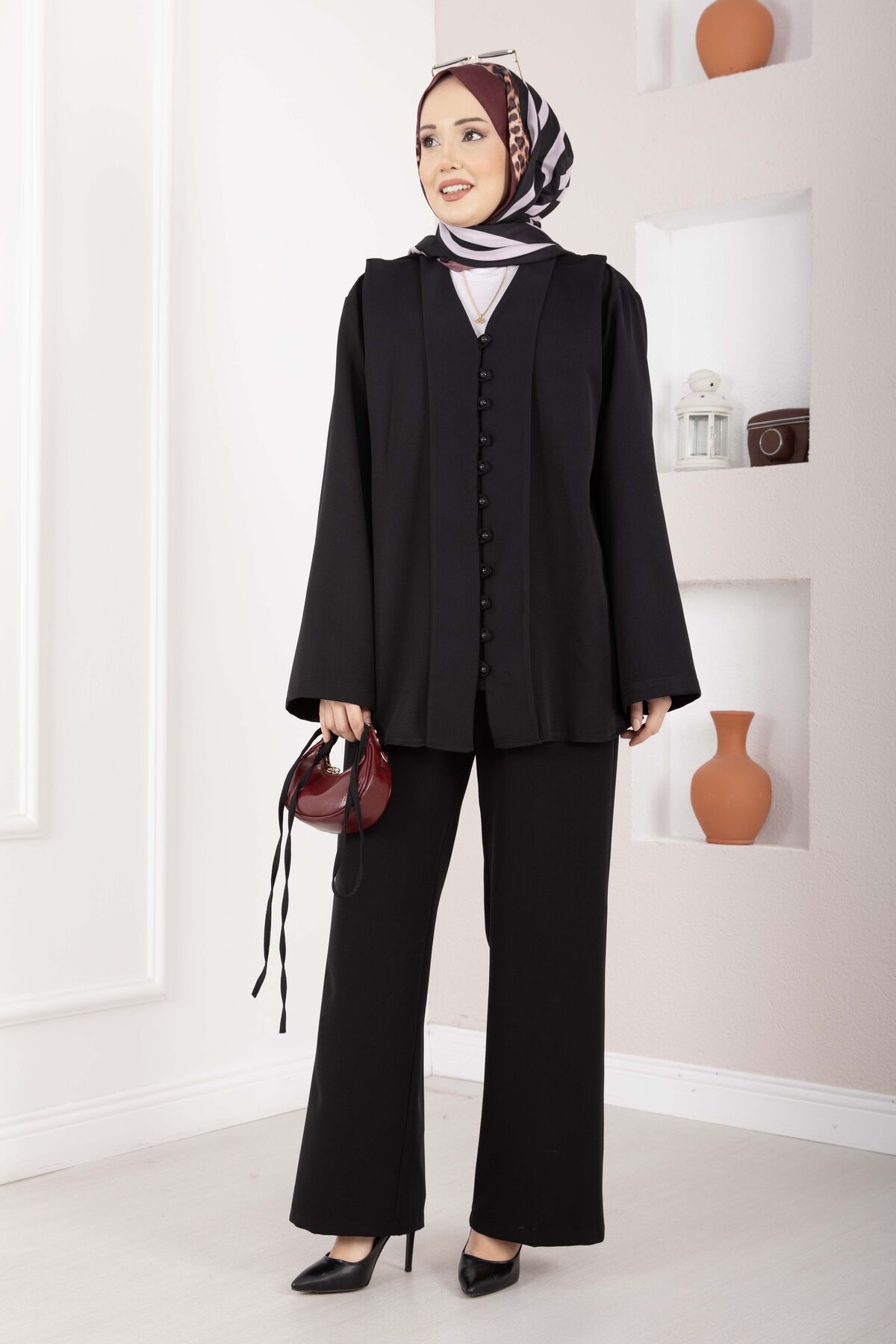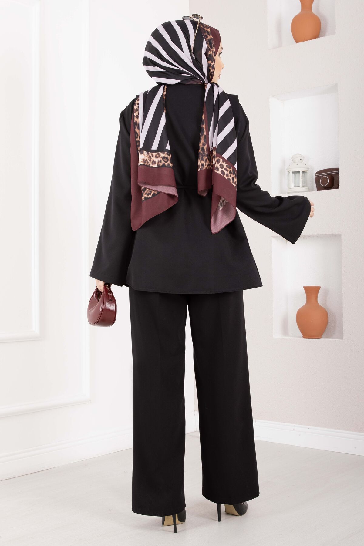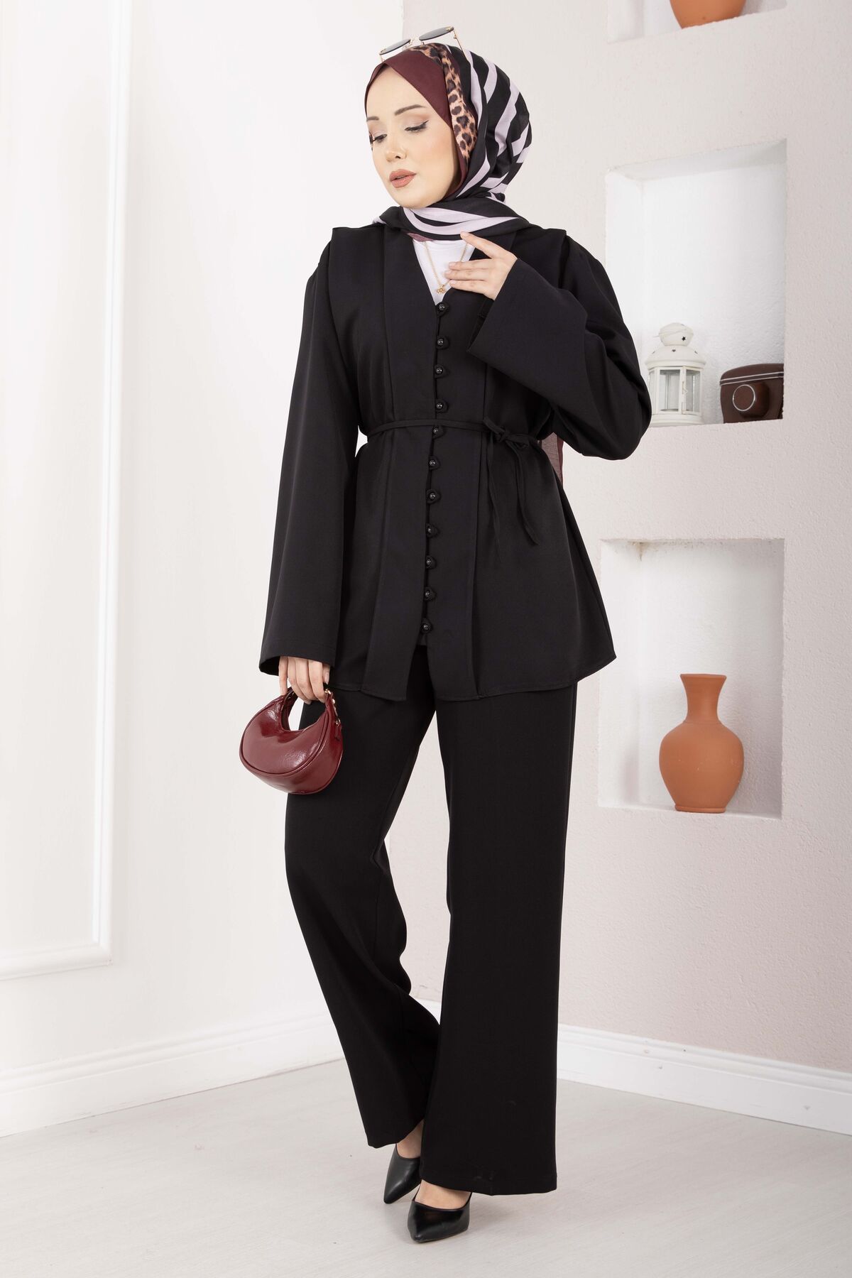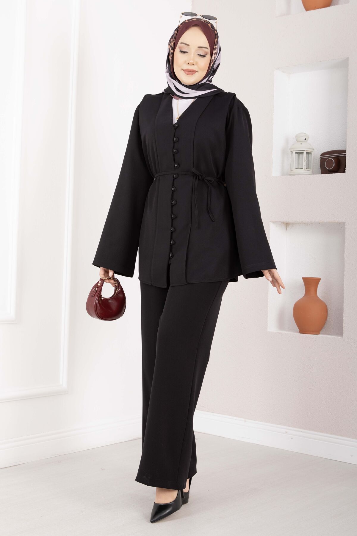 Brit Düğmeli Kuşaklı İkili Takım Siyah