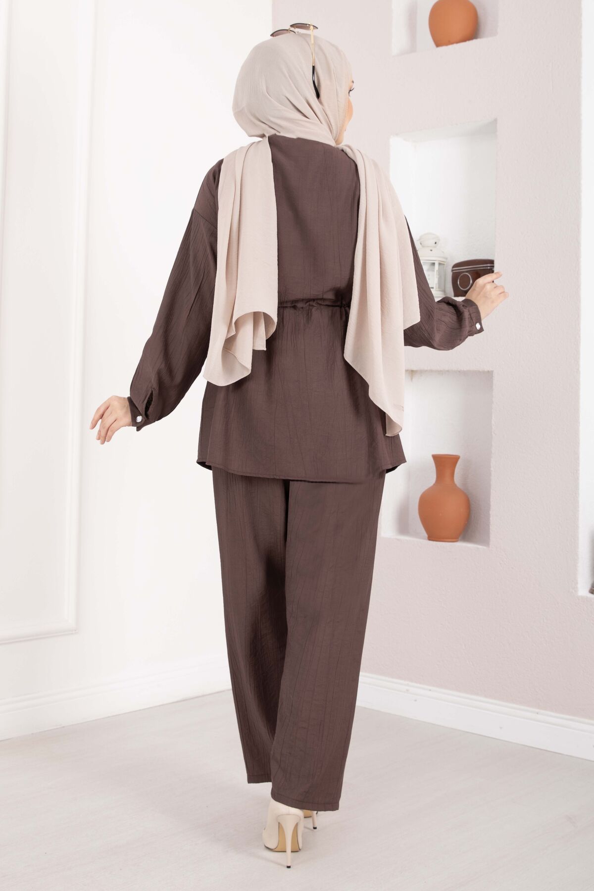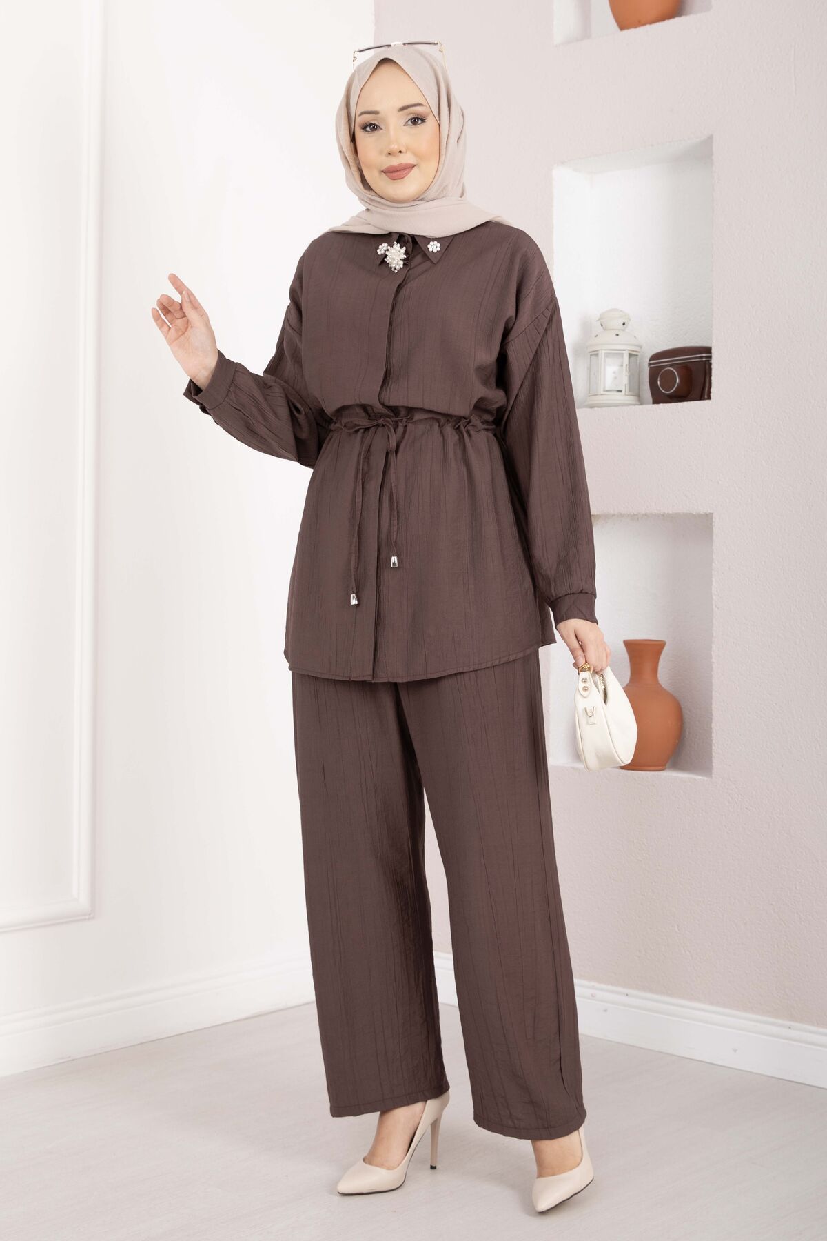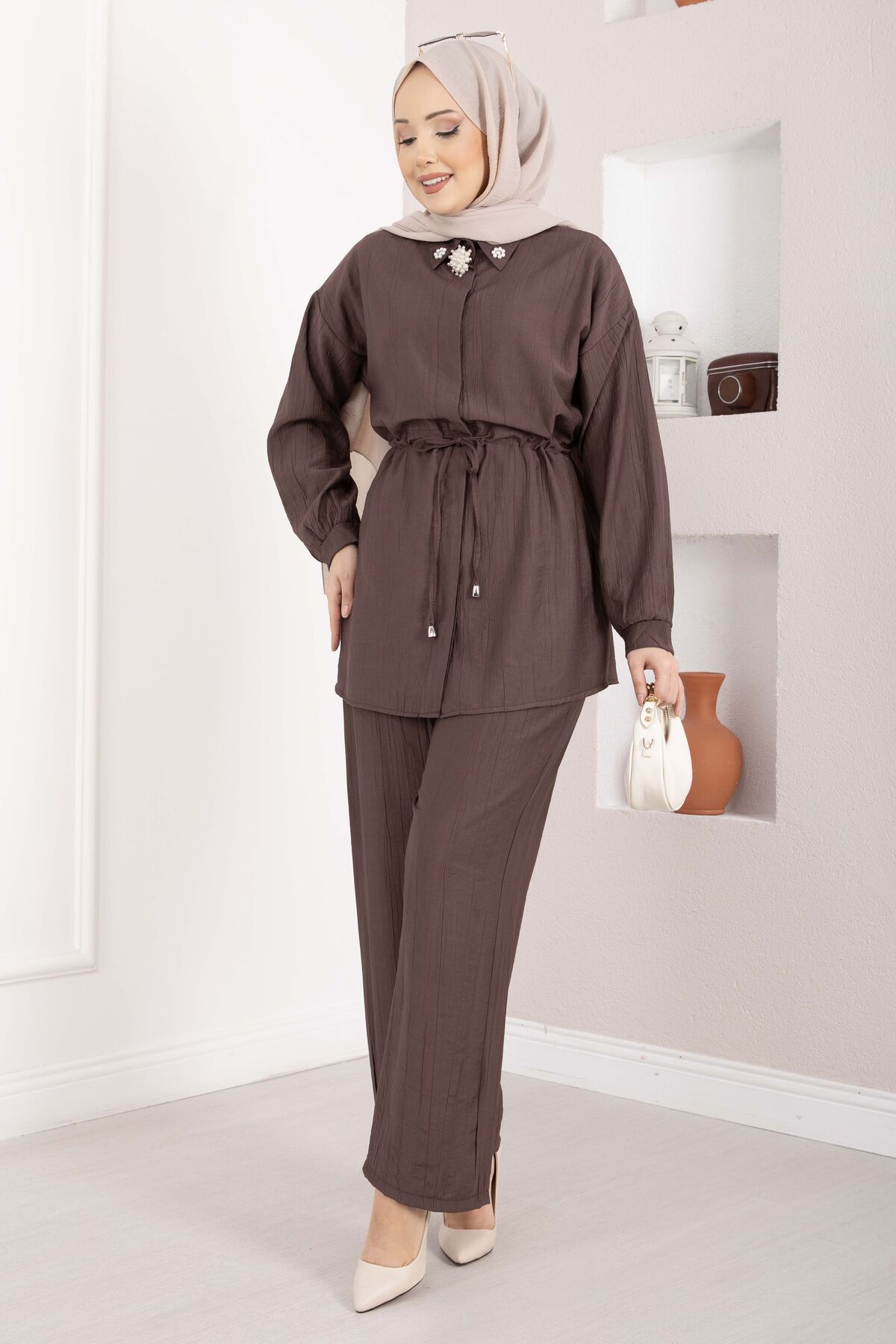 Broş Detaylı Beli Tünelli Tunik Takım Kahve