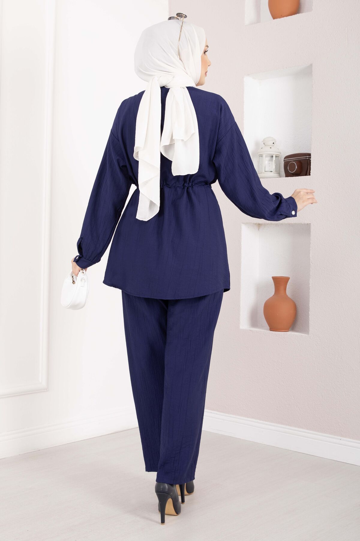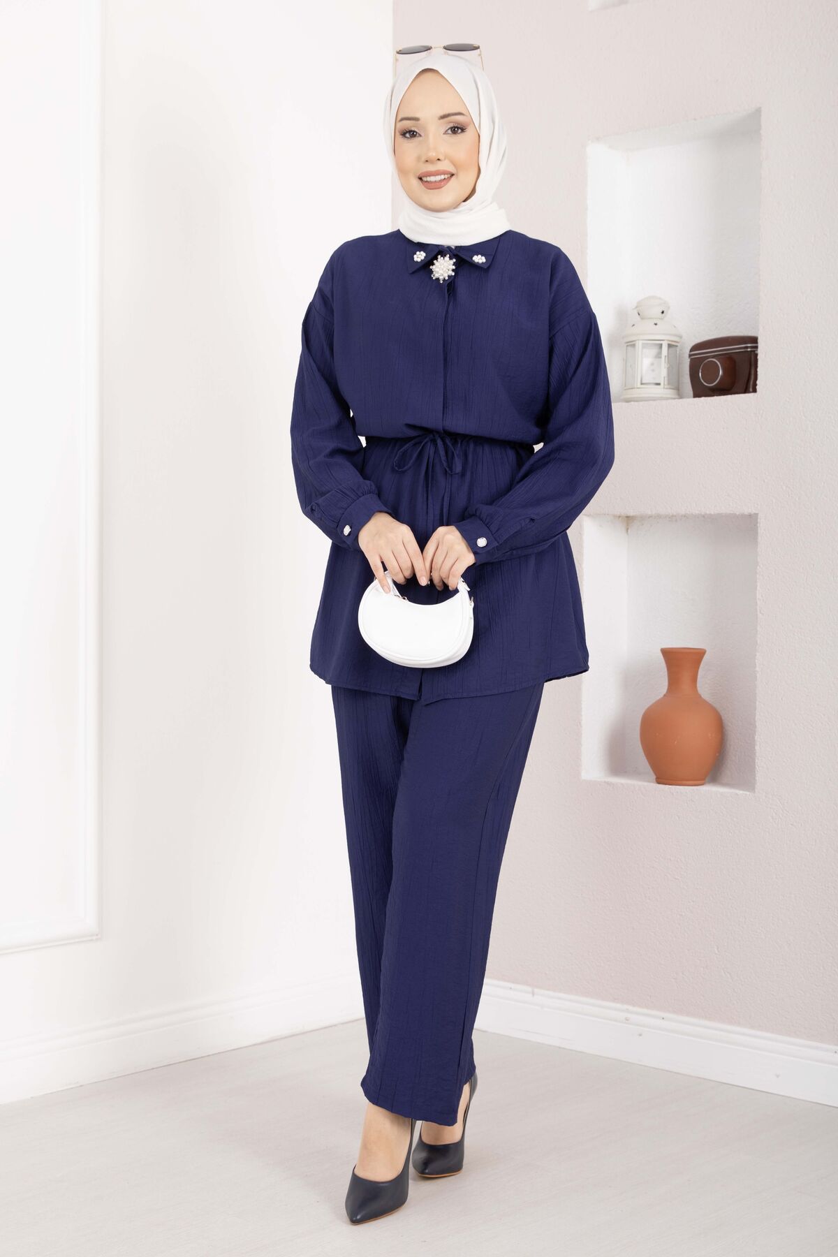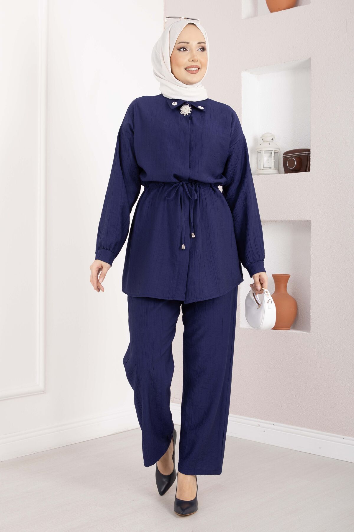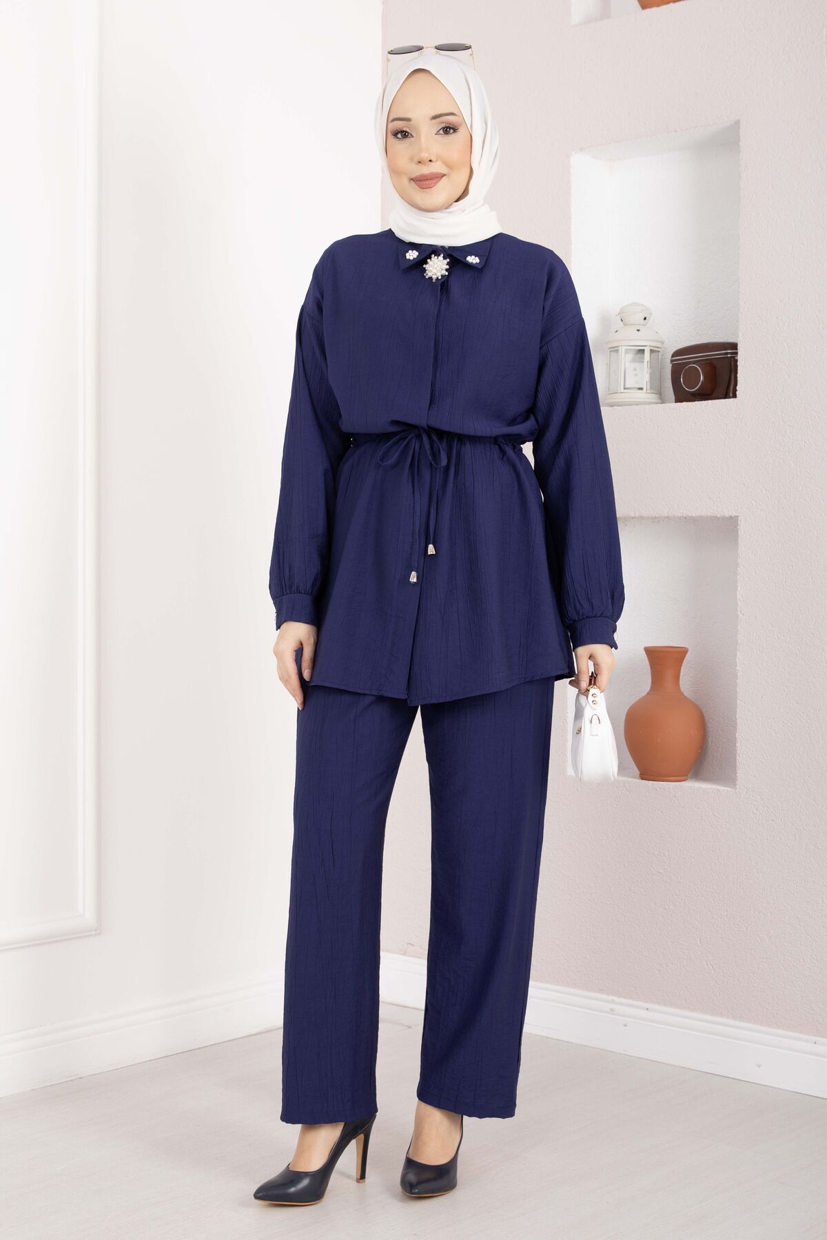 Broş Detaylı Beli Tünelli Tunik Takım Lacivert