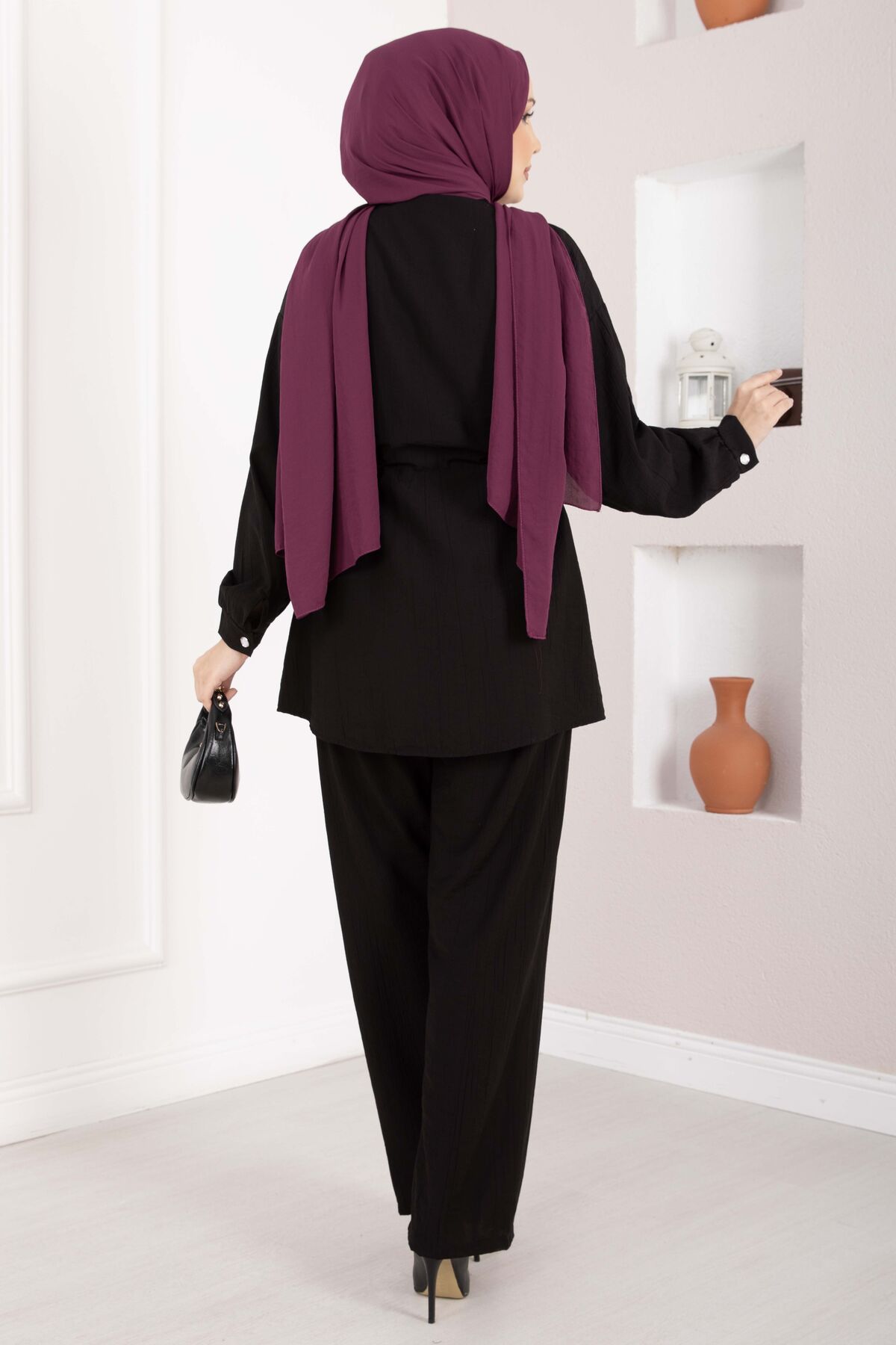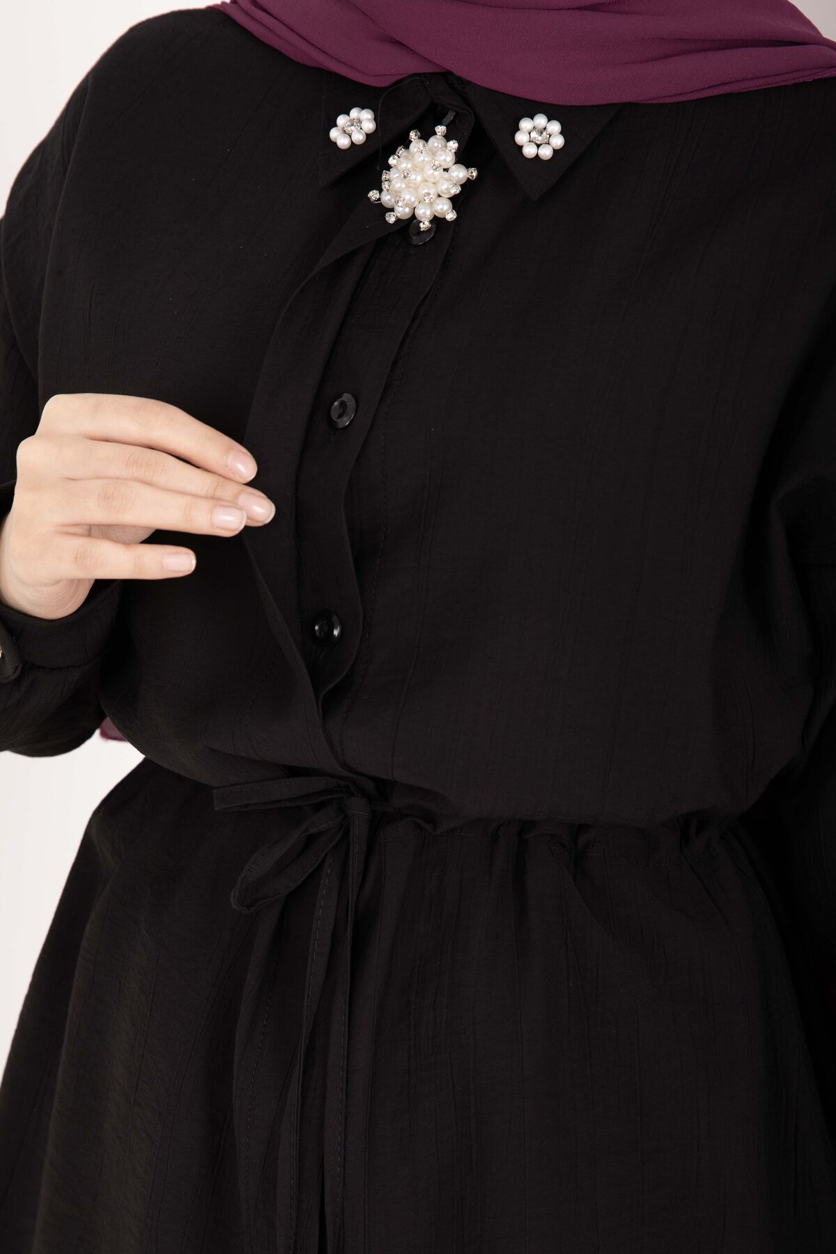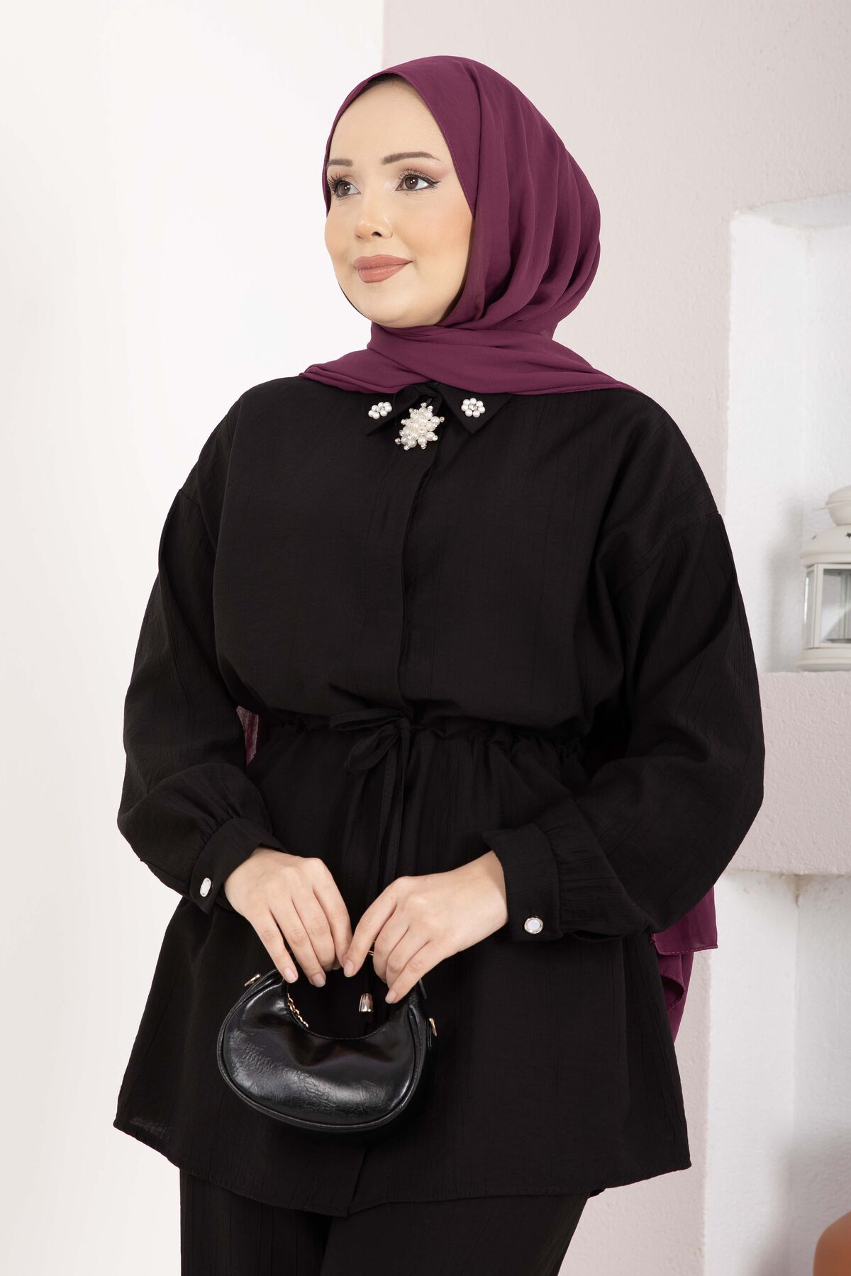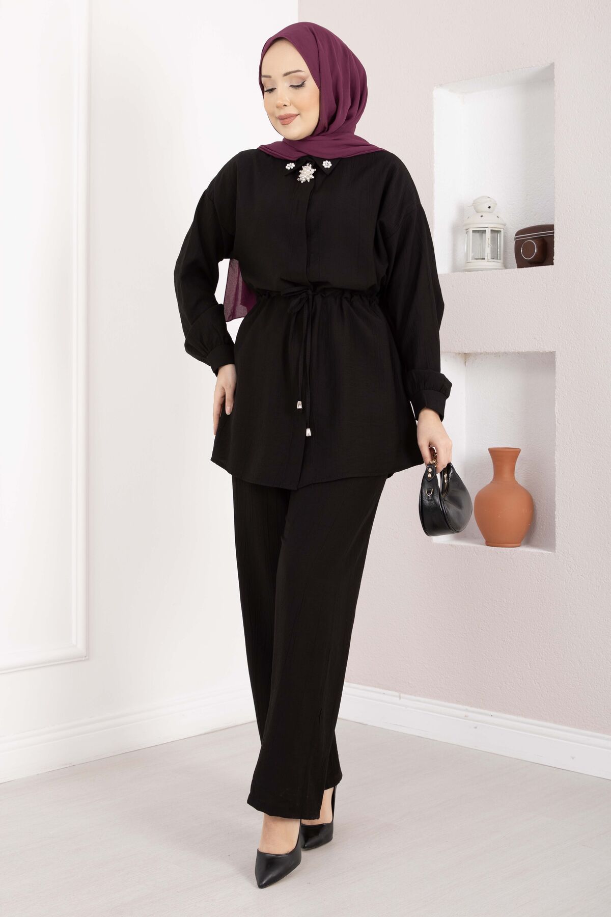Broş Detaylı Beli Tünelli Tunik Takım Siyah
