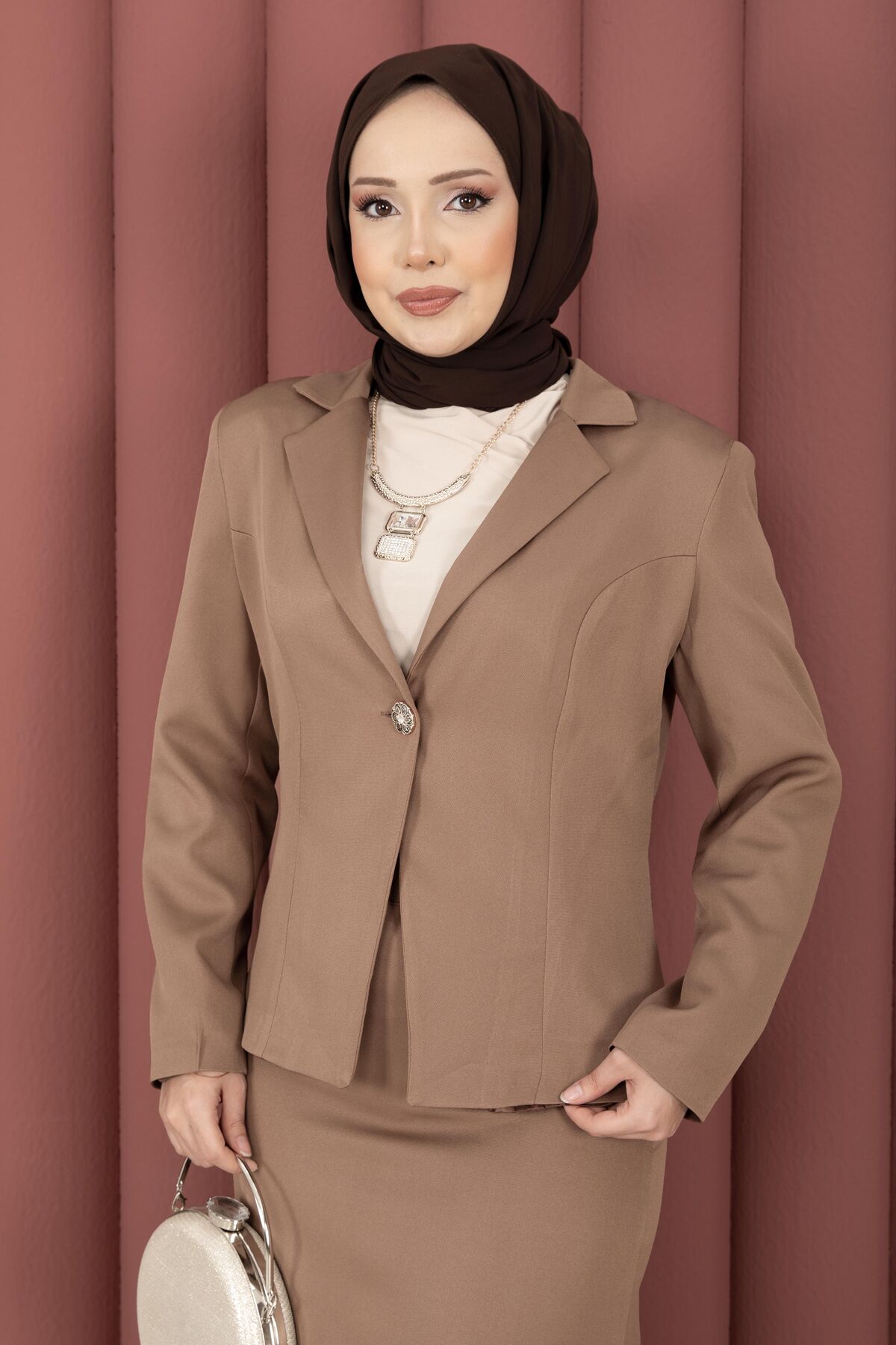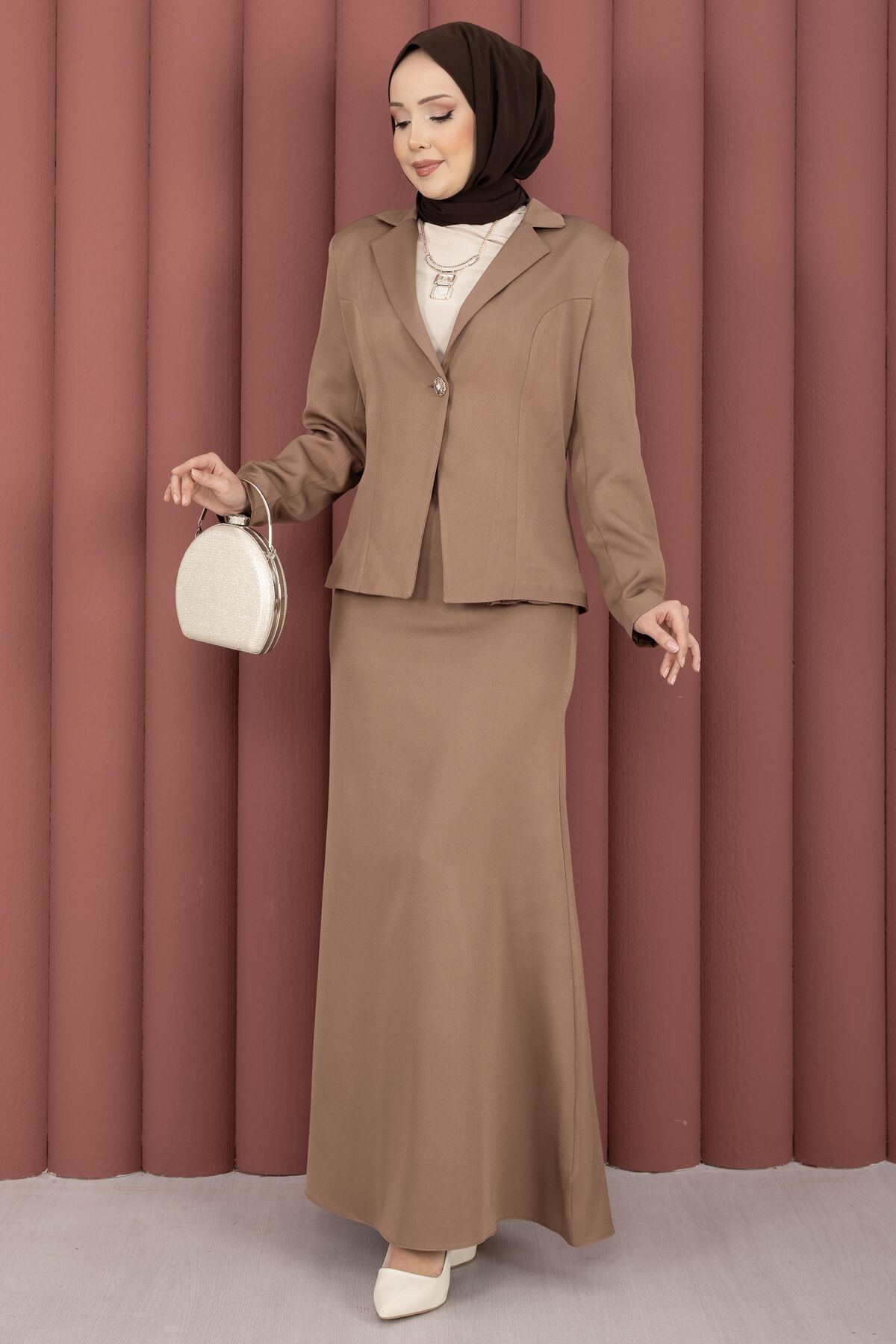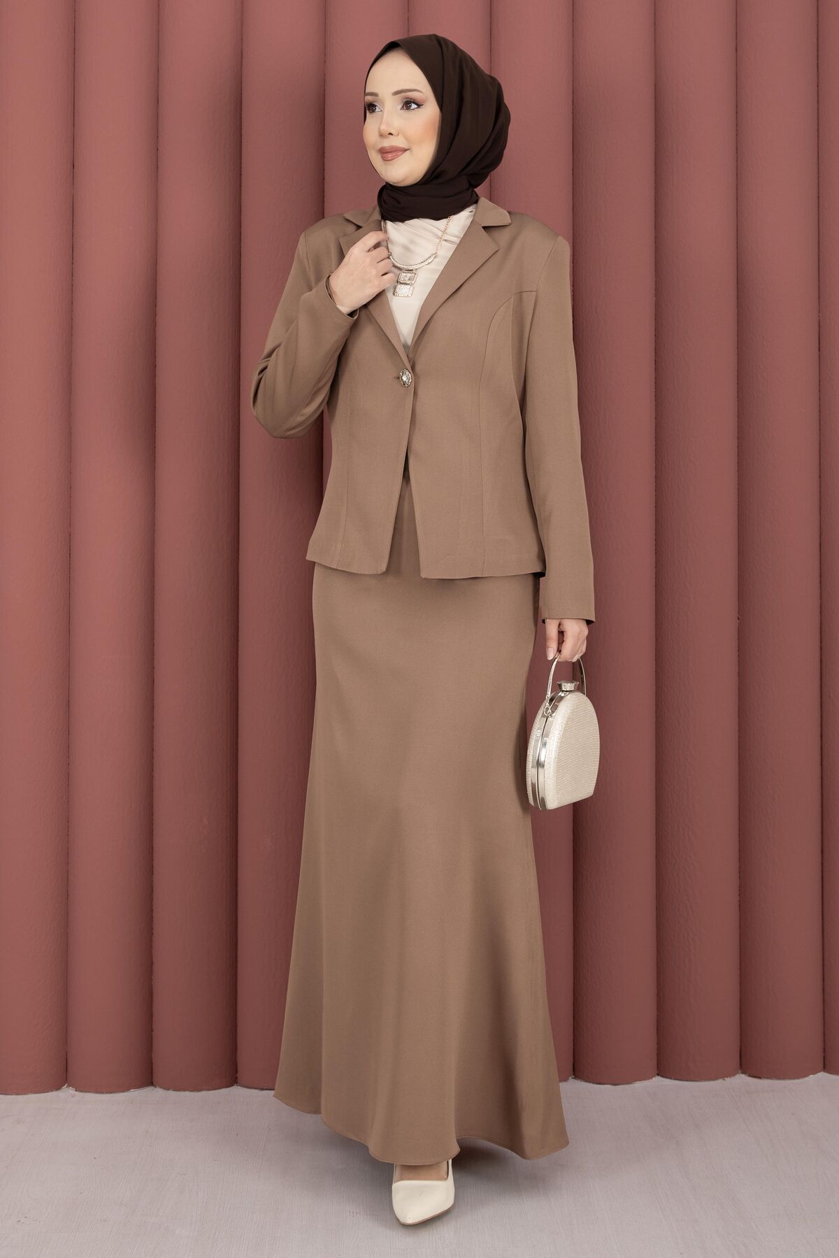 Tek düğmeli blazer ceket, bele oturan ceket formu, içi astarlı yapı, balık form etek, etek beli fermuarlıdır. Ceket ve etekten oluşan ikili takımdır.