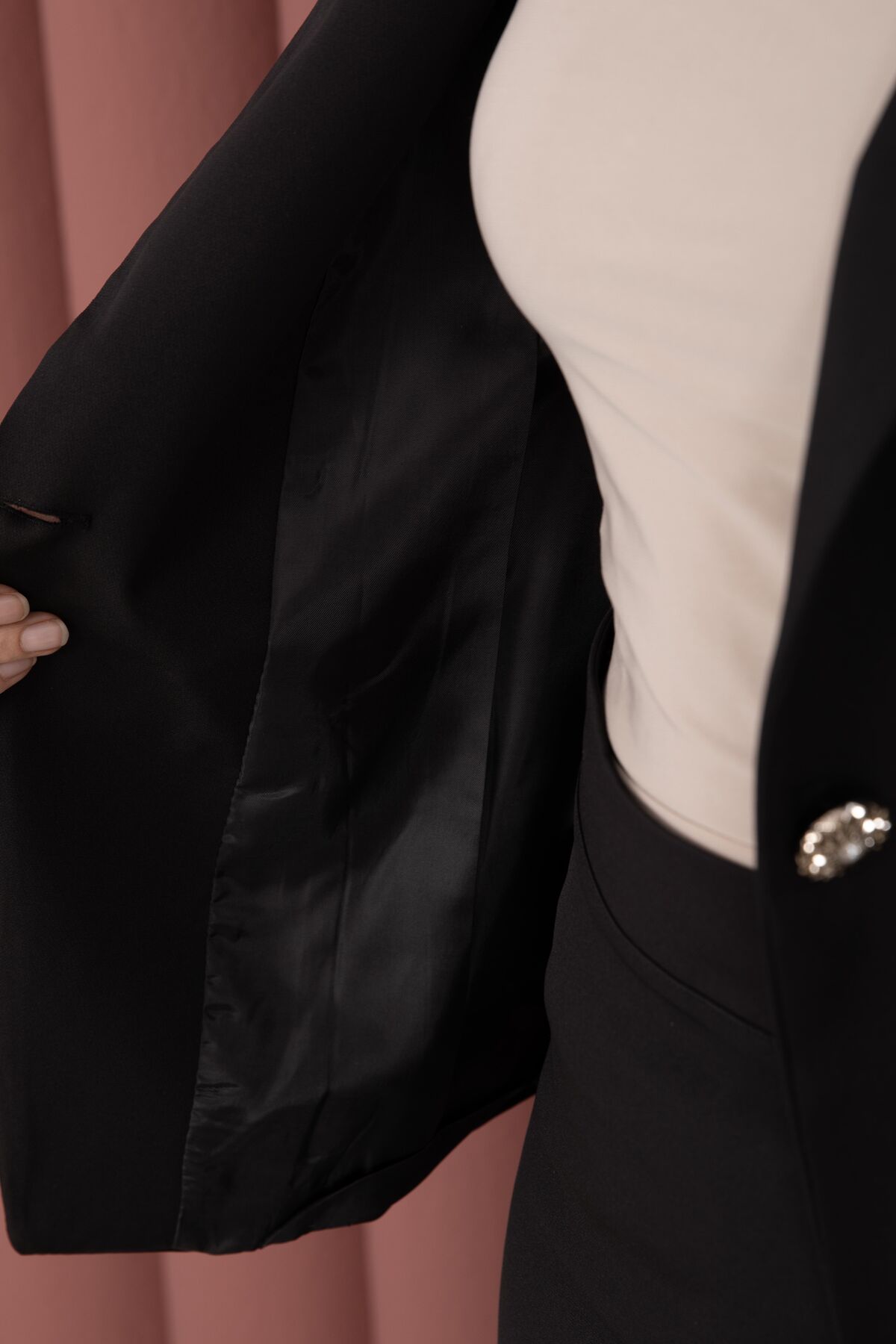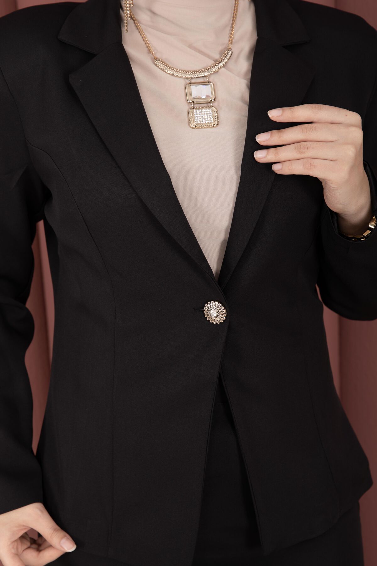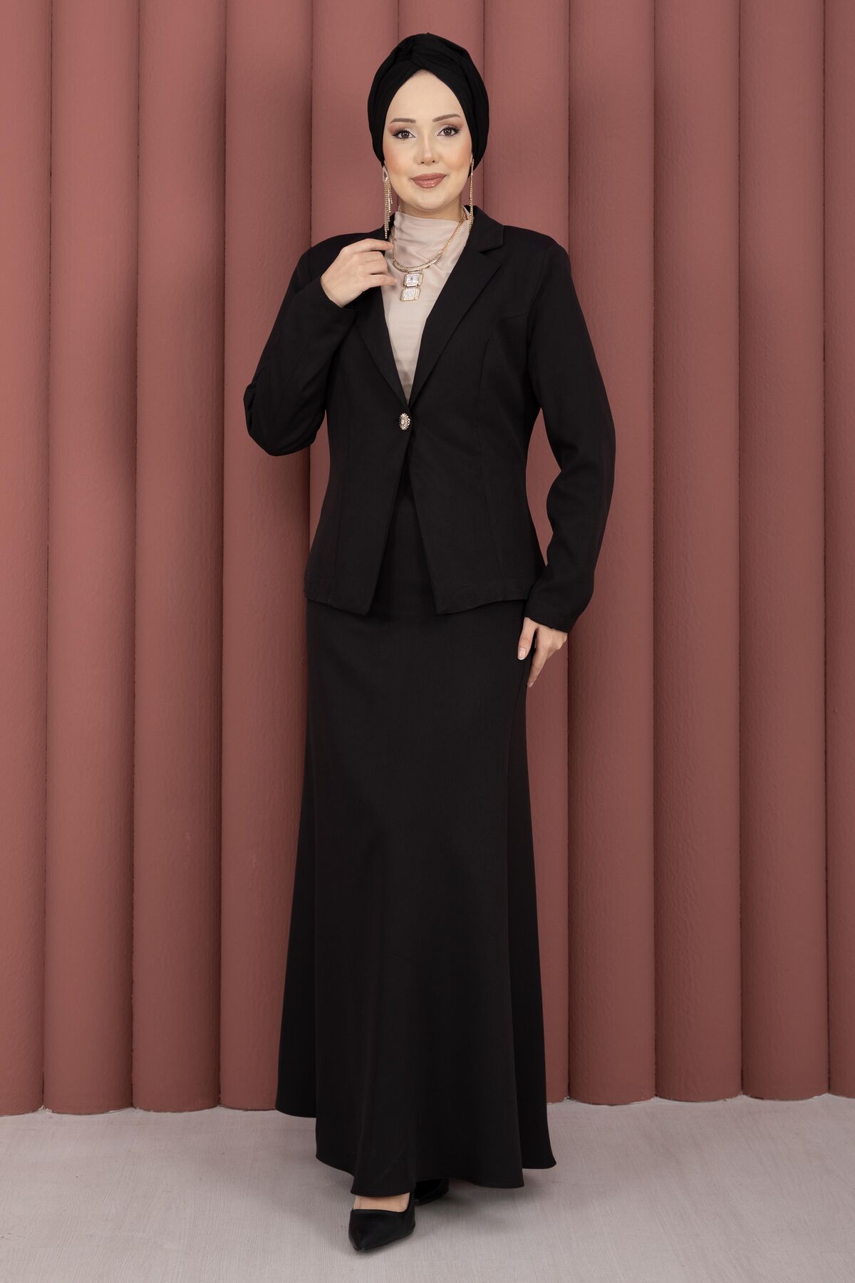 Tek düğmeli blazer ceket, bele oturan ceket formu, içi astarlı yapı, balık form etek, etek beli fermuarlıdır. Ceket ve etekten oluşan ikili takımdır.