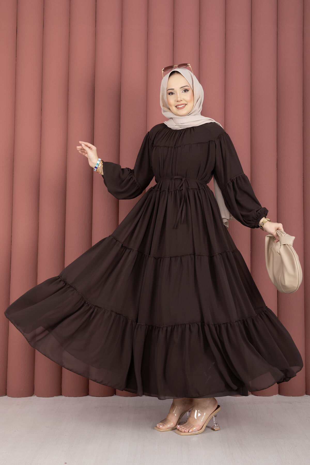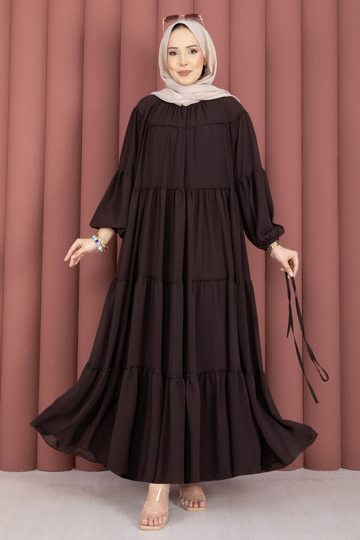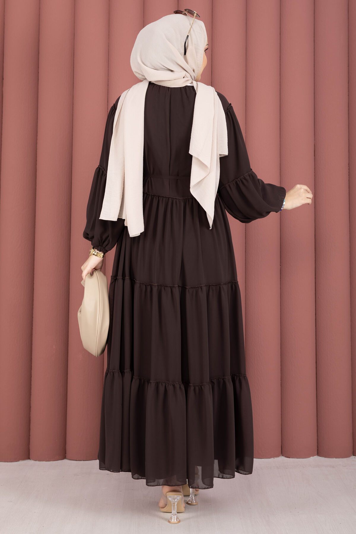 Büzgü Detaylı Kat Kat Elbise Kahve