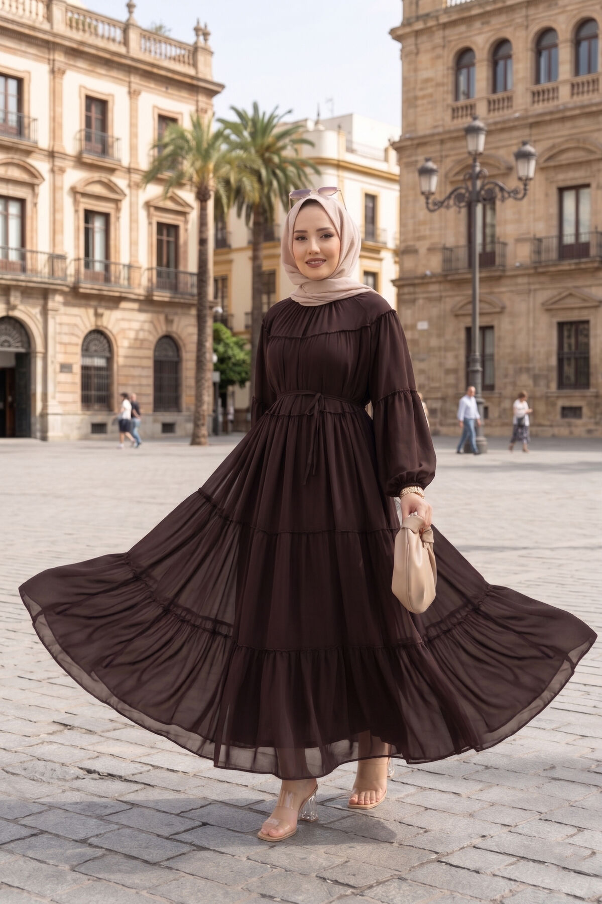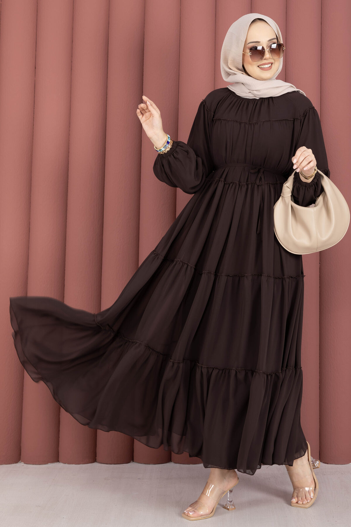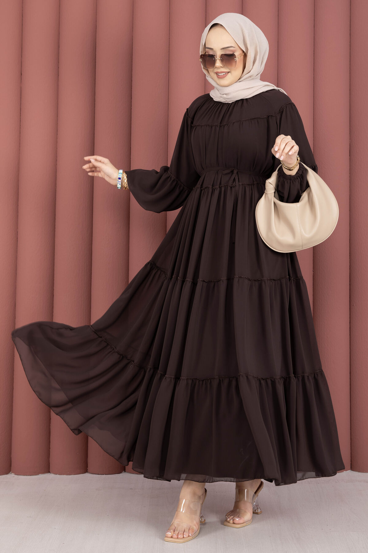 Büzgü Detaylı Kat Kat Elbise Kahve