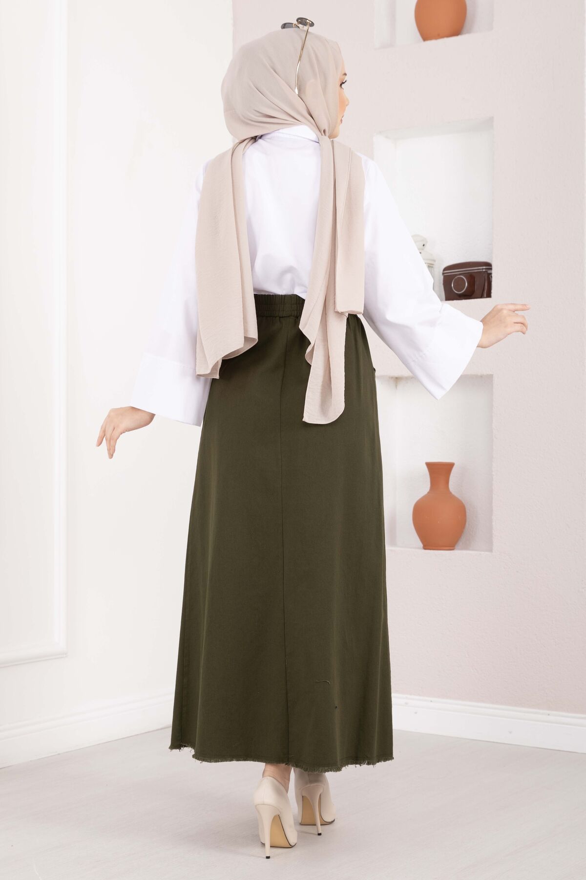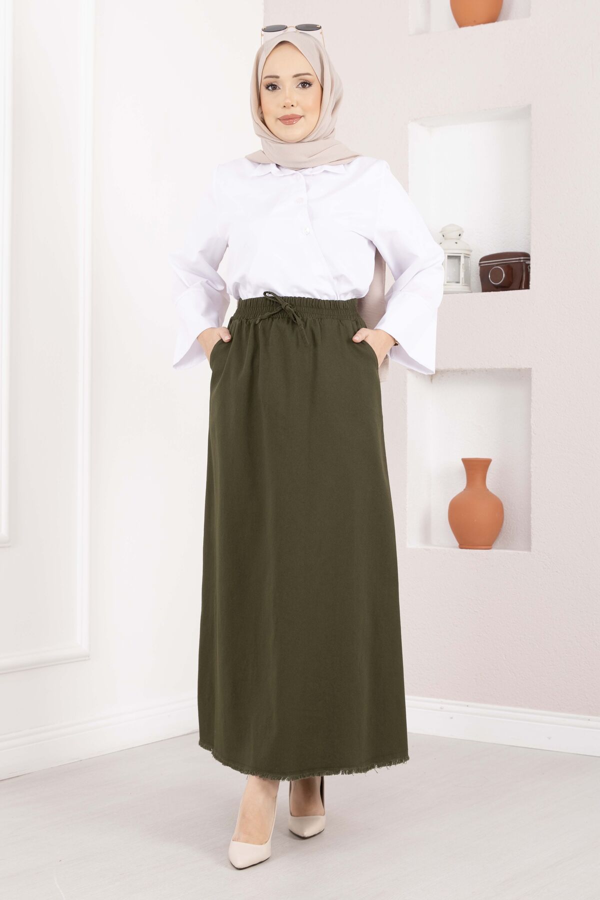 Cep Detaylı Beli Lastikli Etek Haki