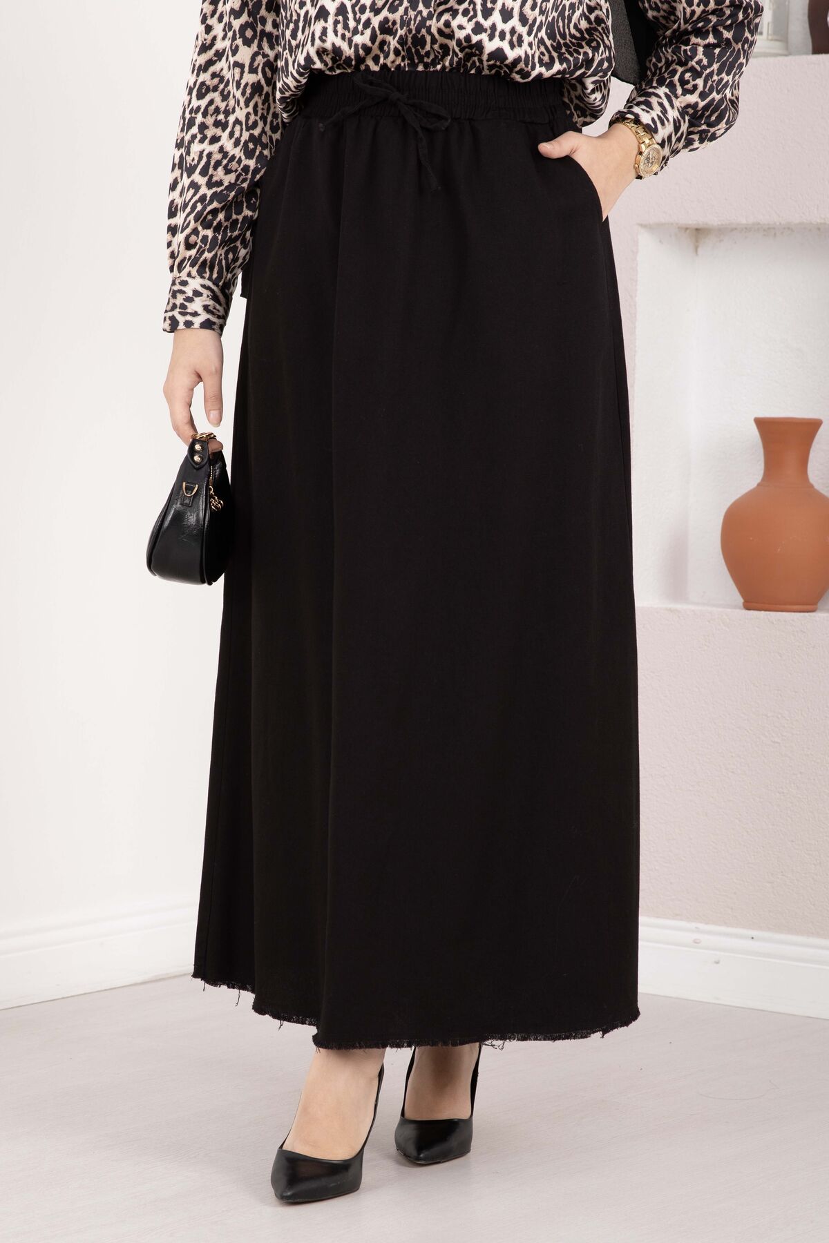 Cep Detaylı Beli Lastikli Etek Siyah