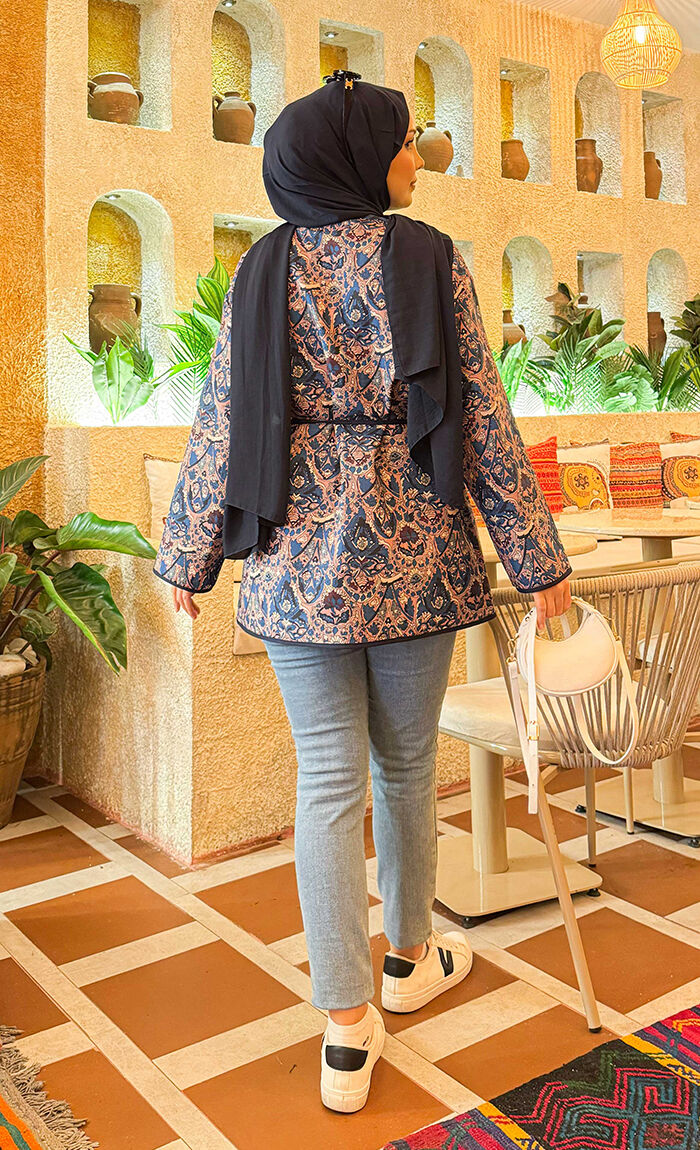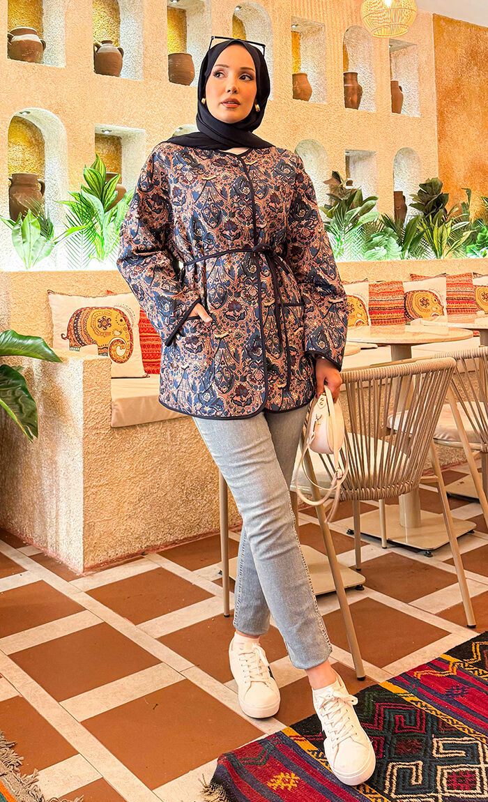 - Ürün Sonbahar & Kış modasıdır. Seyyar kemerli çift cep detaylı boydan düğmeli bohem kapitone ceket.