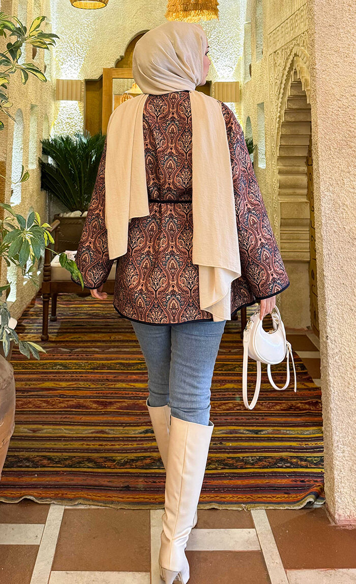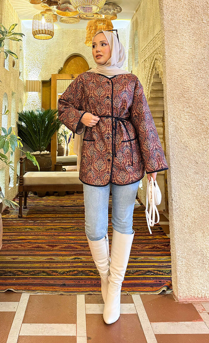 - Ürün Sonbahar & Kış modasıdır. Seyyar kemerli çift cep detaylı boydan düğmeli bohem kapitone ceket.