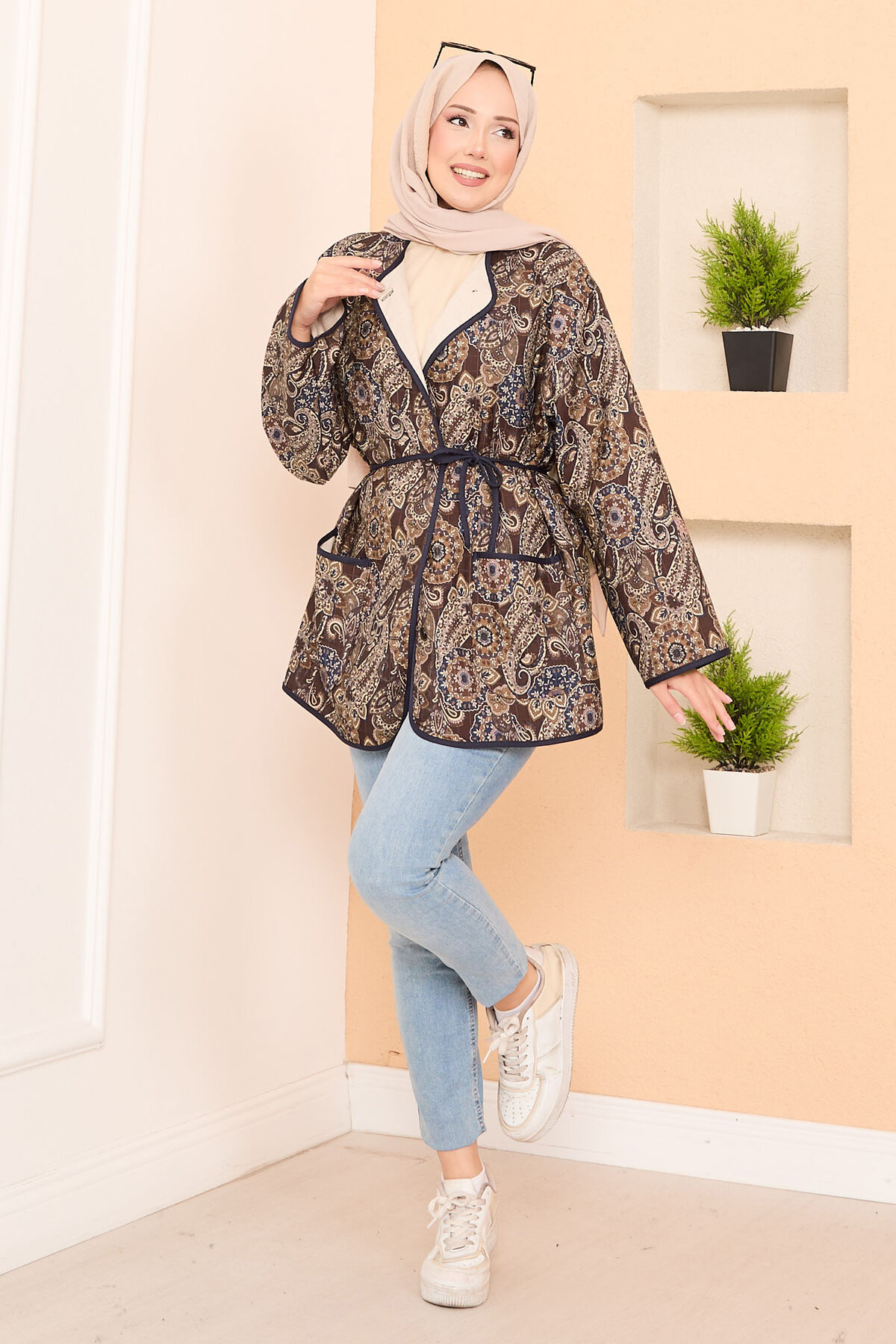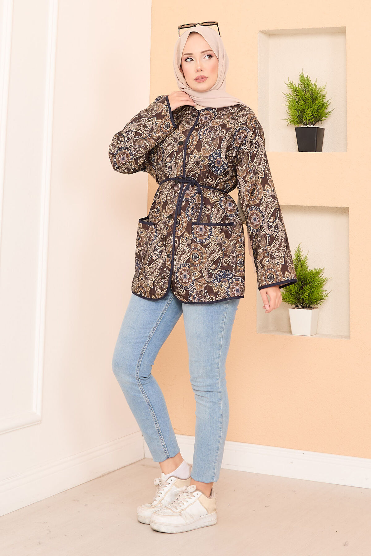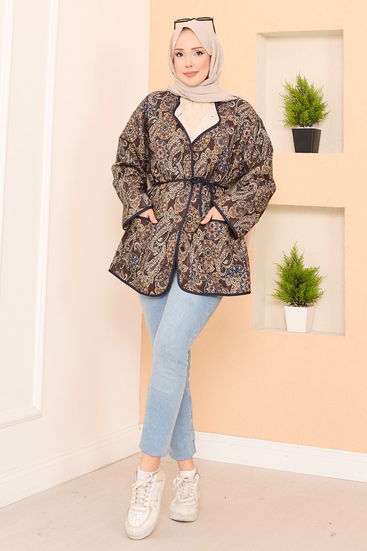 - Ürün Sonbahar & Kış modasıdır. Seyyar kemerli çift cep detaylı boydan düğmeli bohem kapitone ceket.