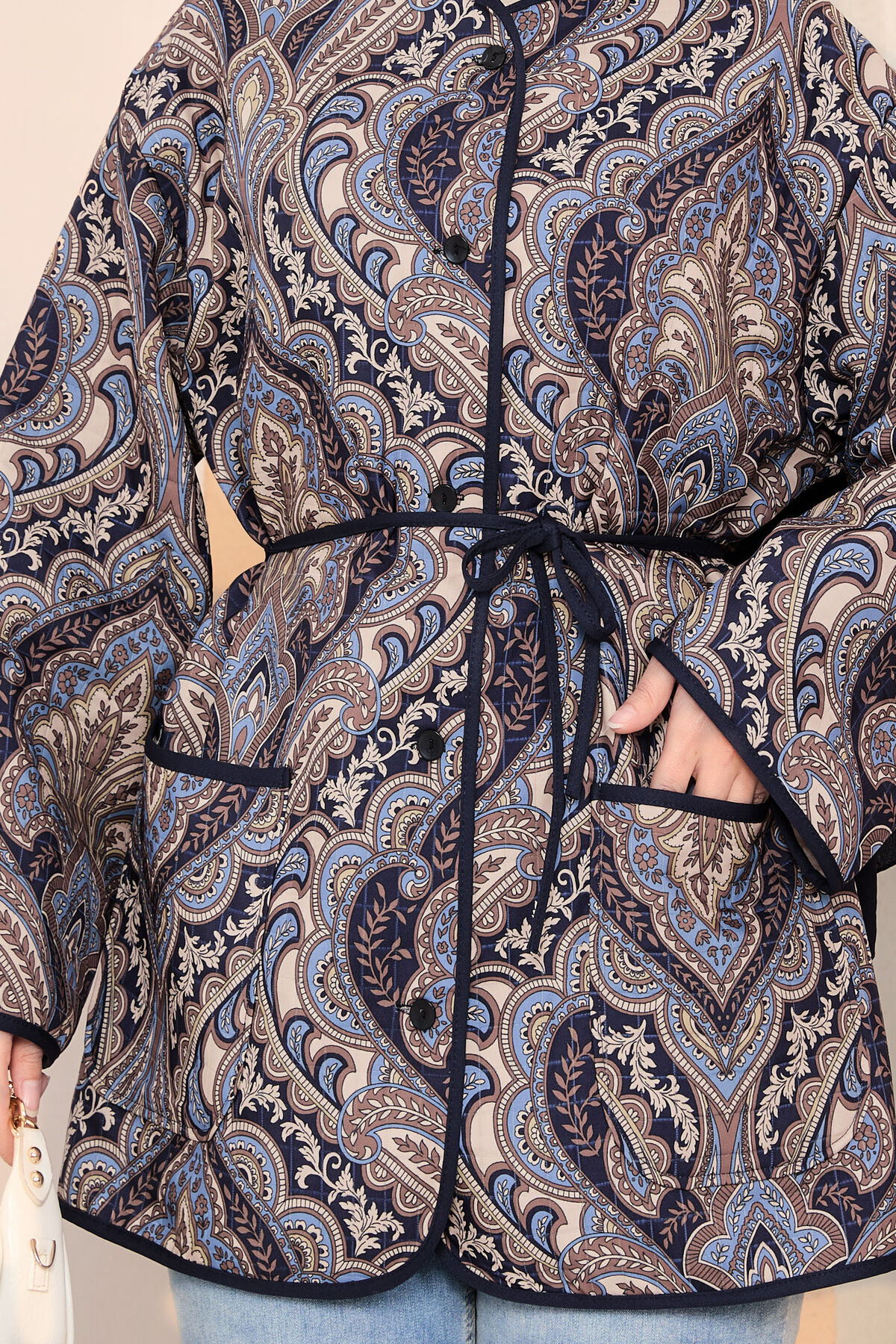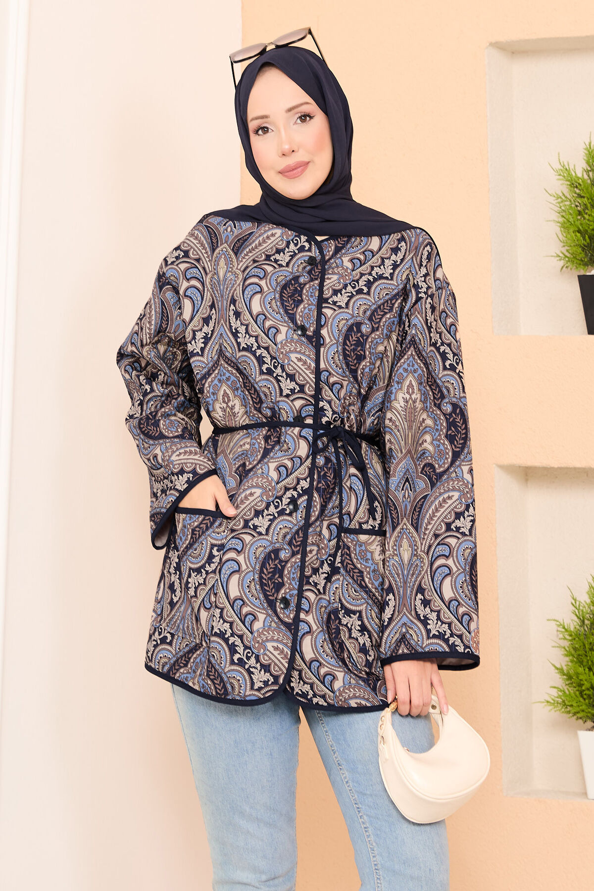 - Ürün Sonbahar & Kış modasıdır. Seyyar kemerli çift cep detaylı boydan düğmeli bohem kapitone ceket.