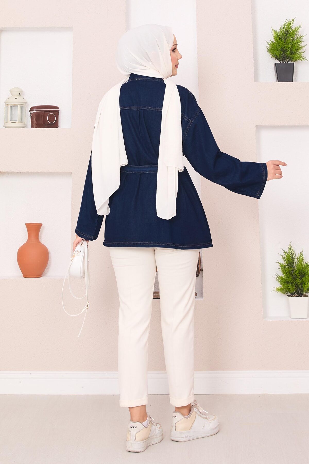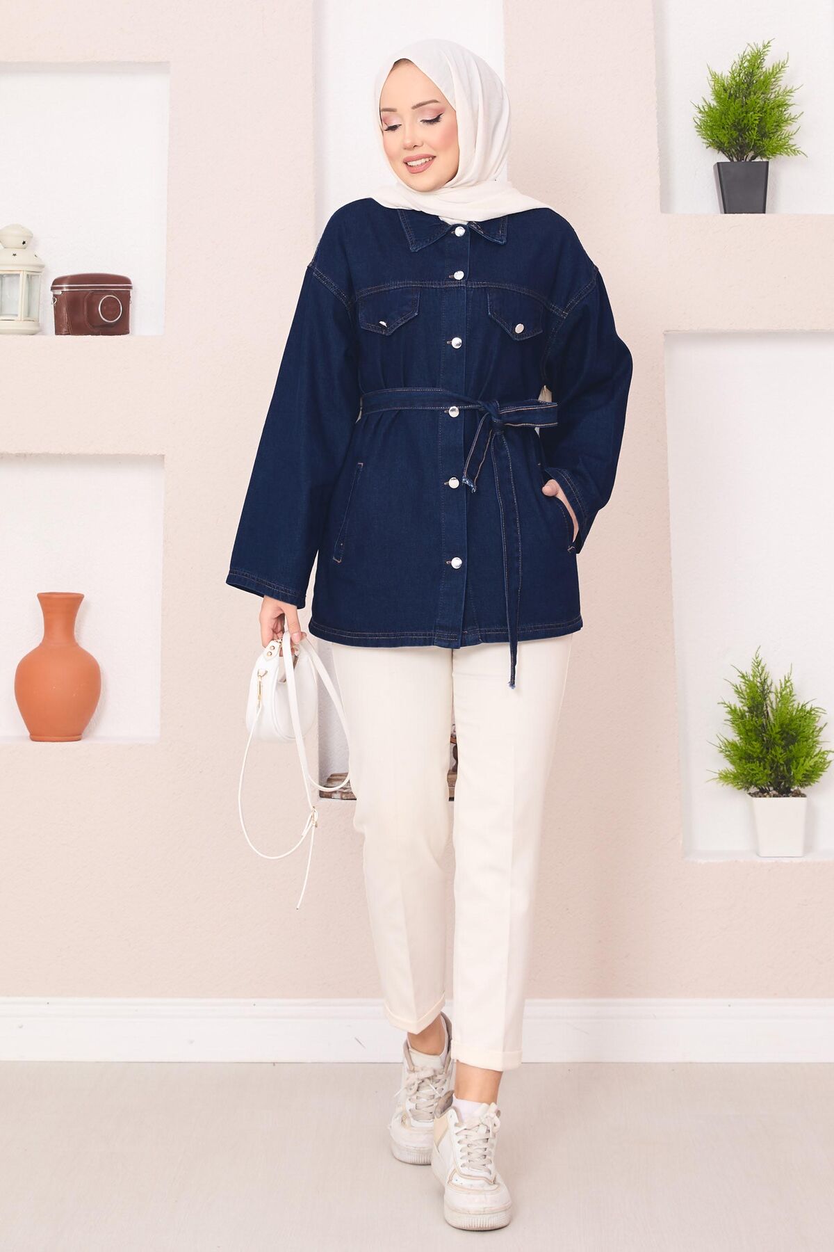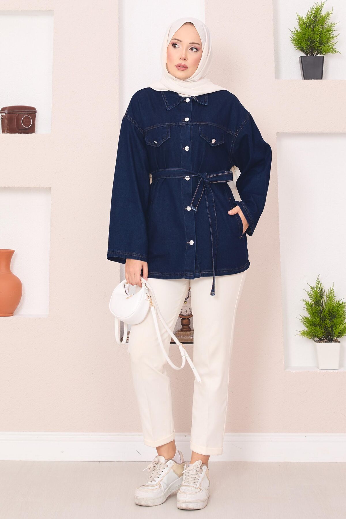 Cep Detaylı Seyyar Kuşaklı Kot Ceket Lacivert