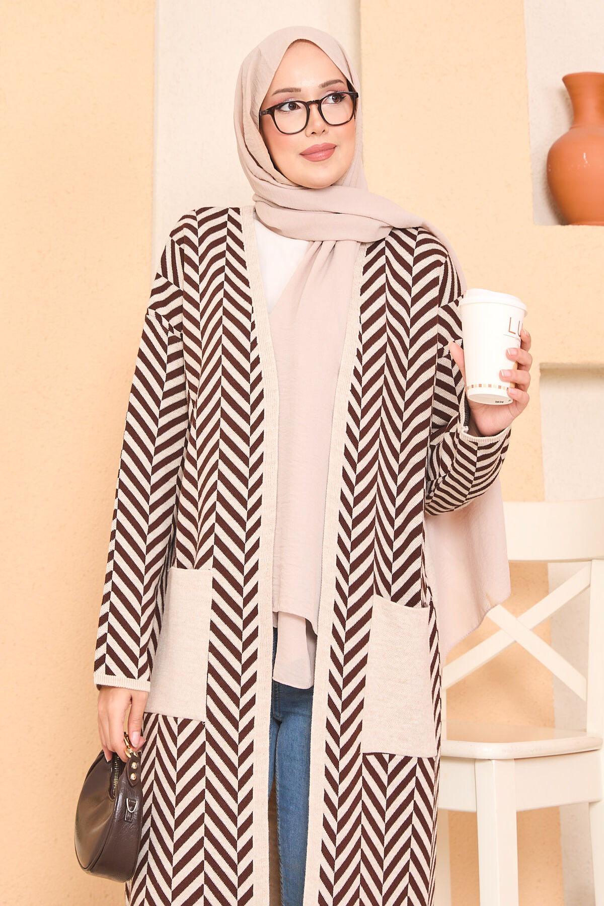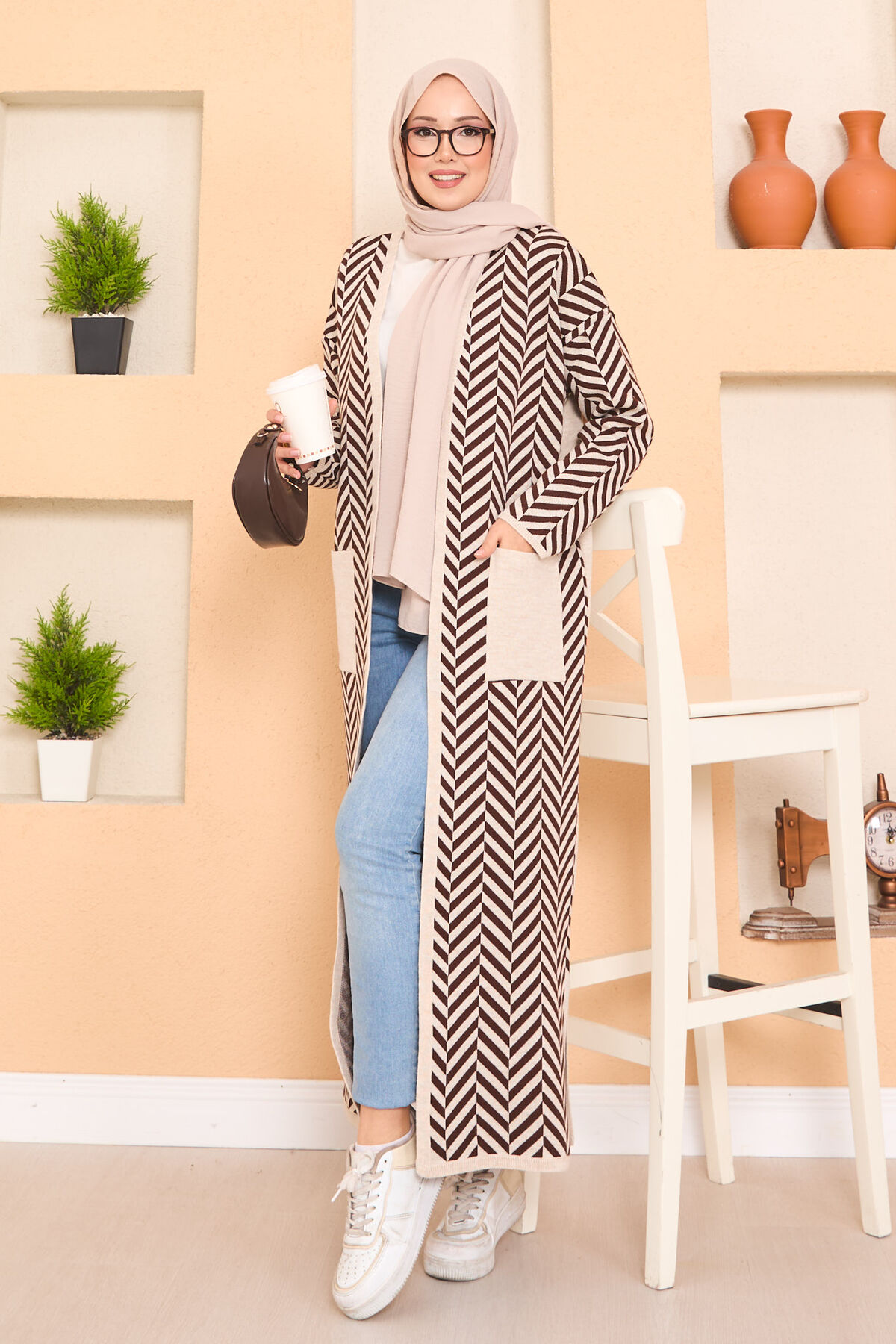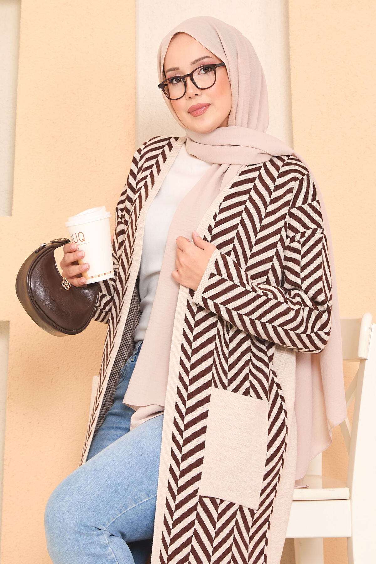 Cep Detaylı Zikzak Çizgili Tesettür Triko Hırka Bej