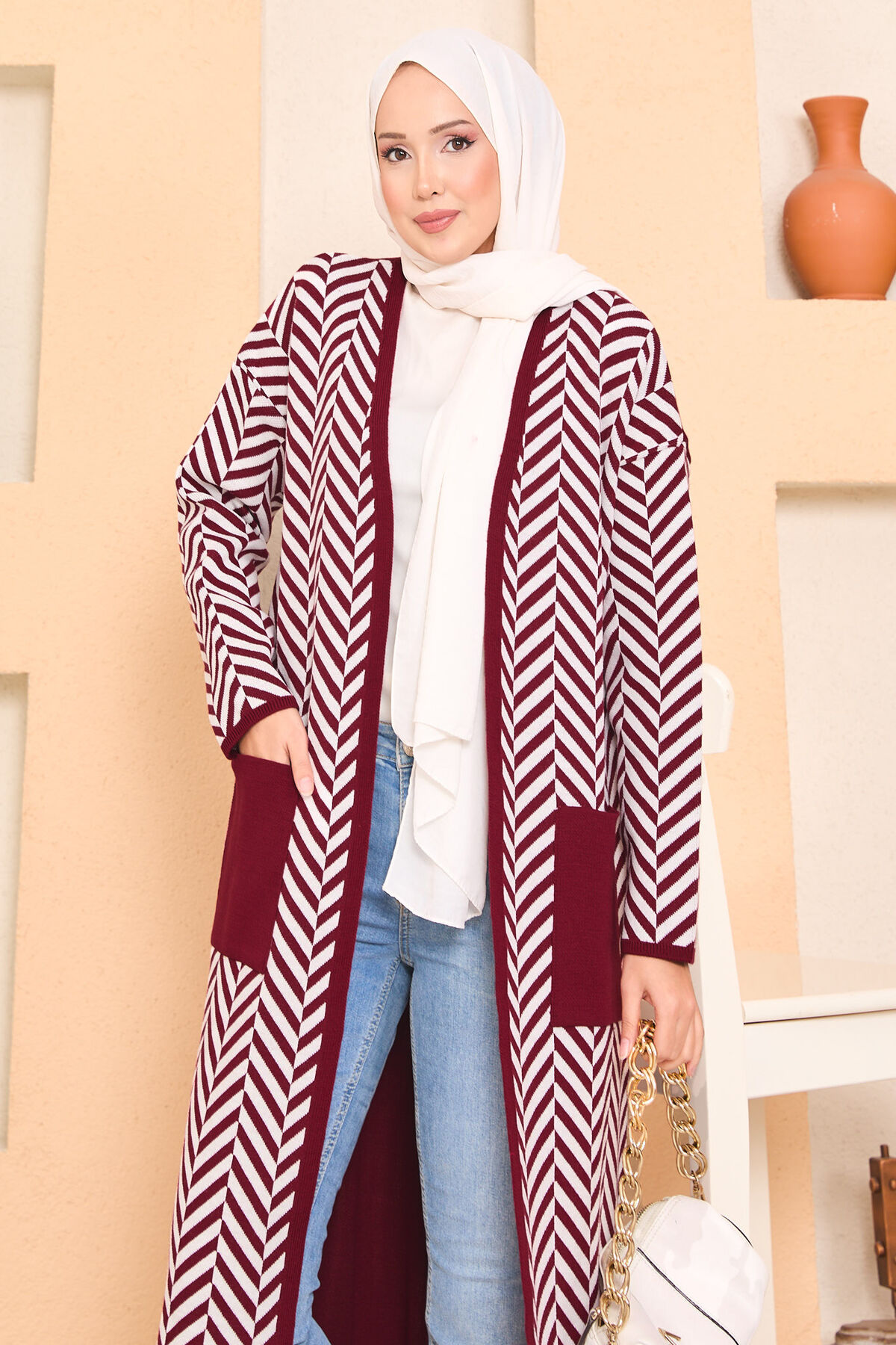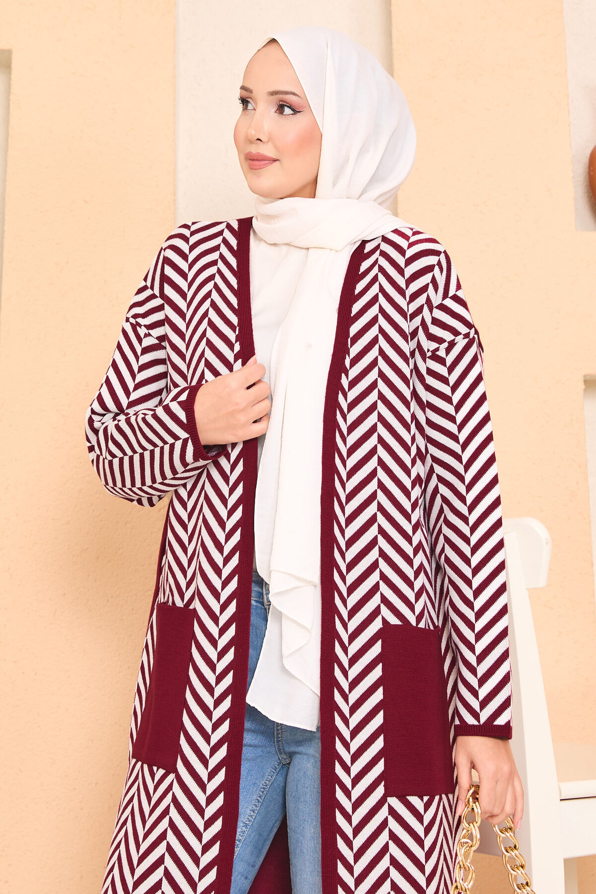 Cep Detaylı Zikzak Çizgili Tesettür Triko Hırka Bordo
