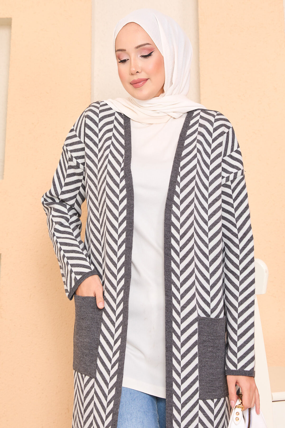 Cep Detaylı Zikzak Çizgili Tesettür Triko Hırka Gri