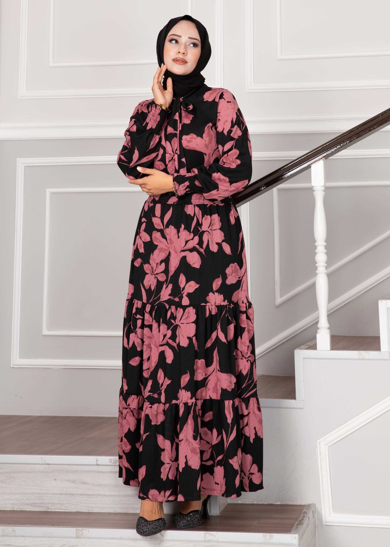 Çiçek Desen Beli Lastikli Elbise Gülkurusu