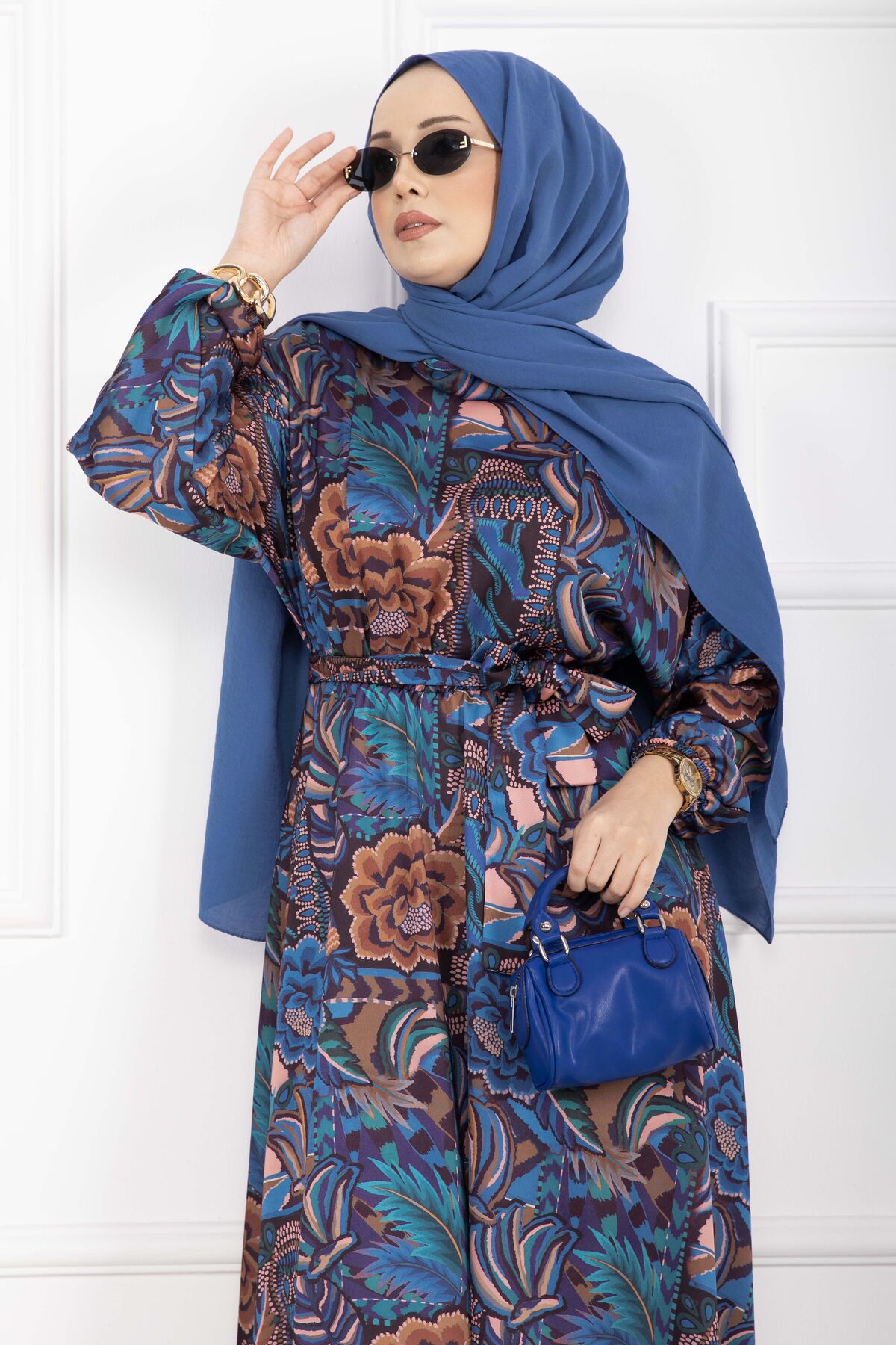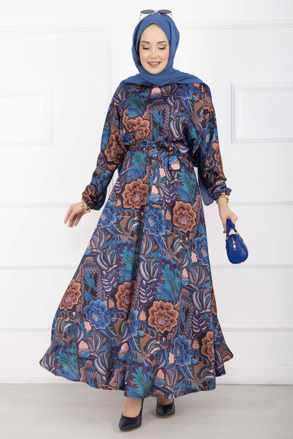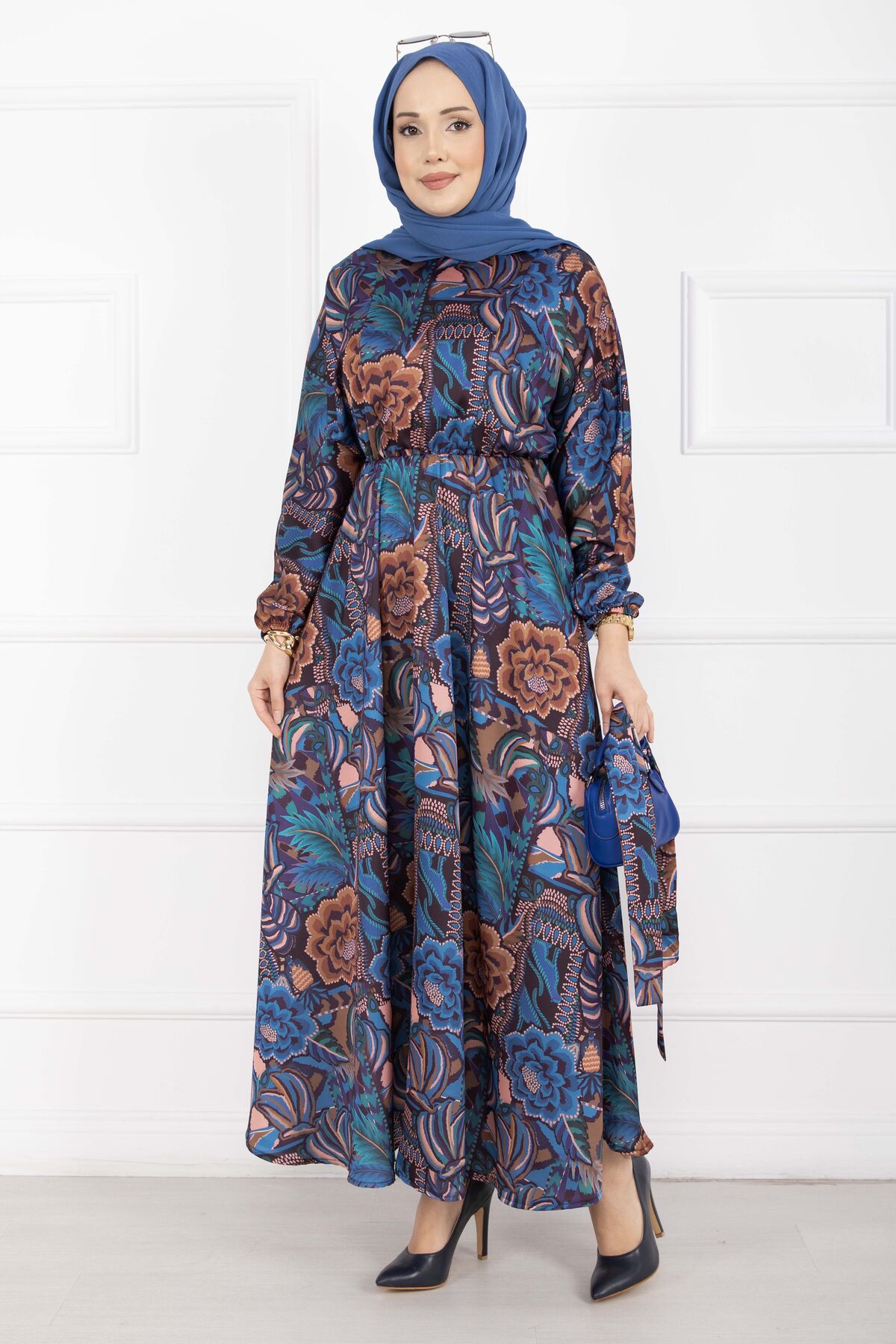 Çiçek Desen Kuşaklı Tesettür Elbise İndigo