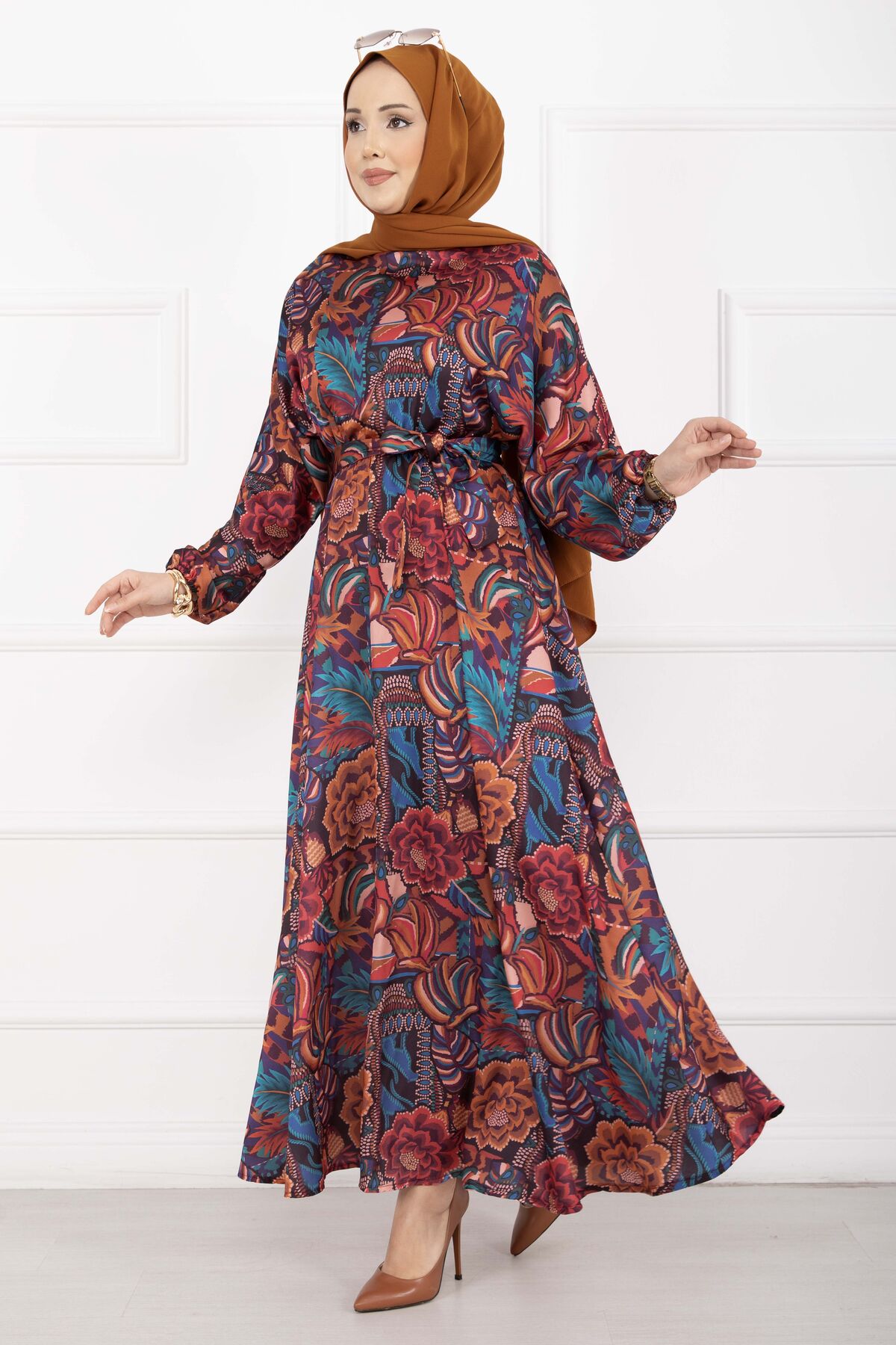 Çiçek Desen Kuşaklı Tesettür Elbise Kiremit