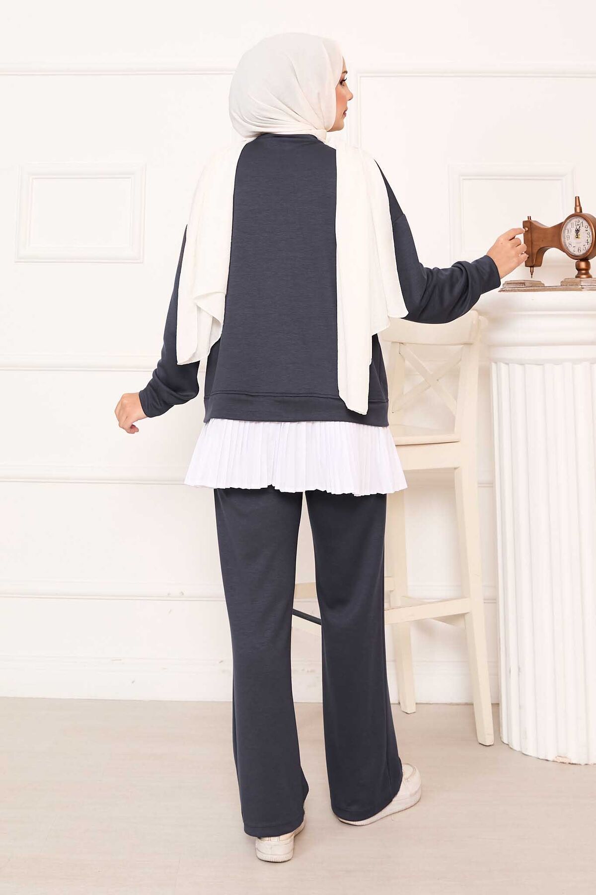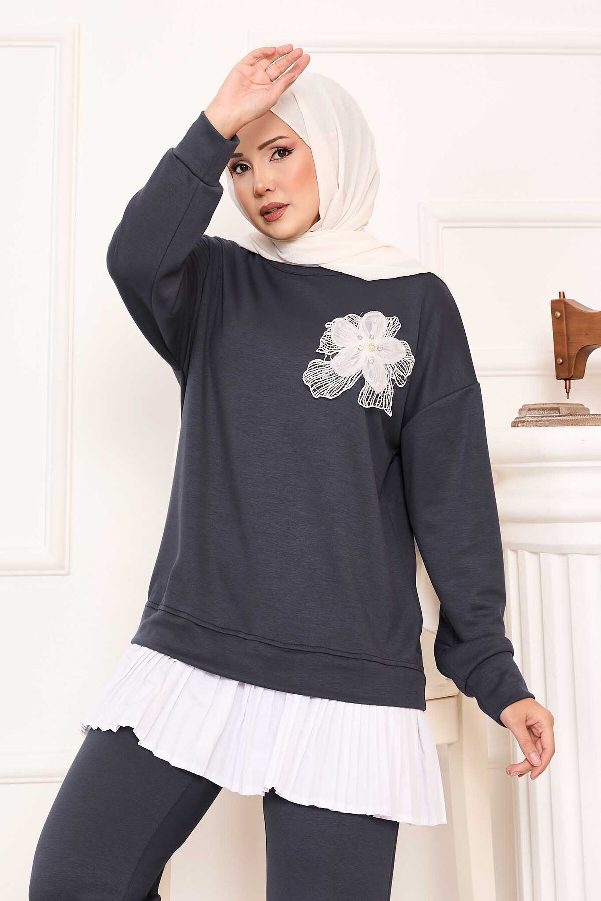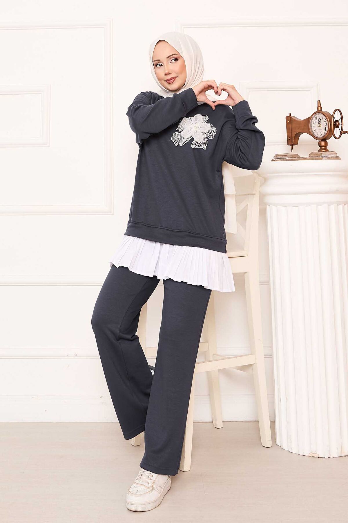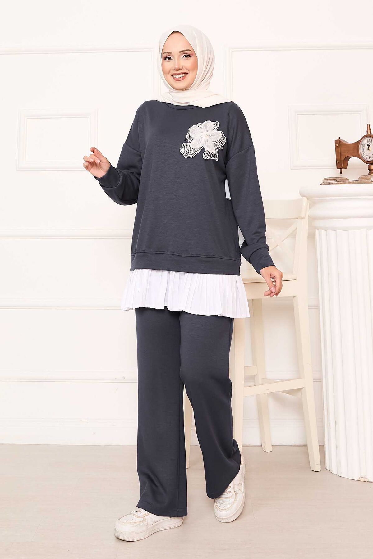 Çiçek Detaylı Eteği Piliseli Oyşo Takım Gri