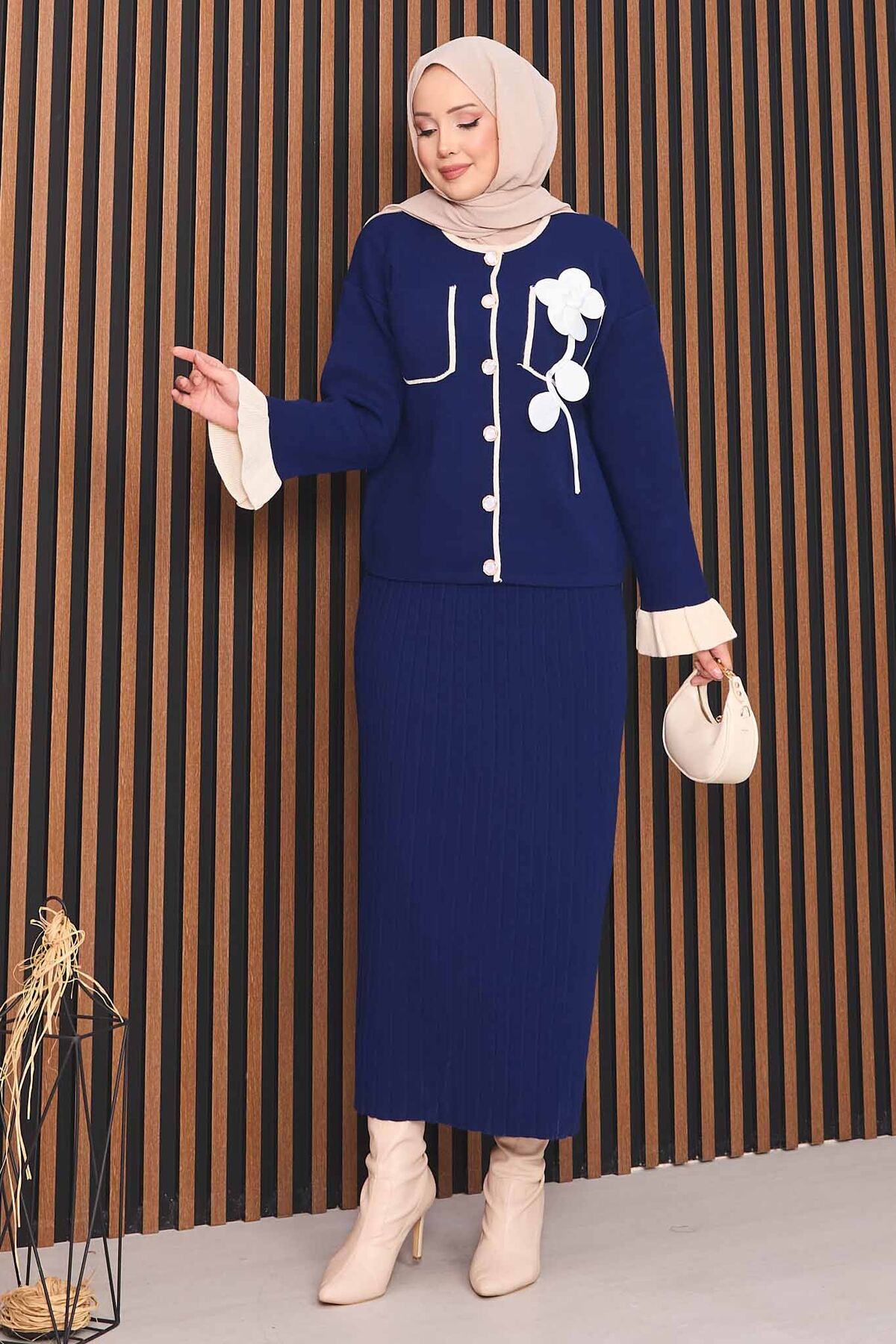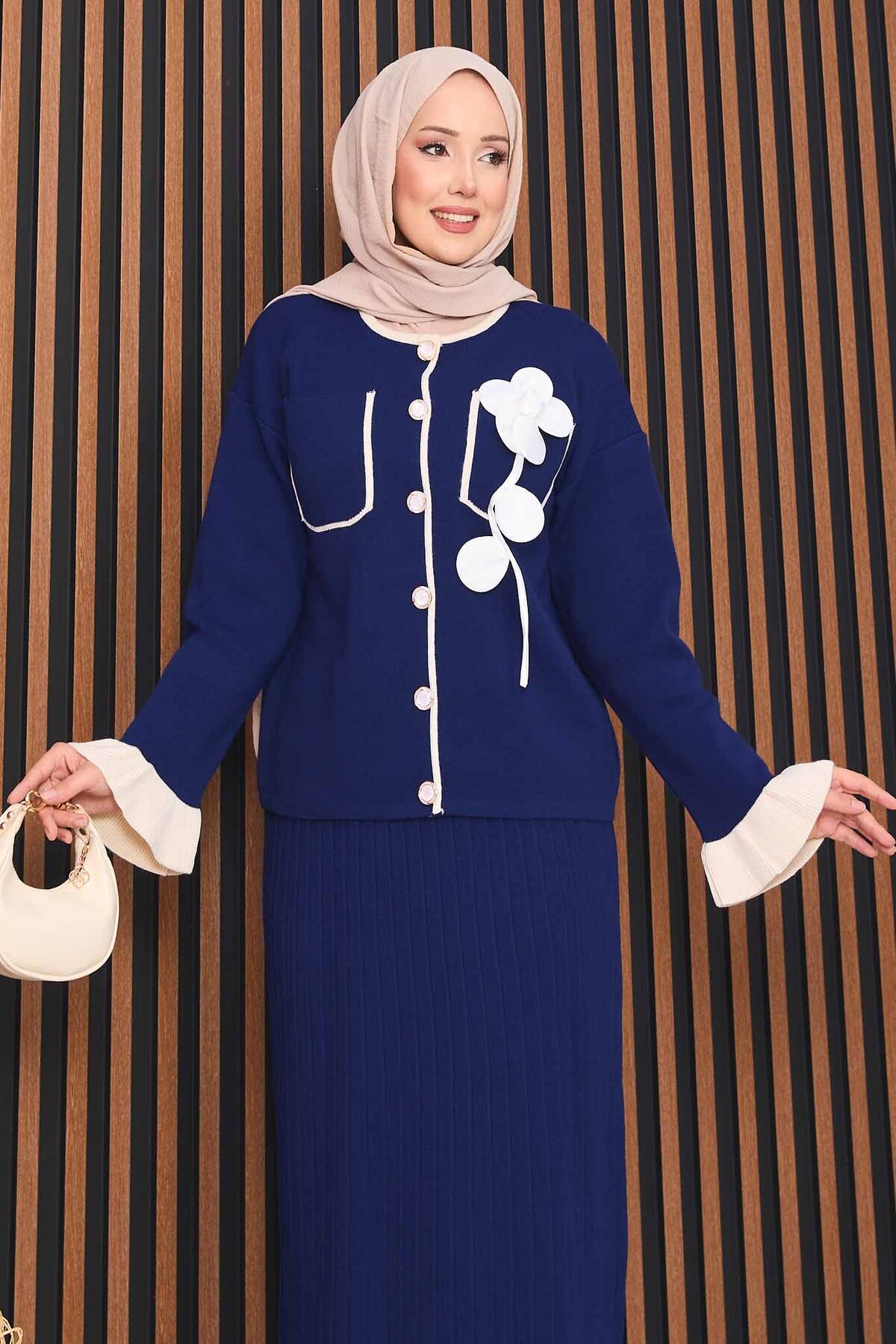 Çiçek Detaylı Sedef Düğmeli Tesettür Triko Takım Lacivert