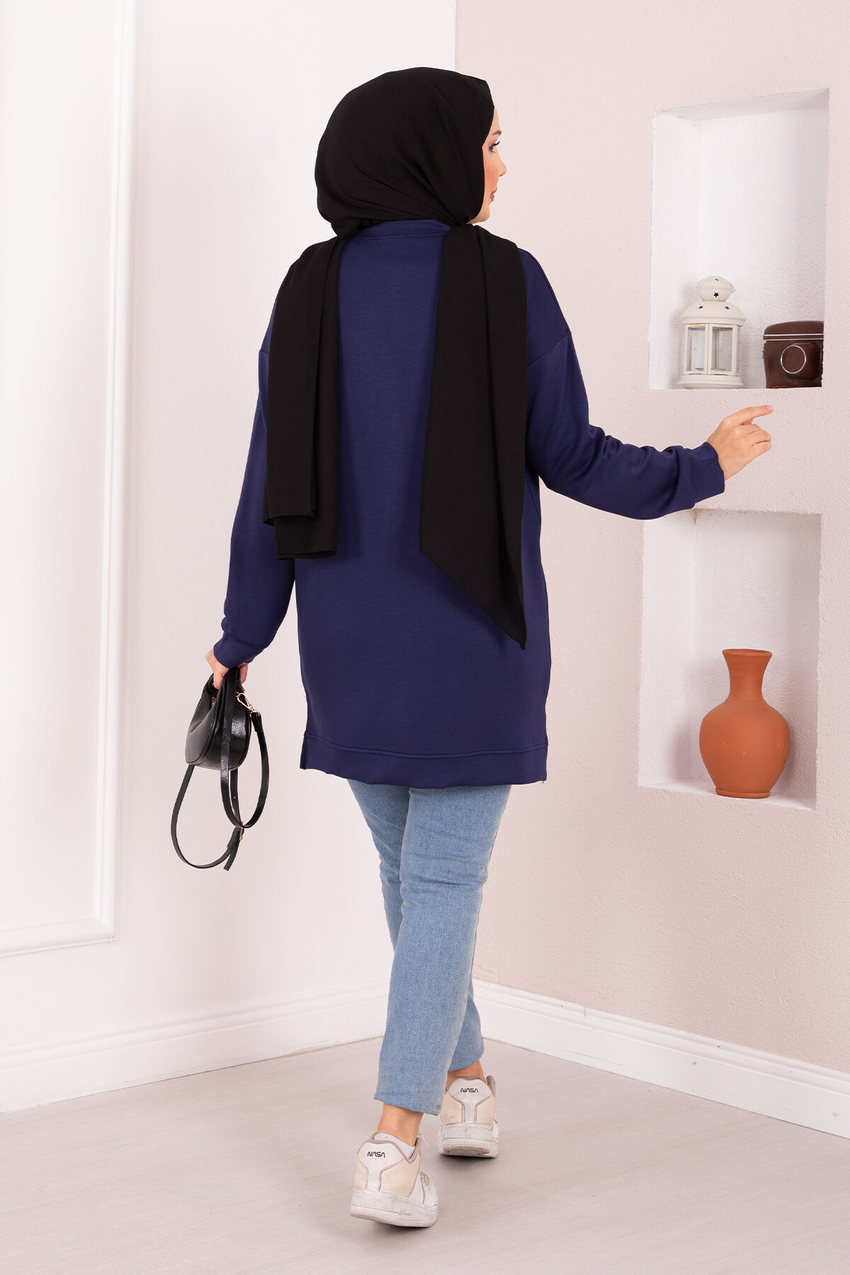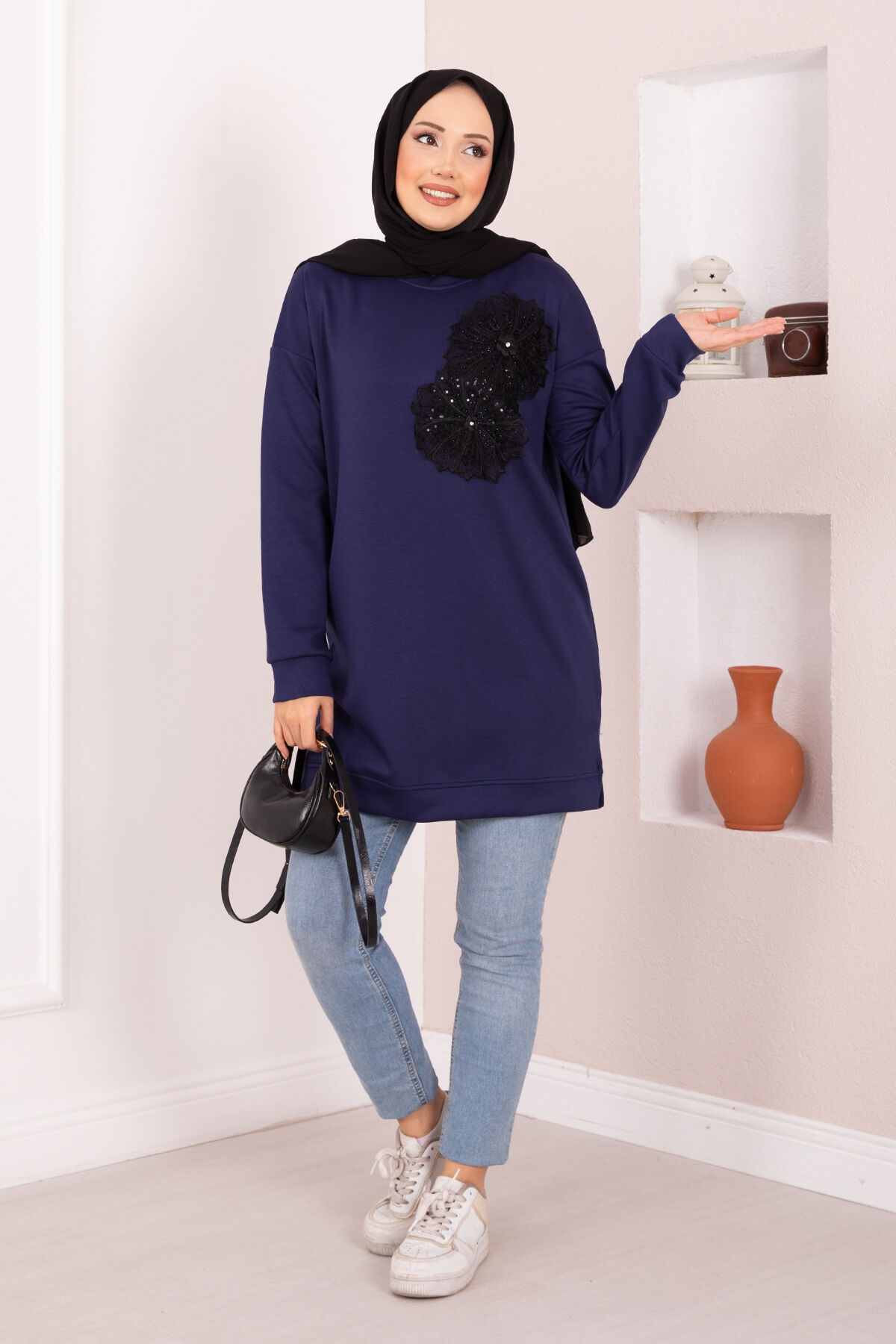 Çiçek Nakışlı Oyşo Tesettür Tunik Lacivert