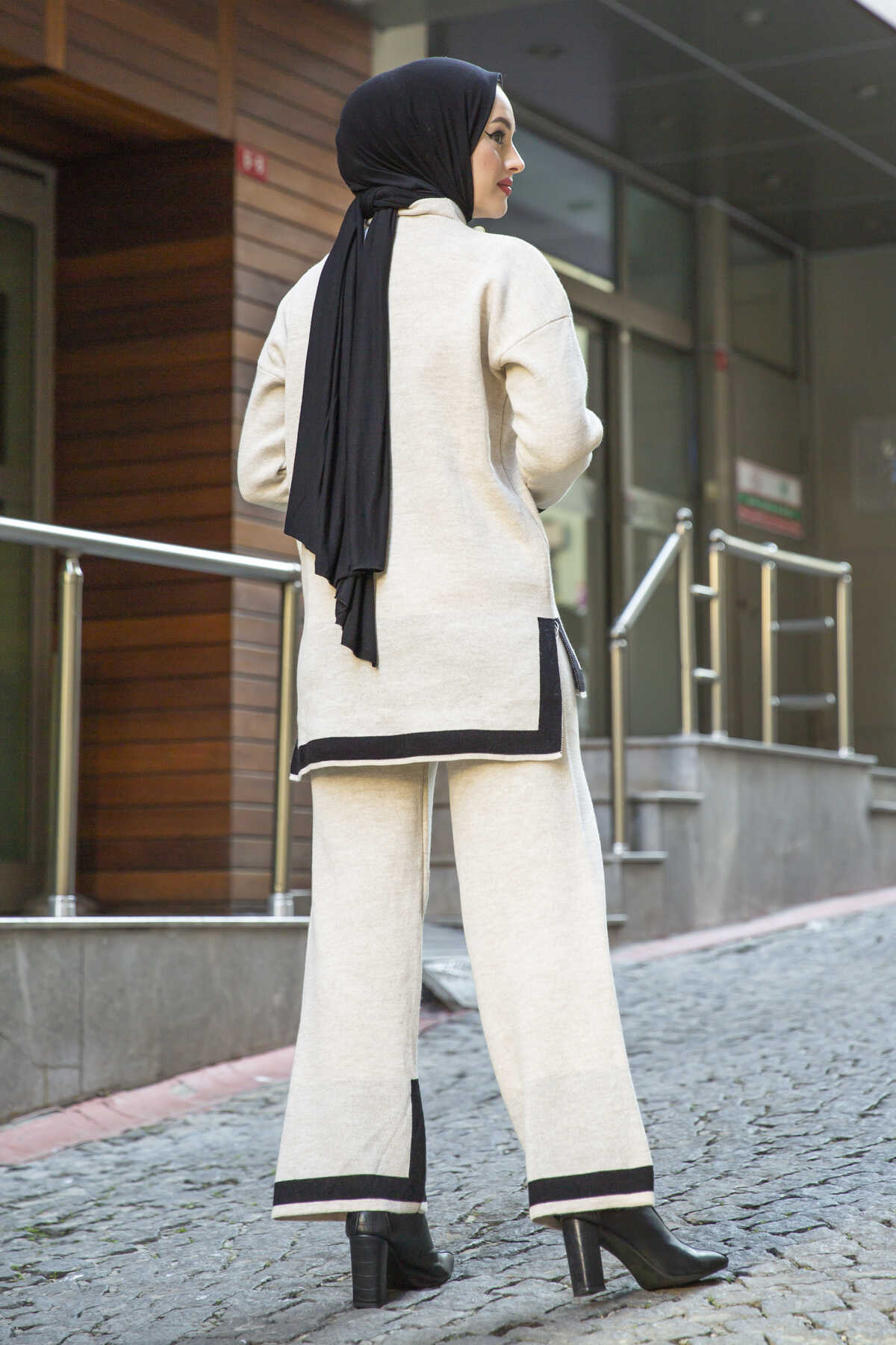 Çizgi Detaylı Tesettür Triko Takım Krem