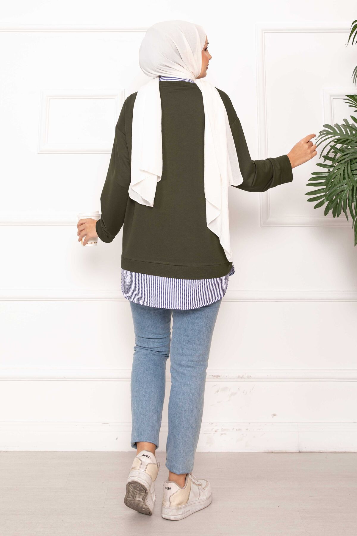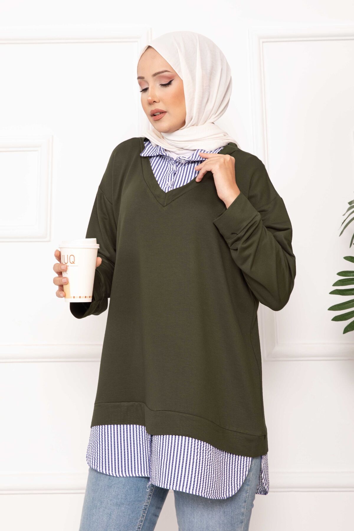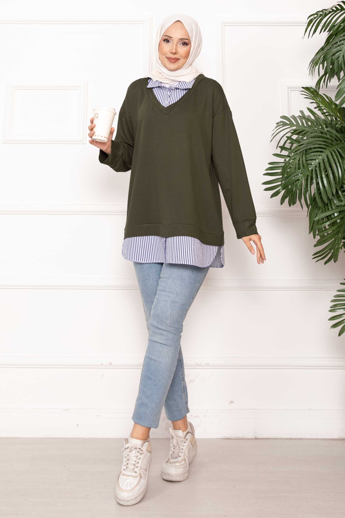 Çizgili Gömlek Garnili Tunik Haki