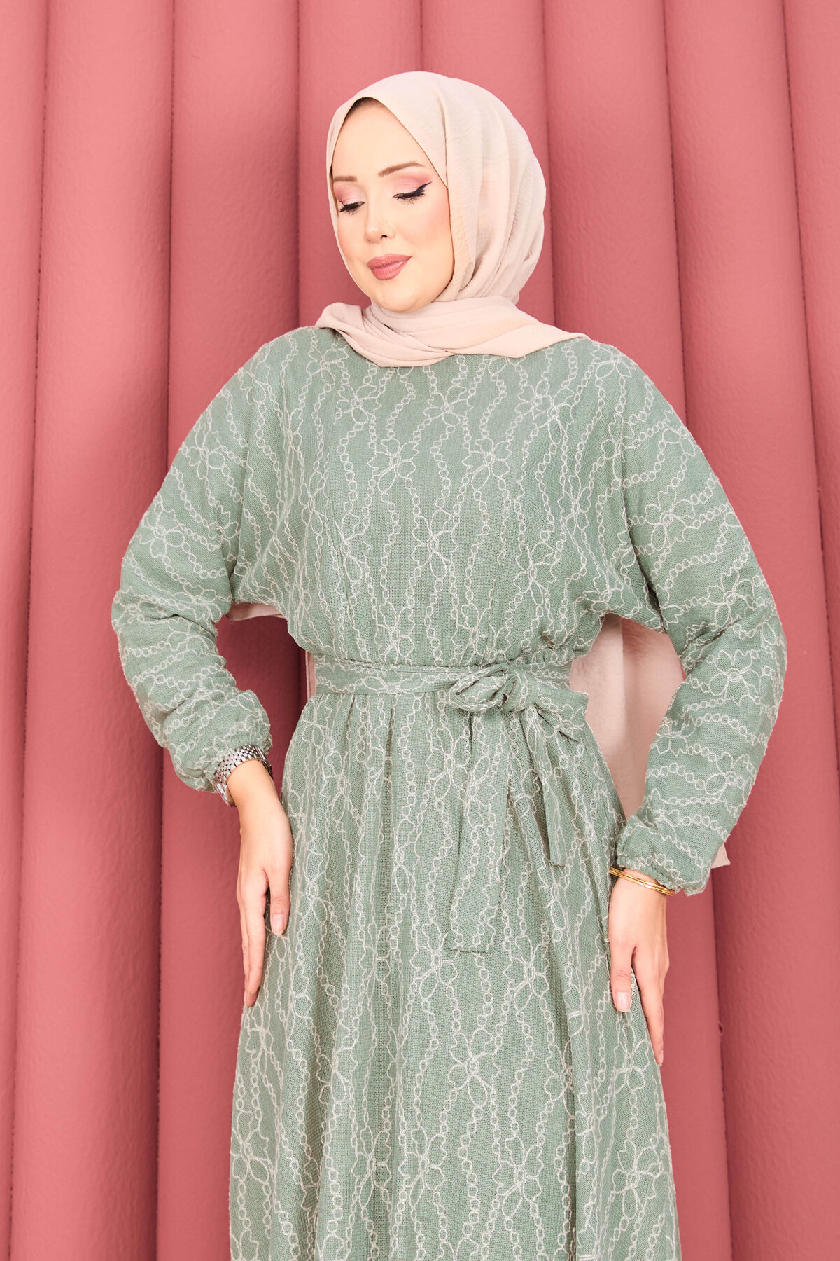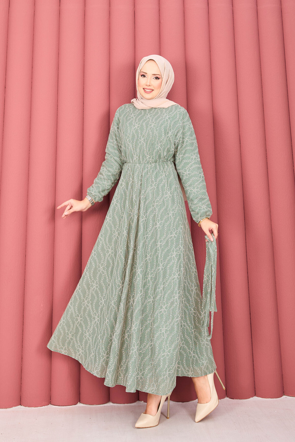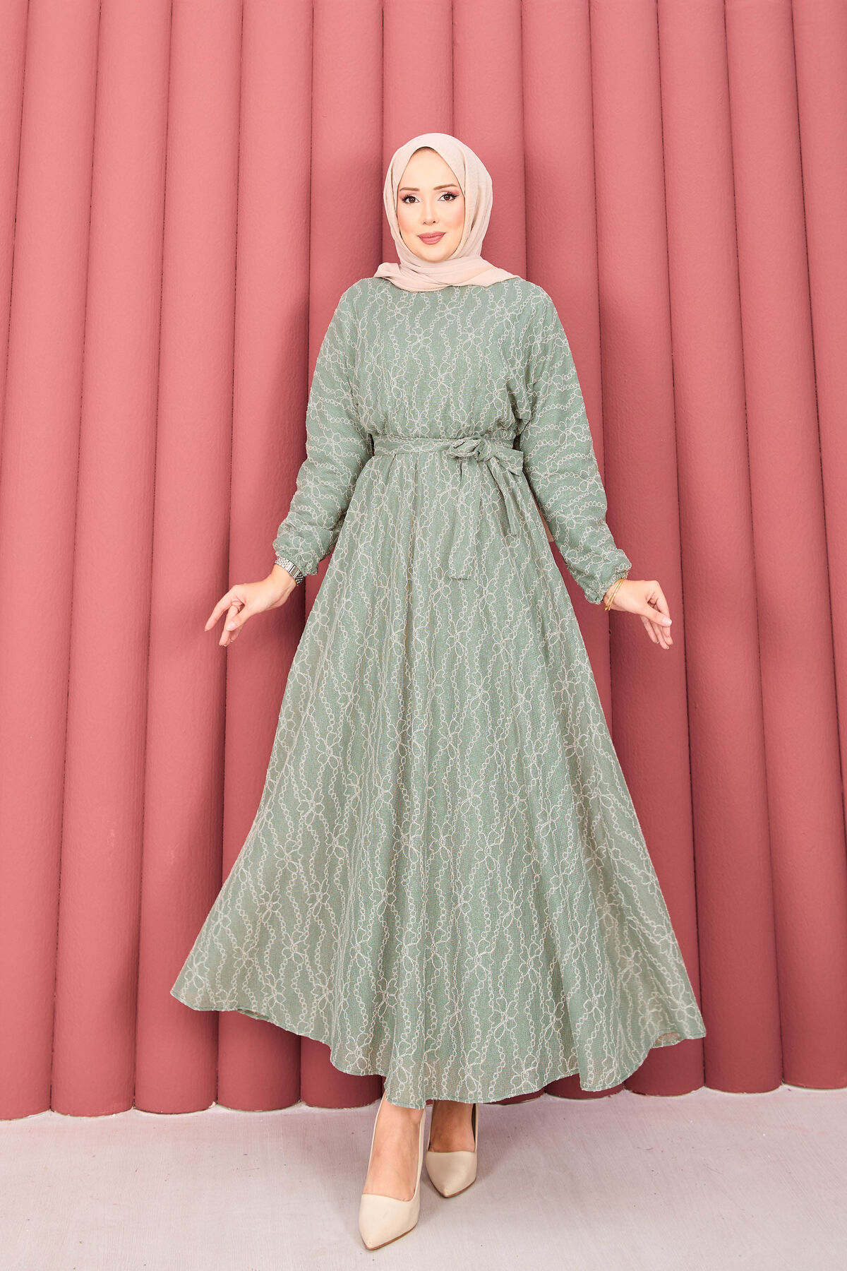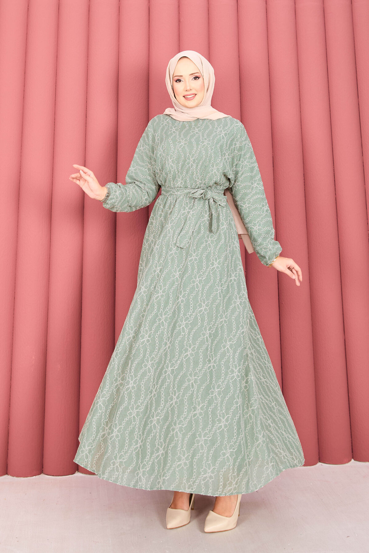 Dantel Dokulu Seyyar Kuşaklı Tesettür Elbise Mint