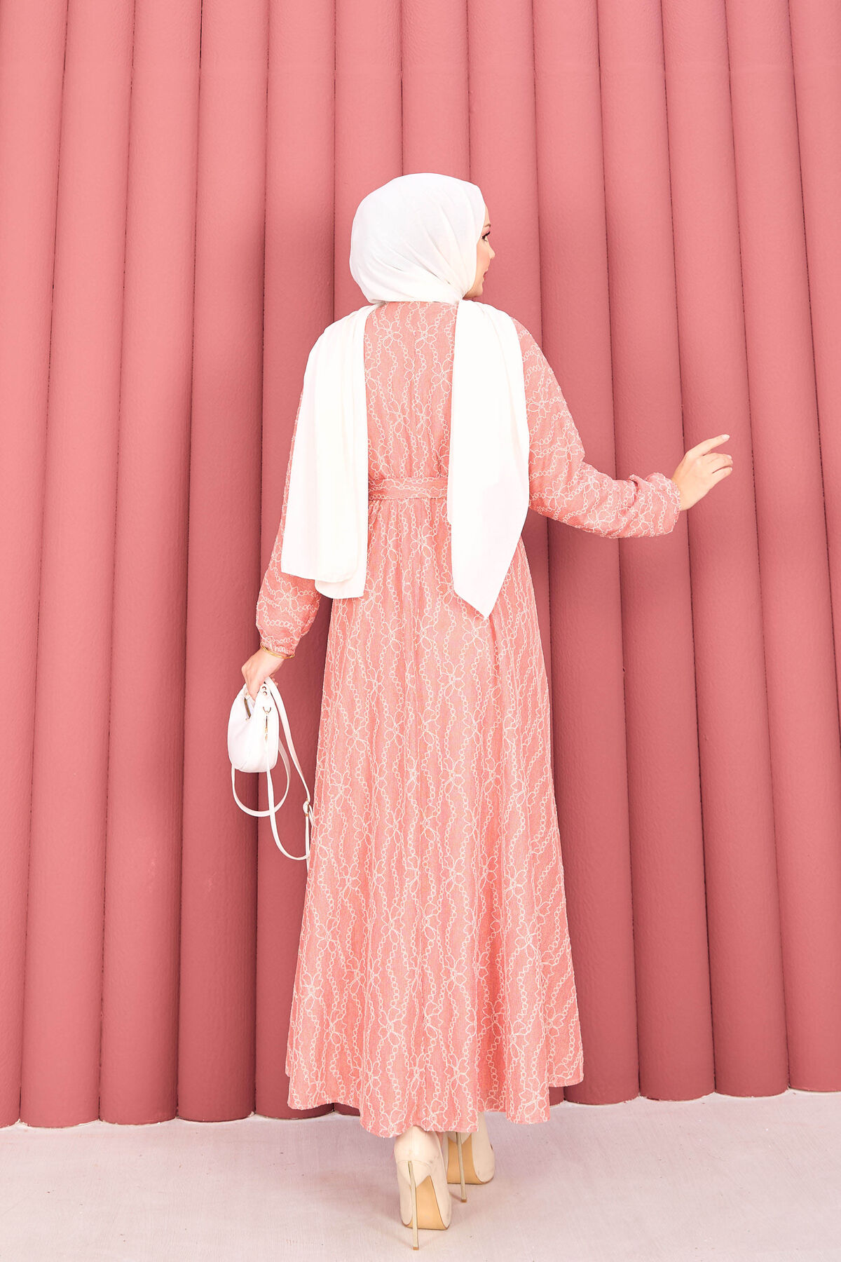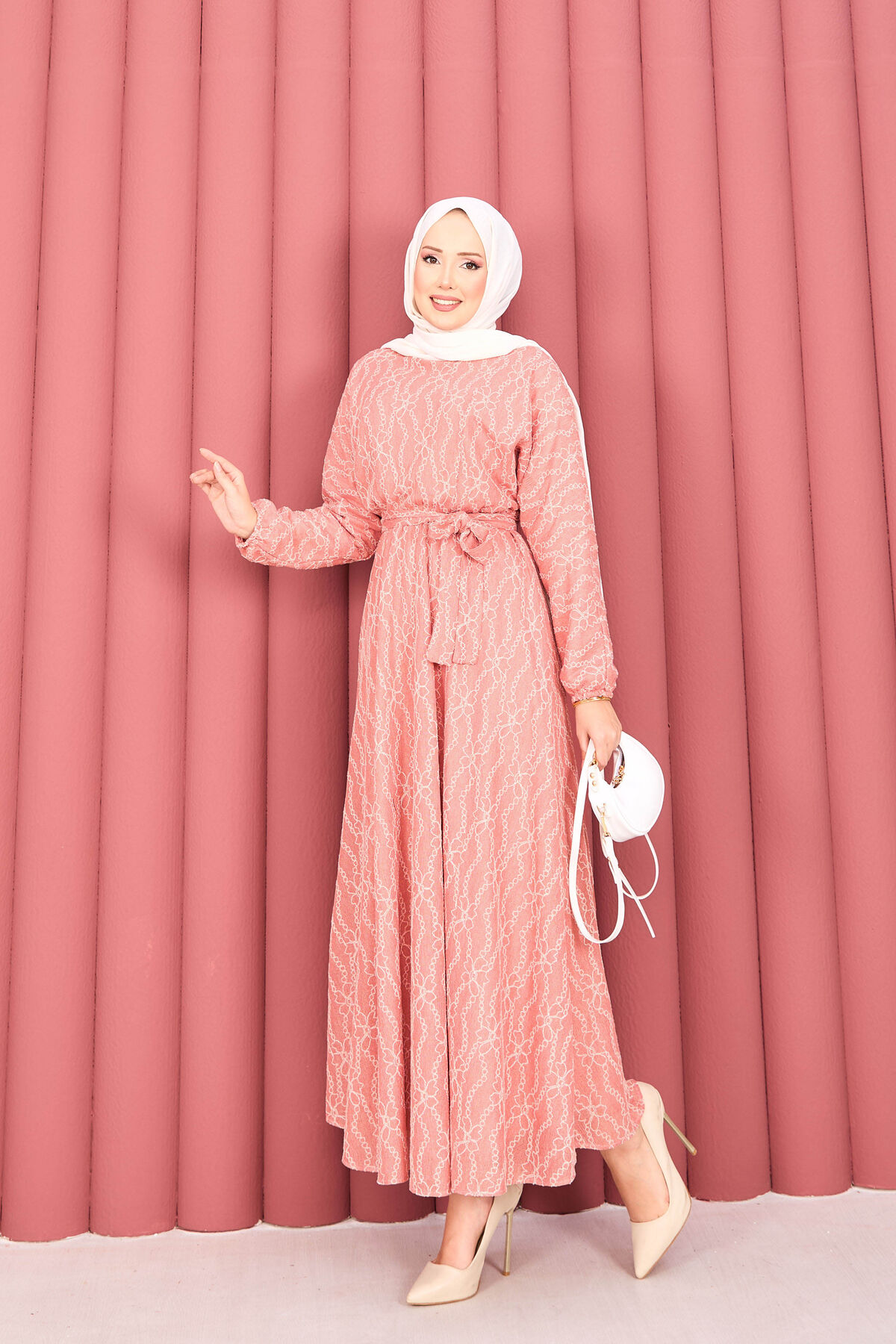 Dantel Dokulu Seyyar Kuşaklı Tesettür Elbise Pudra