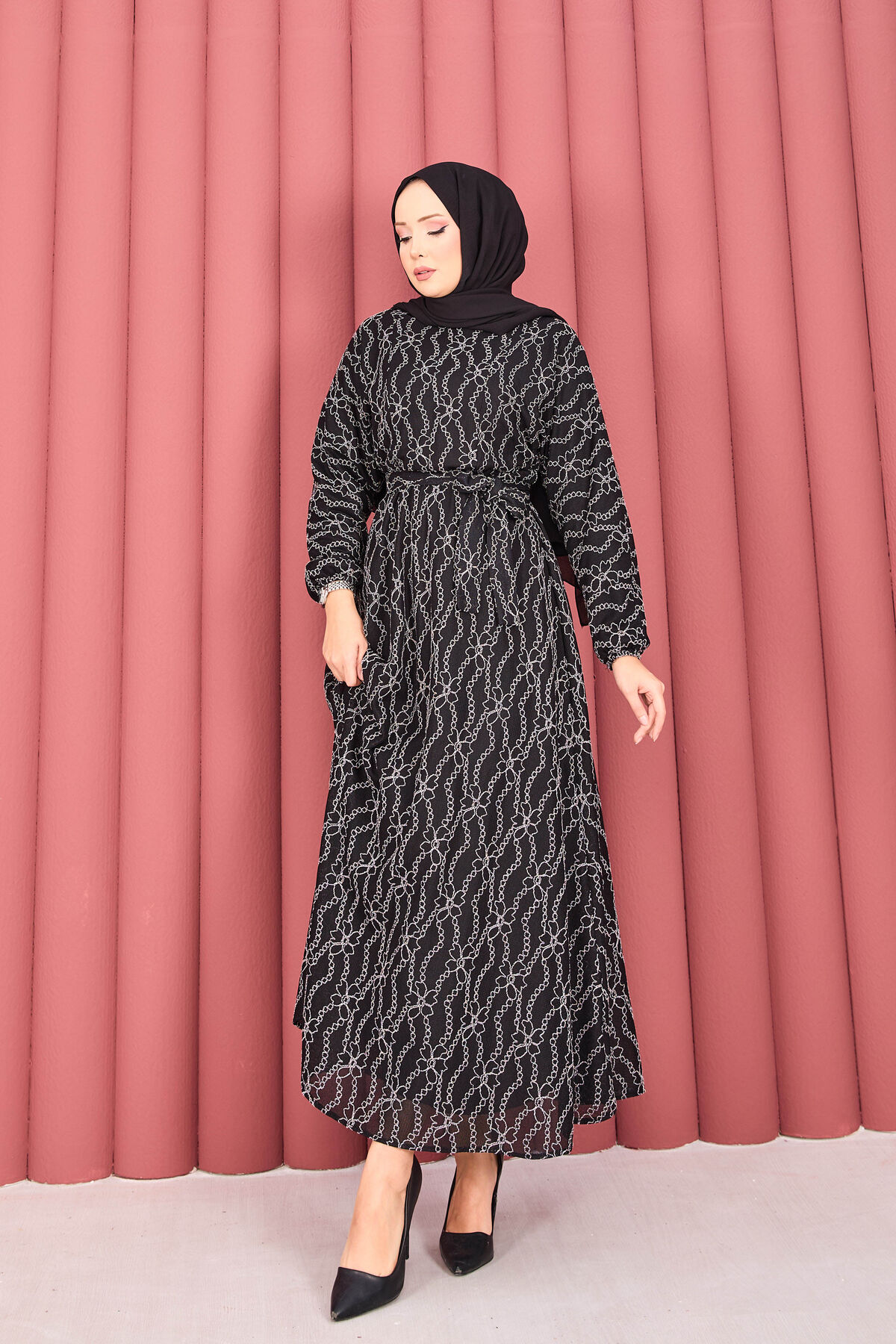 Dantel Dokulu Seyyar Kuşaklı Tesettür Elbise Siyah