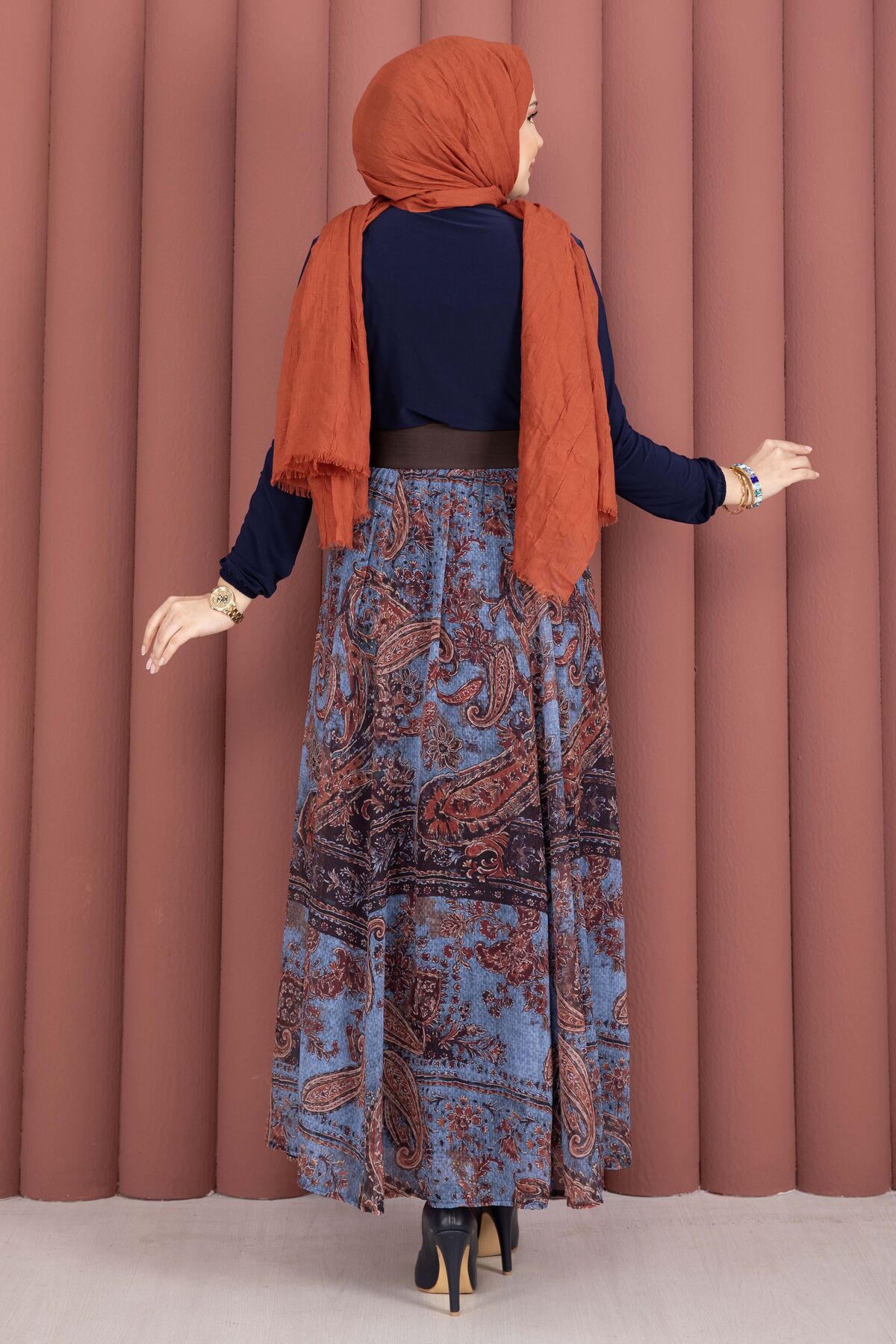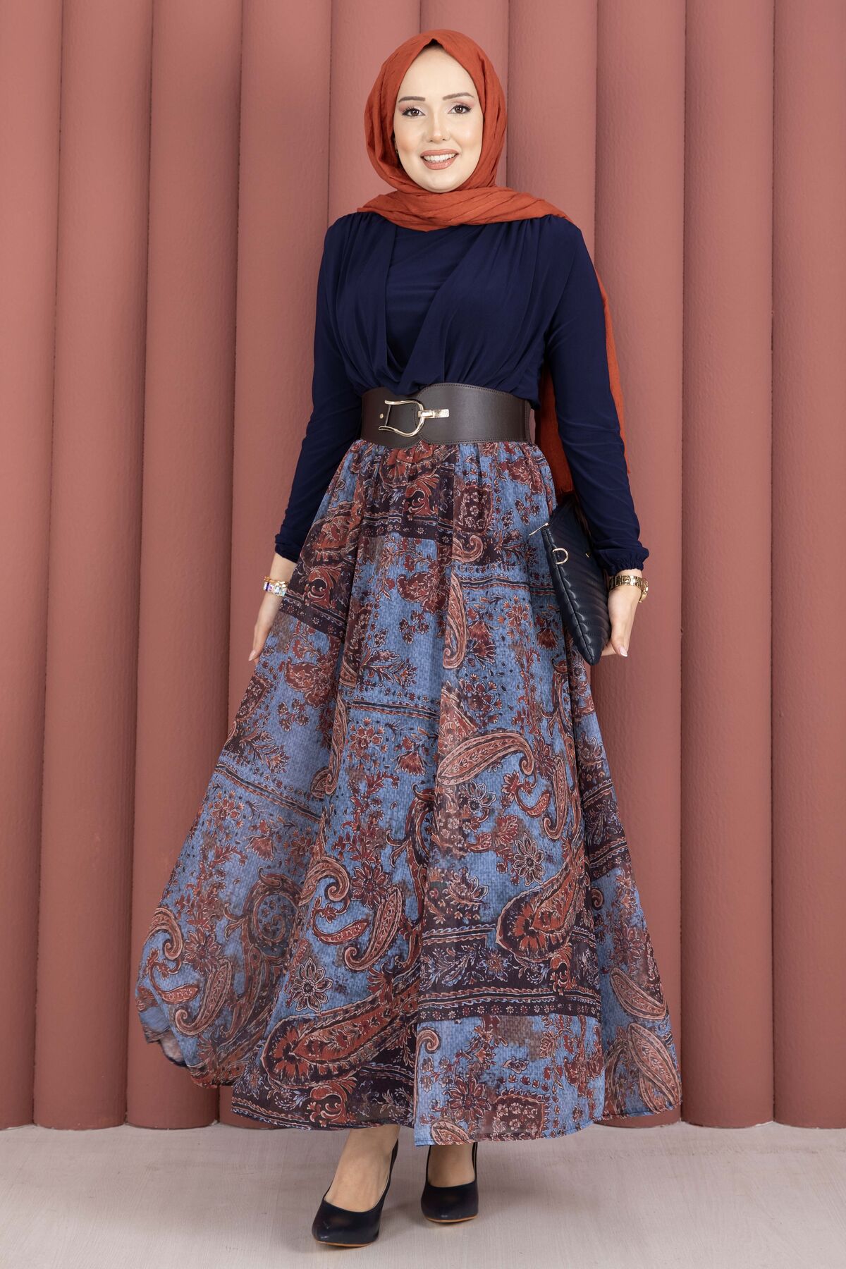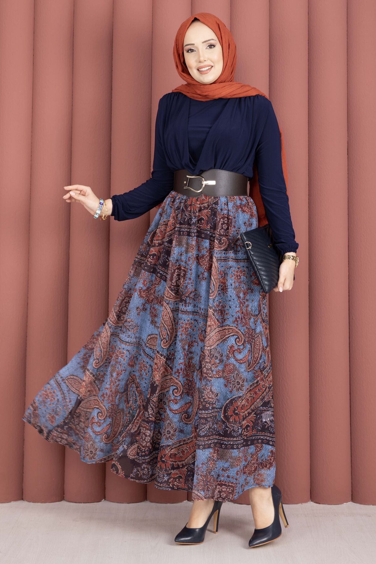 - Etek: Şal desenli şifon, beli lastikli, 97 cm boy