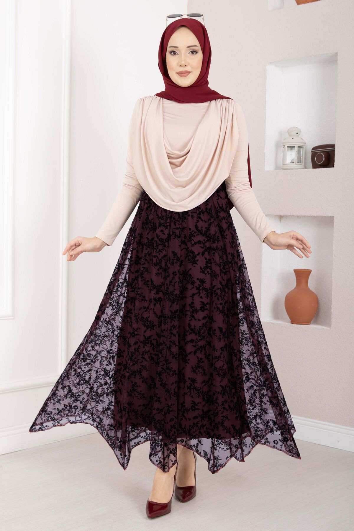 Detay: Degaje yaka, dökümlü tasarım