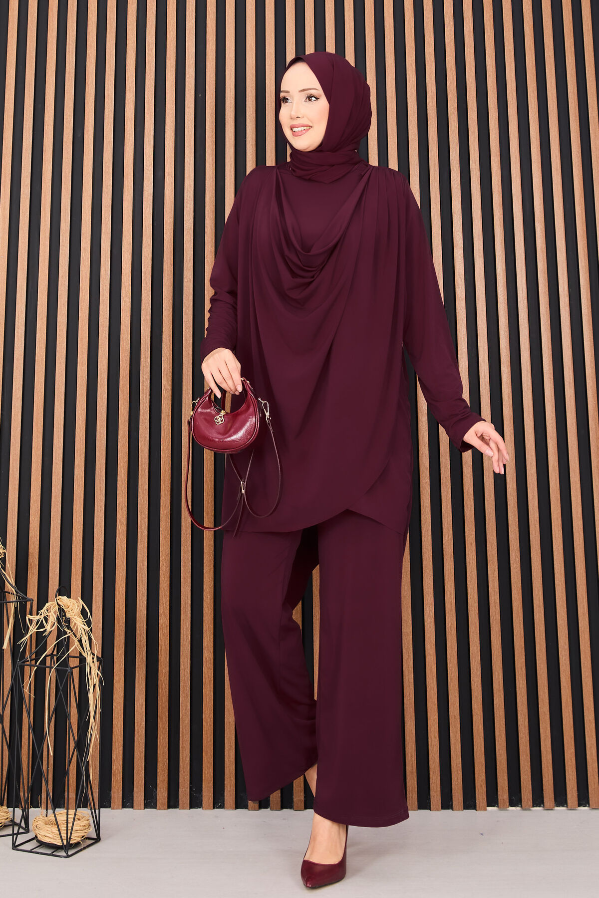 Degaje Dökümlü Sandy Tesettür İkili Takım Bordo