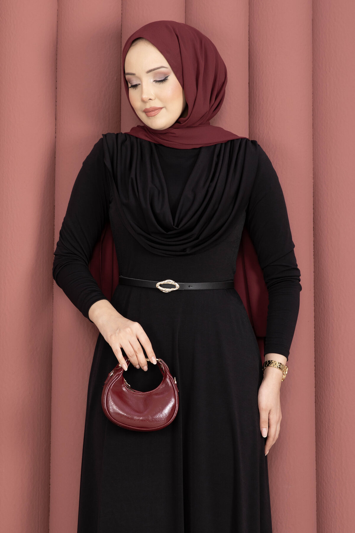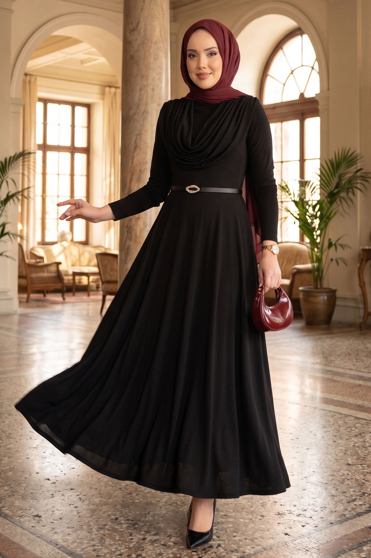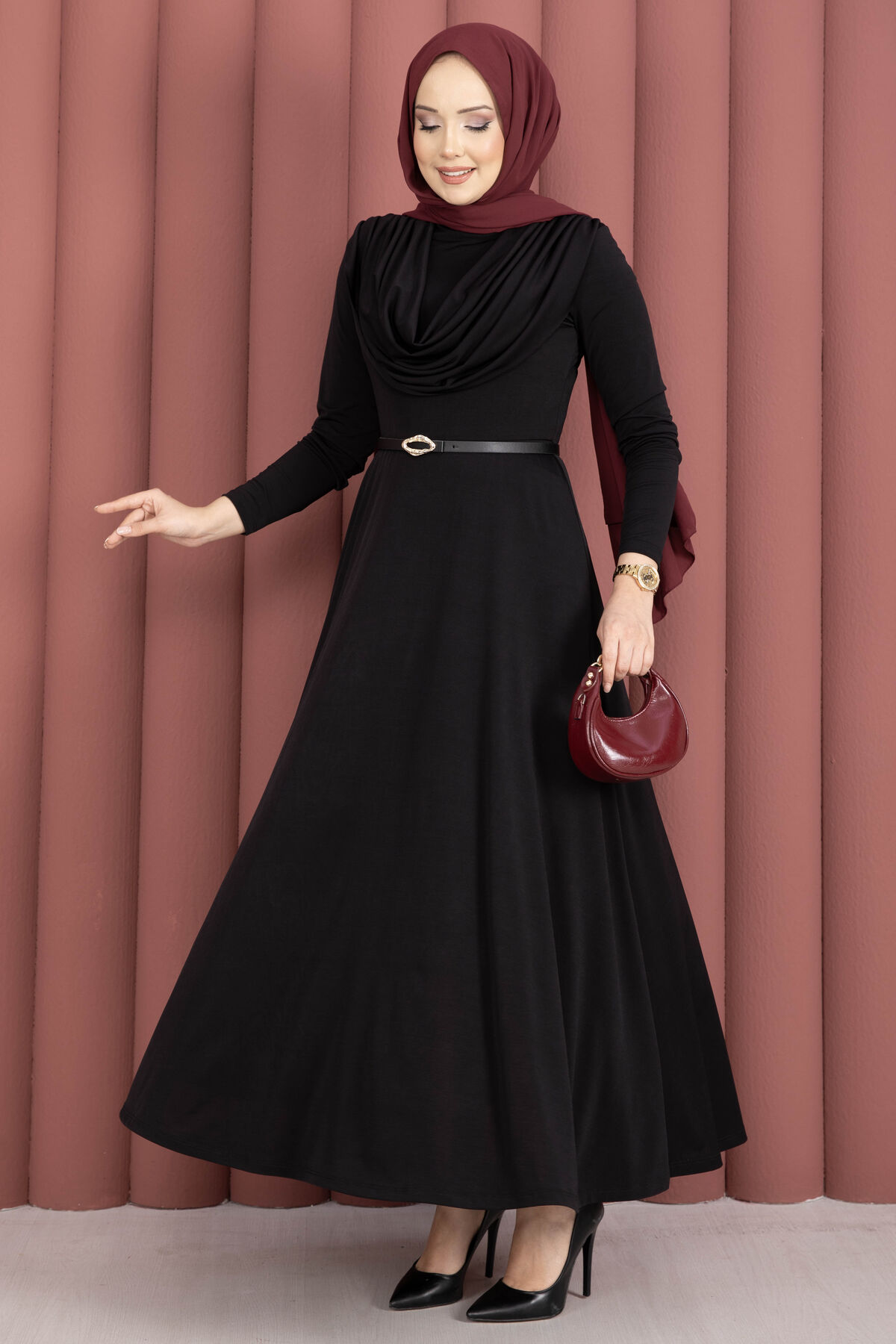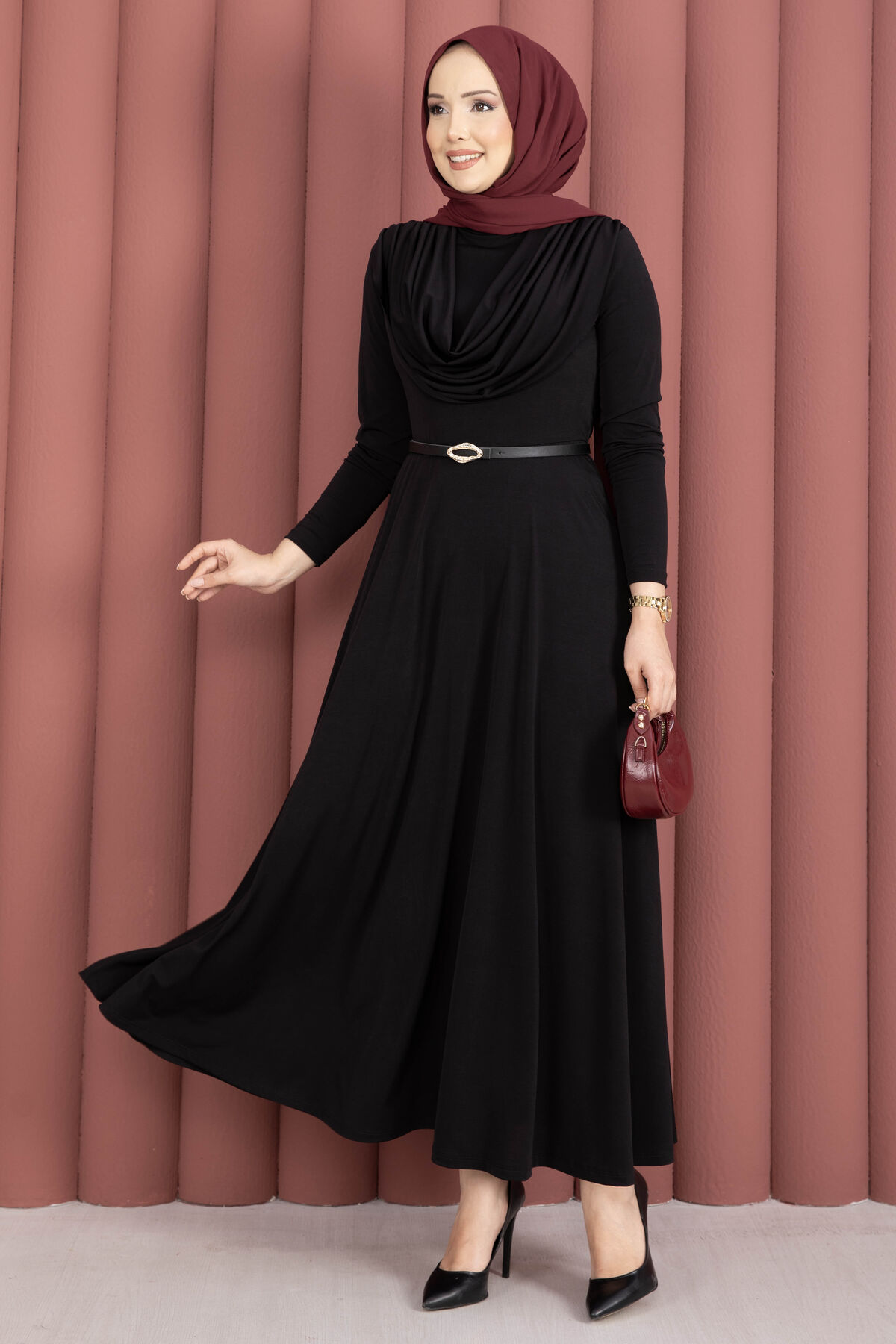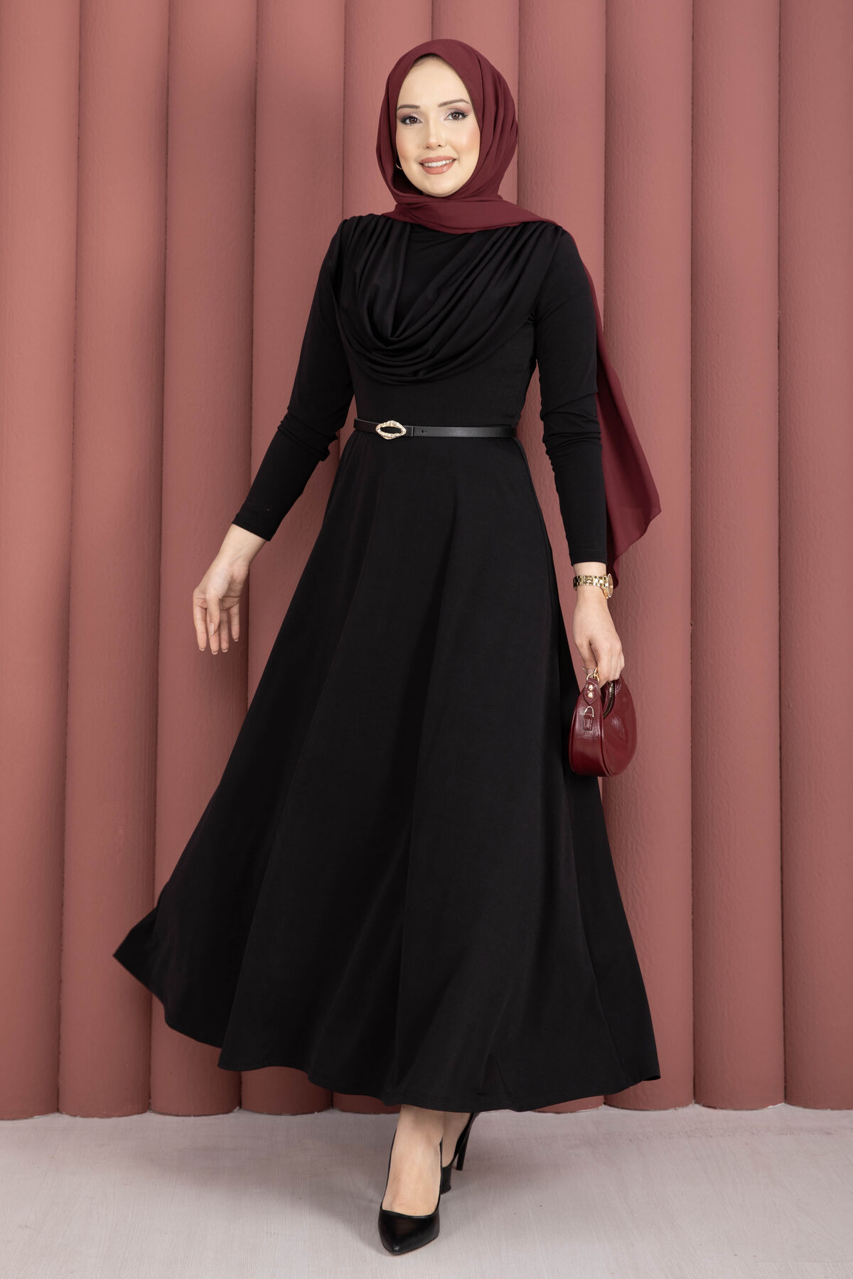 Degaje Yaka Beli Kemerli Sandy Elbise Siyah