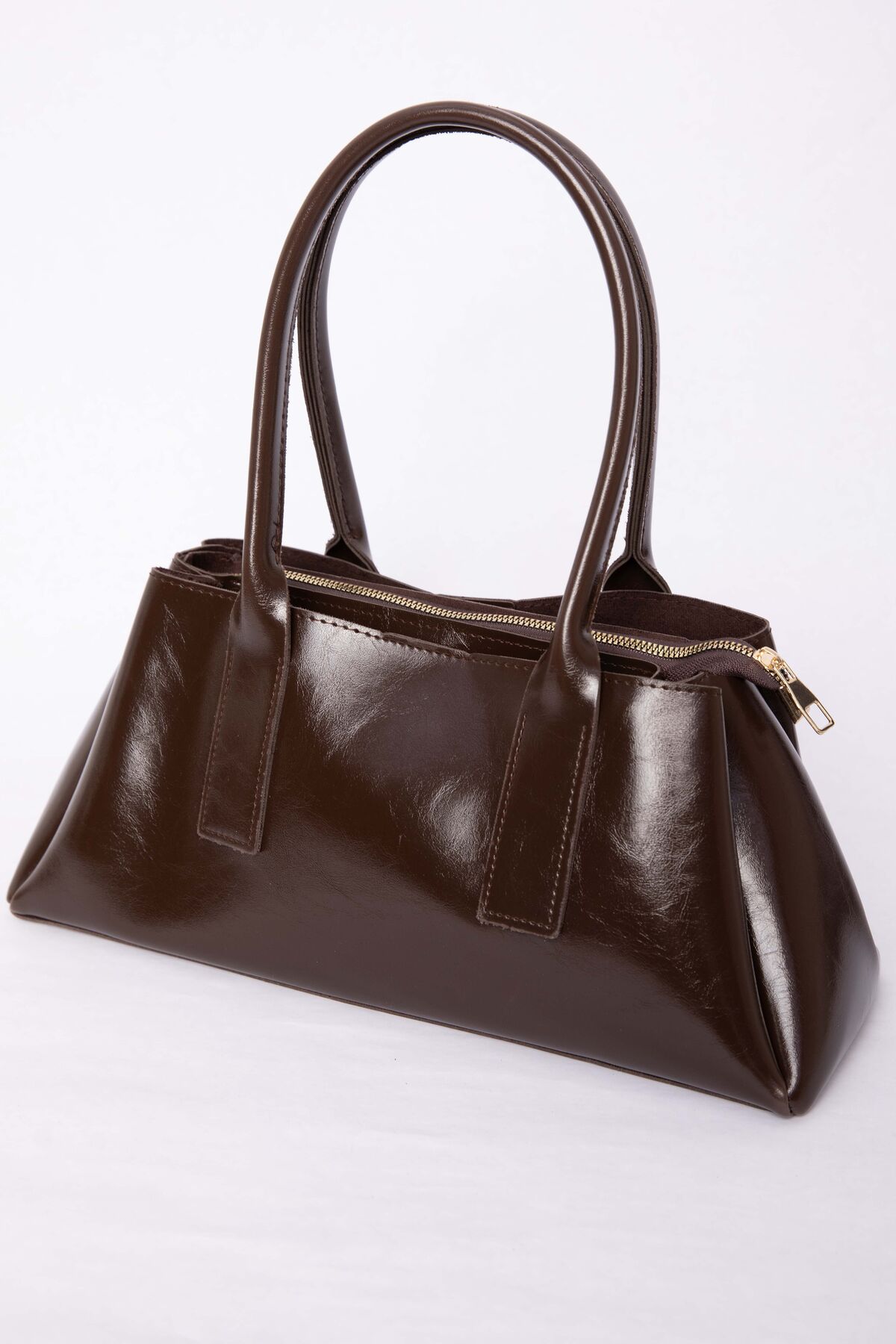Deri Görünümlü Fermuarlı El & Omuz Çantası Kahve