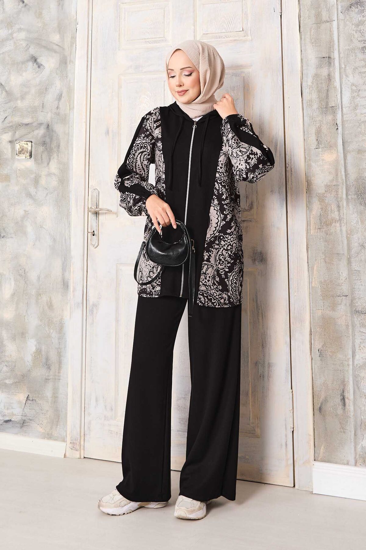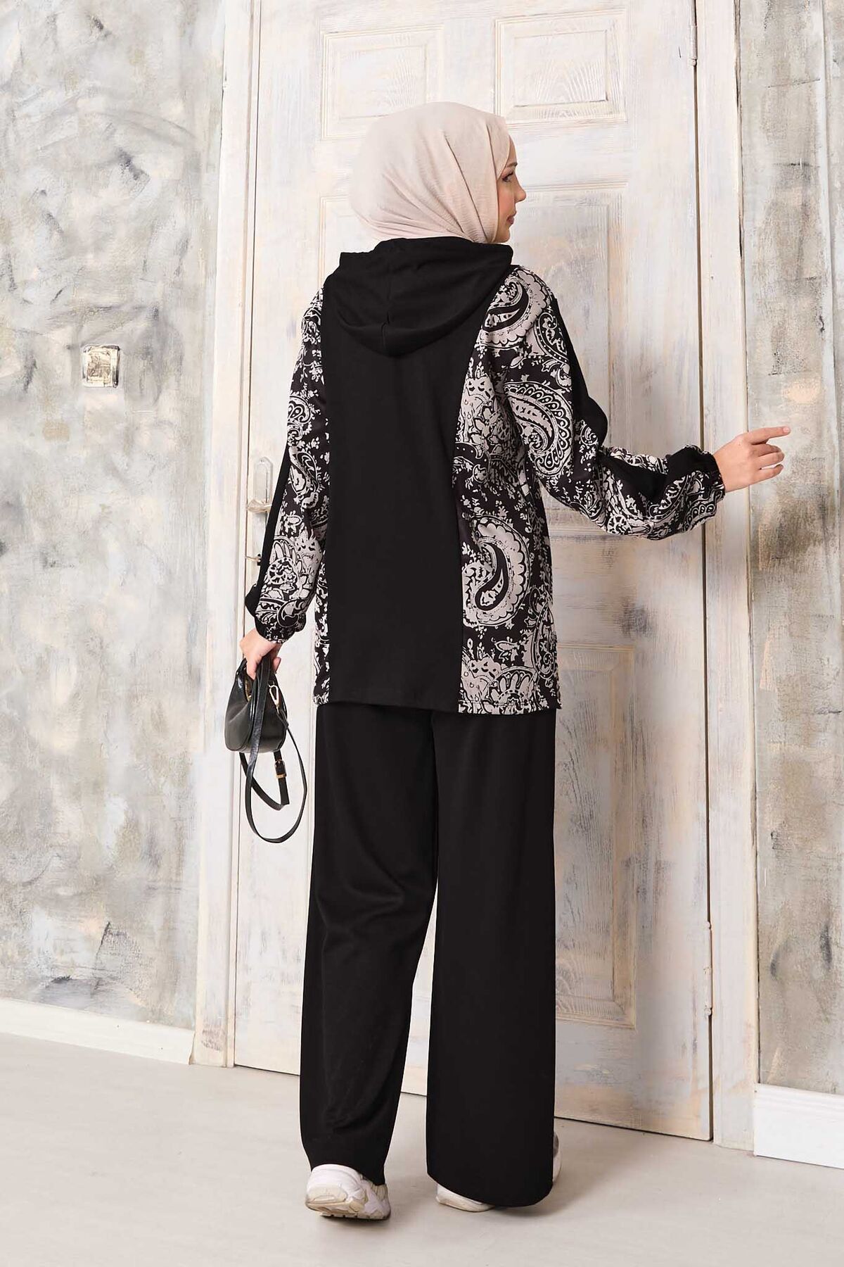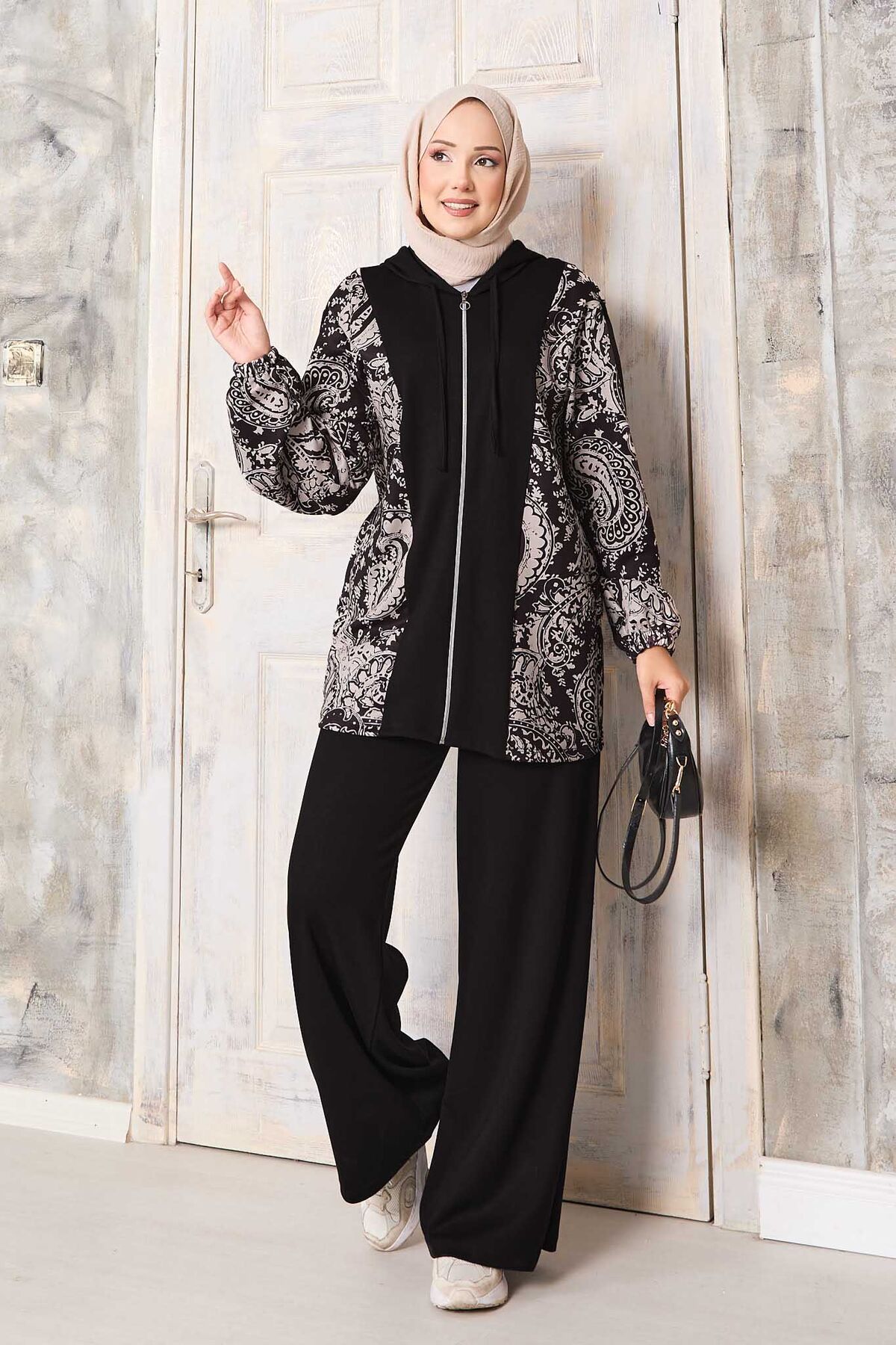 Desen Garnili Kapüşonlu Oyşo Takım Siyah