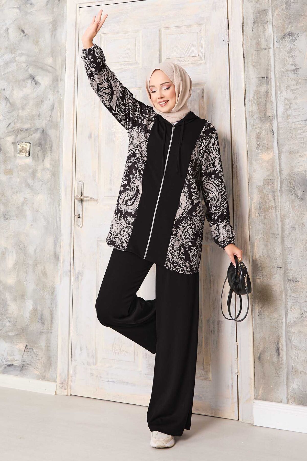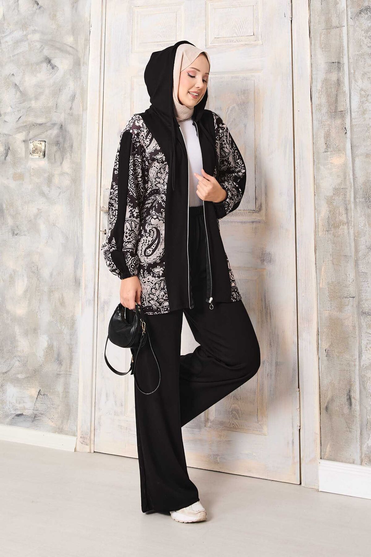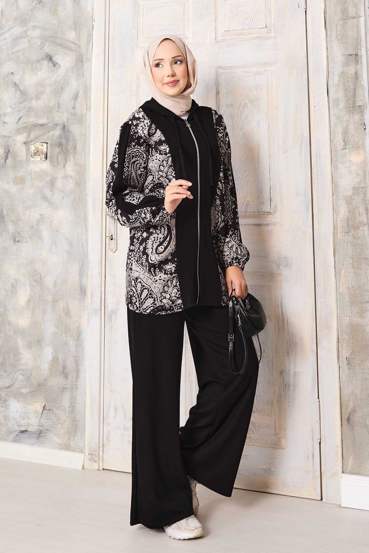 Desen Garnili Kapüşonlu Oyşo Takım Siyah