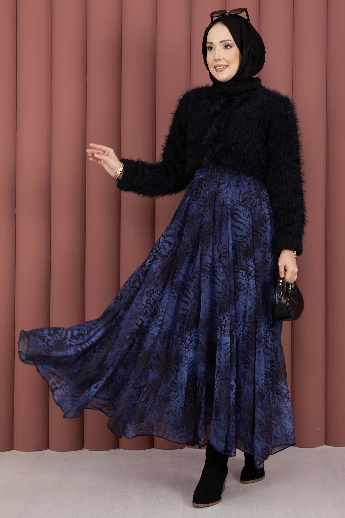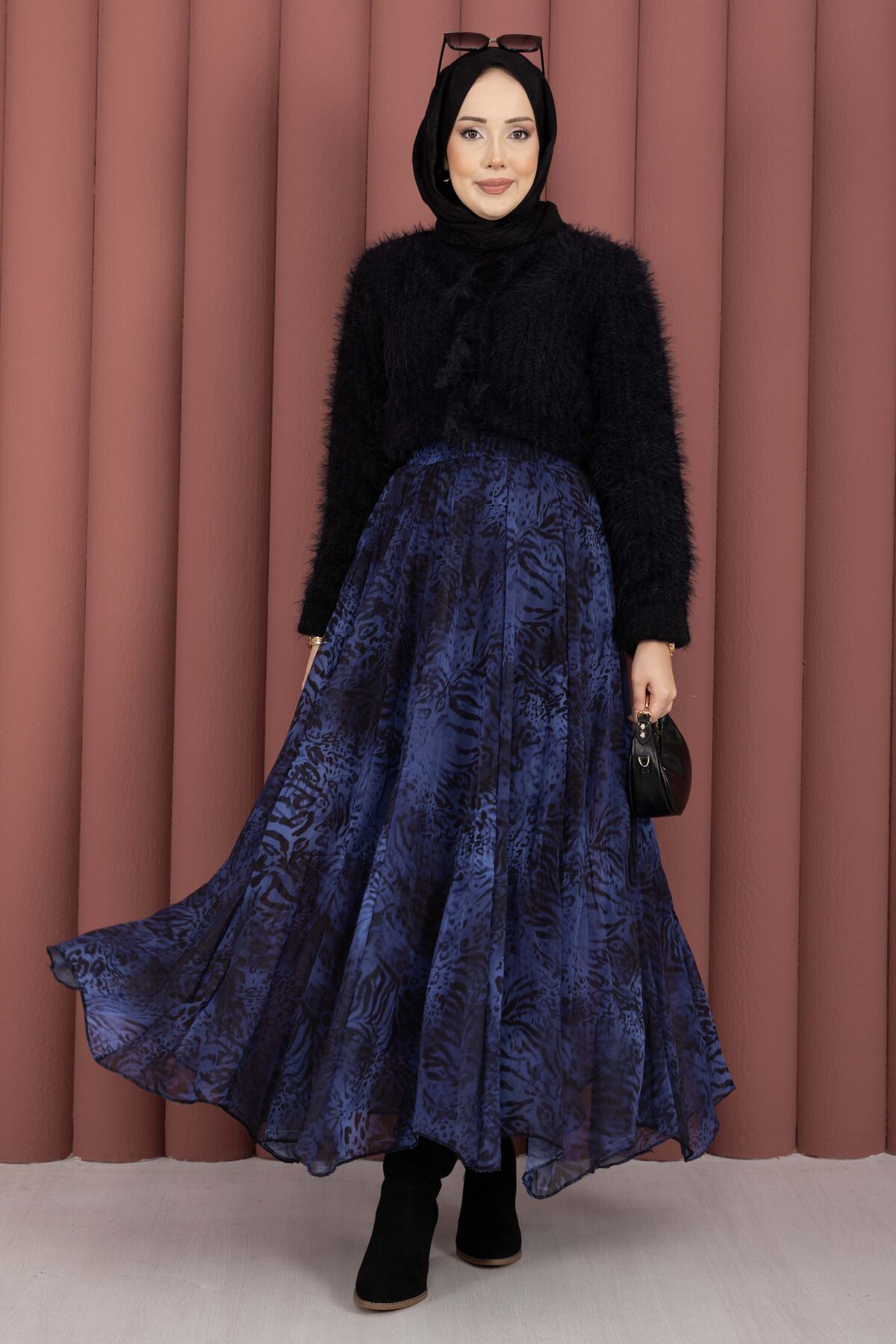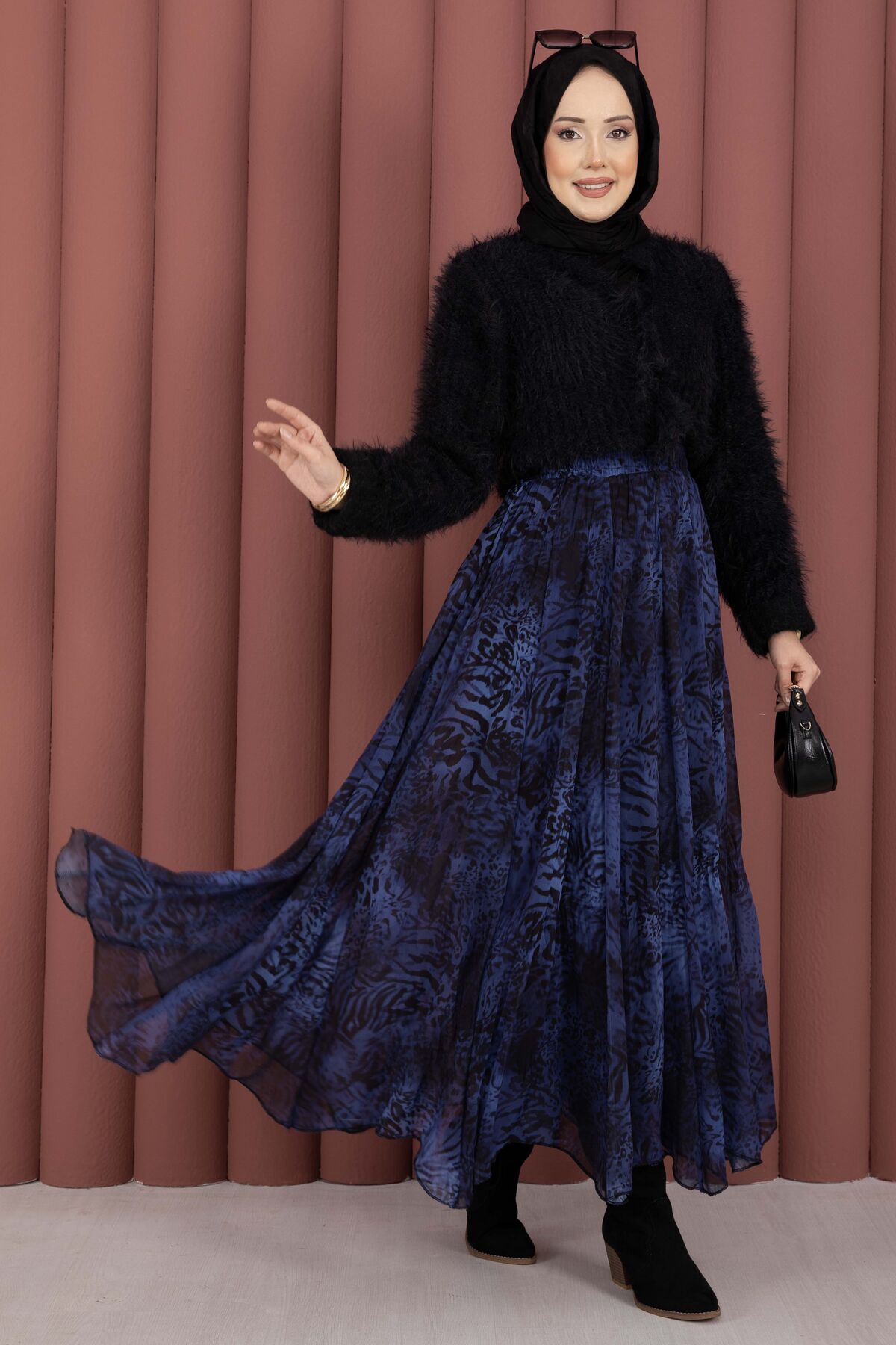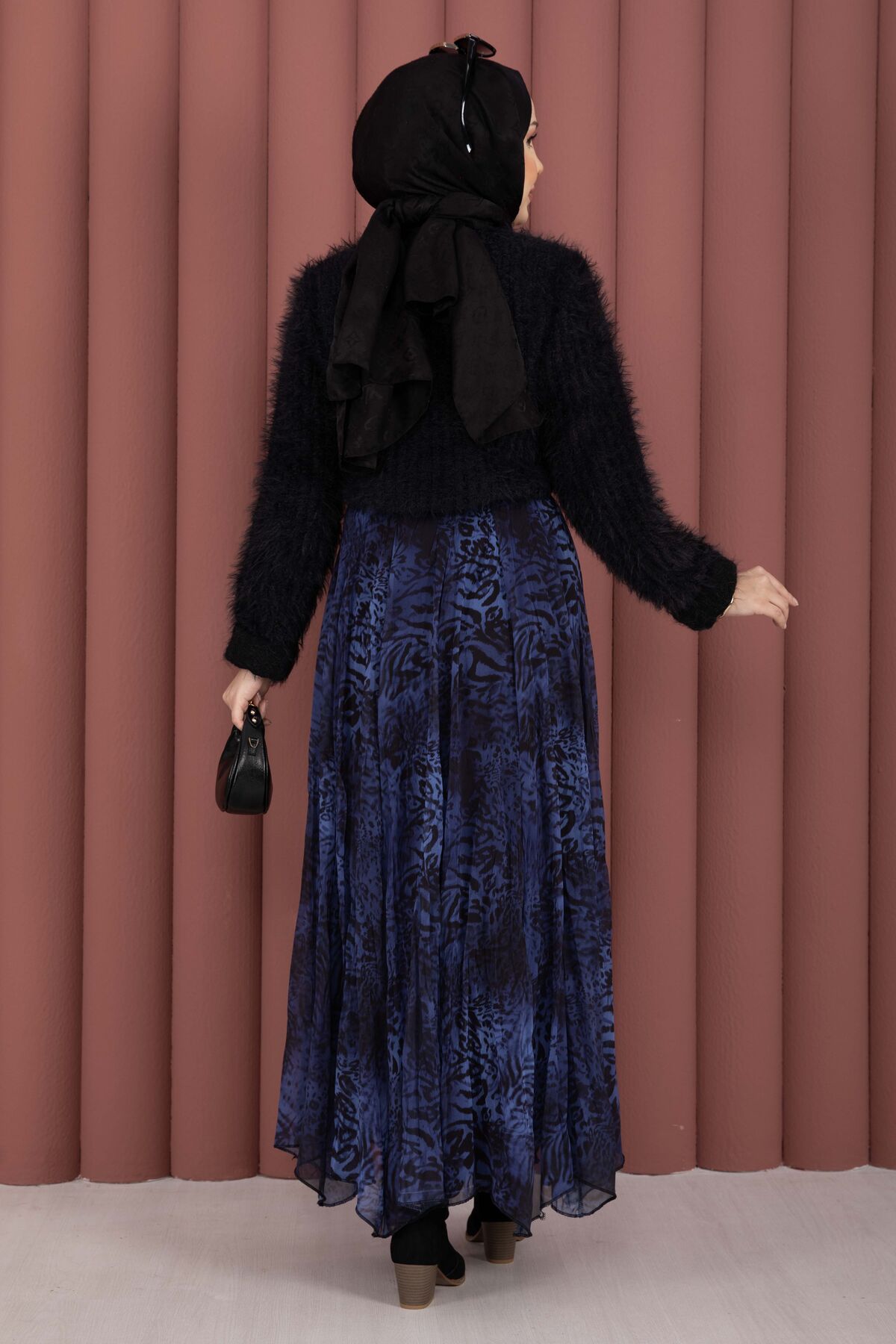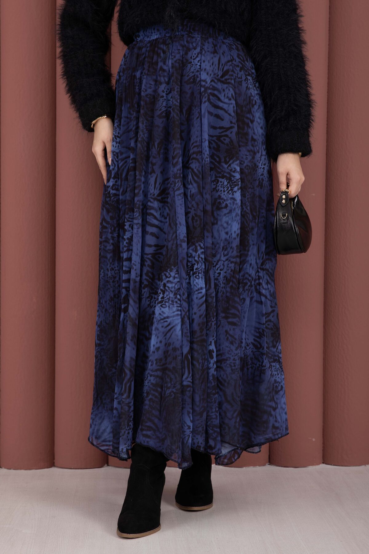 Flok Baskılı Şifon Etek Saks