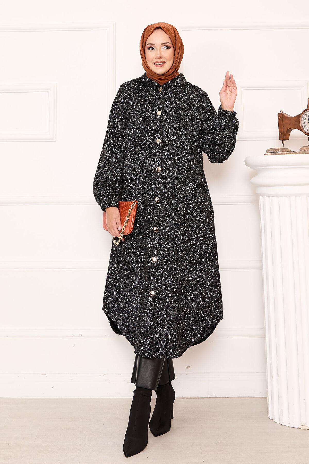 Desenli Boydan Düğmeli Kaşe Kap Siyah Beyaz