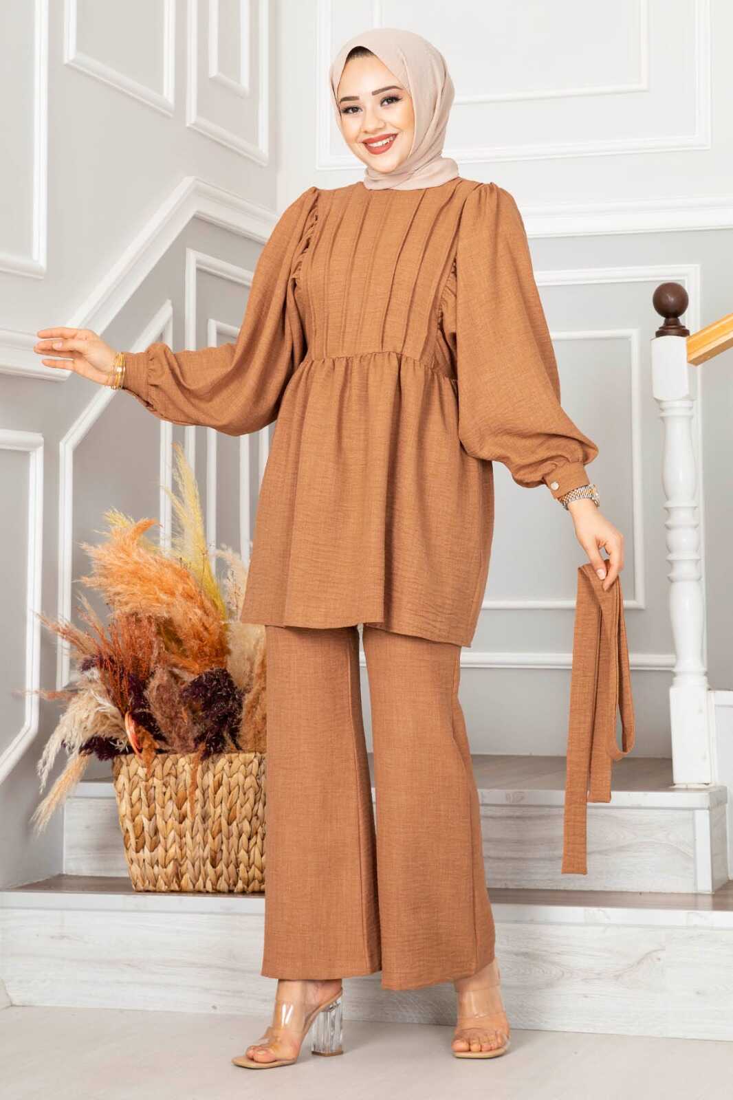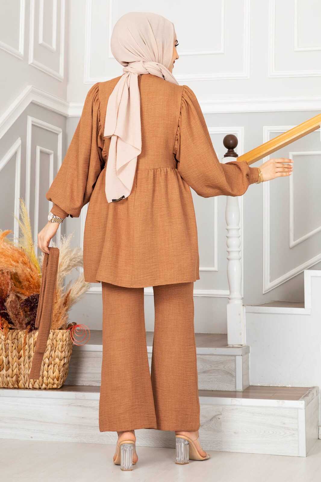 Drapeli Keten Tesettür Takım Taba