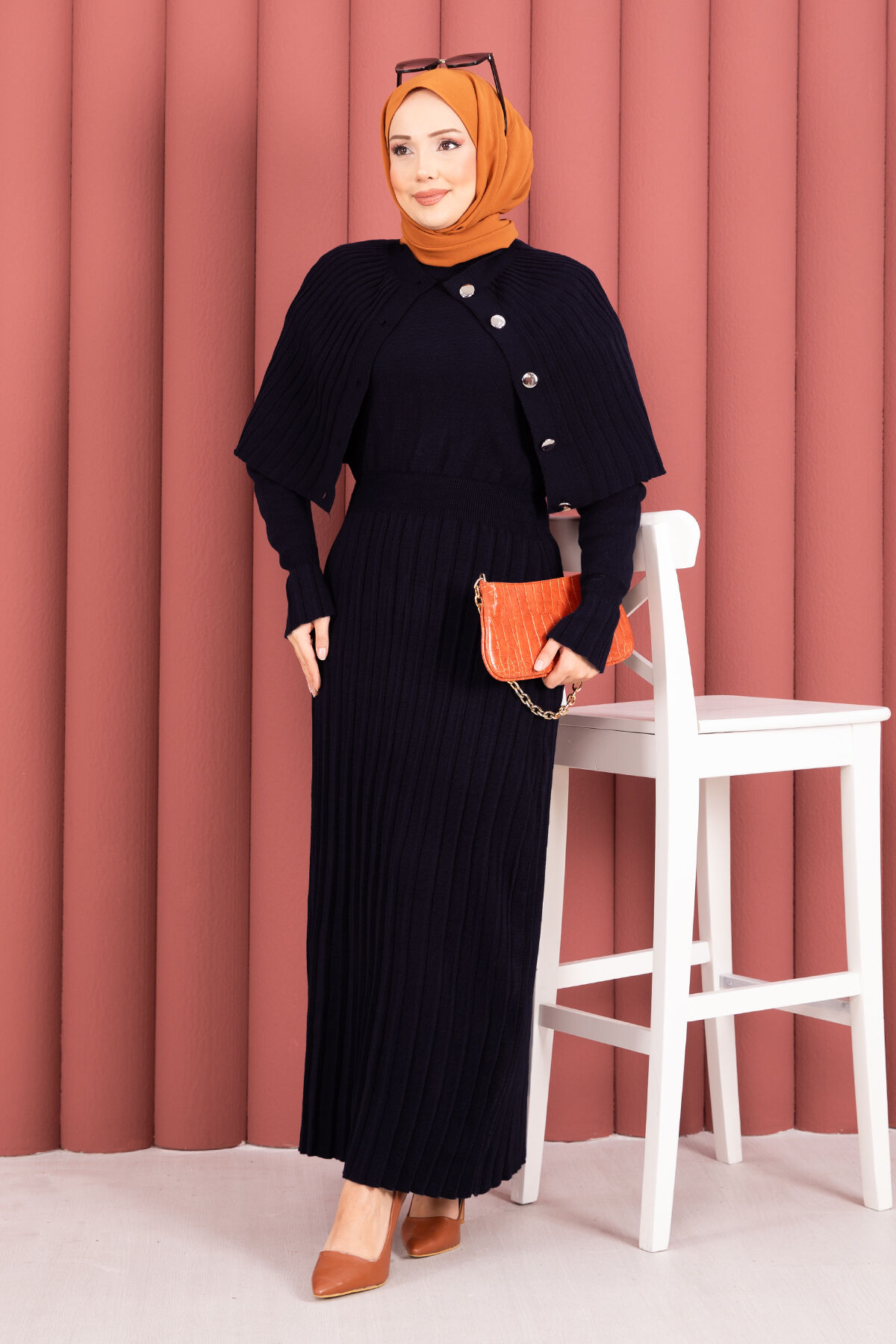 Düğme Detaylı Pelerinli Triko Elbise Takım Lacivert