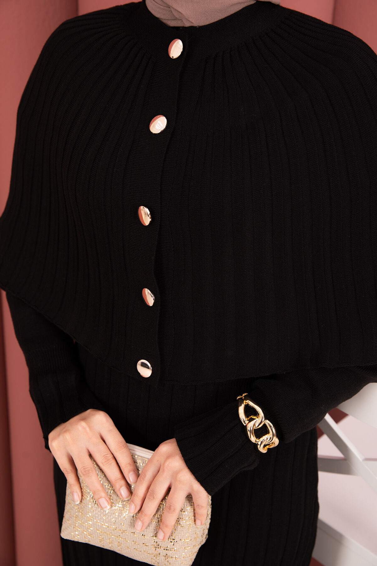 Düğme Detaylı Pelerinli Triko Elbise Takım Siyah