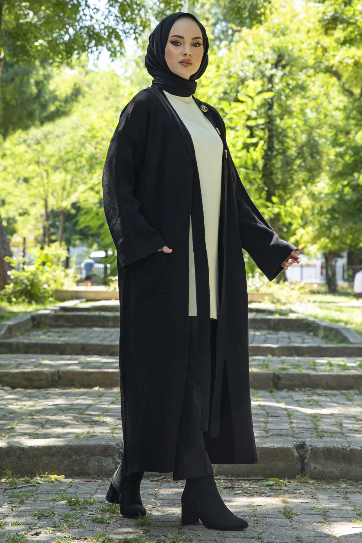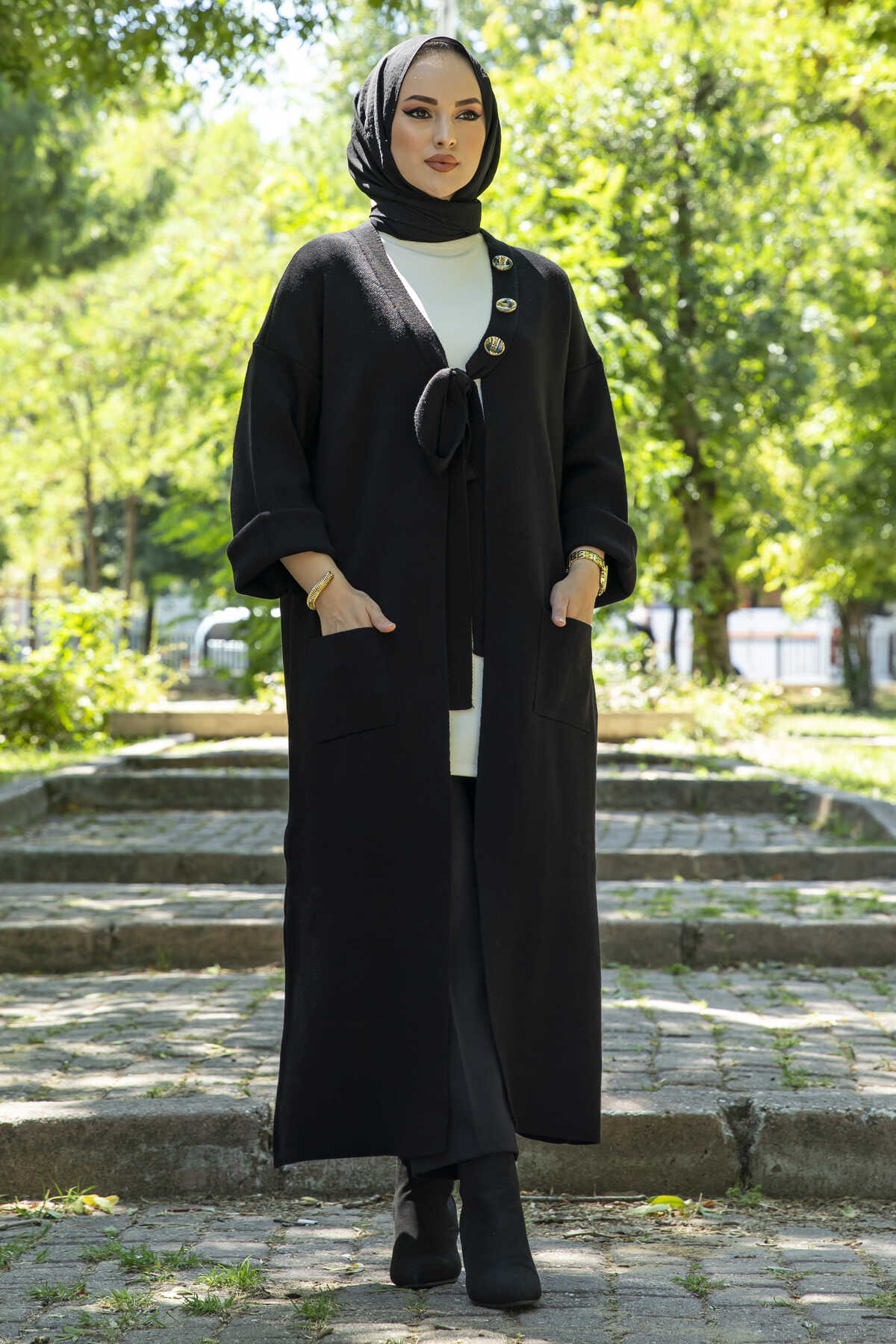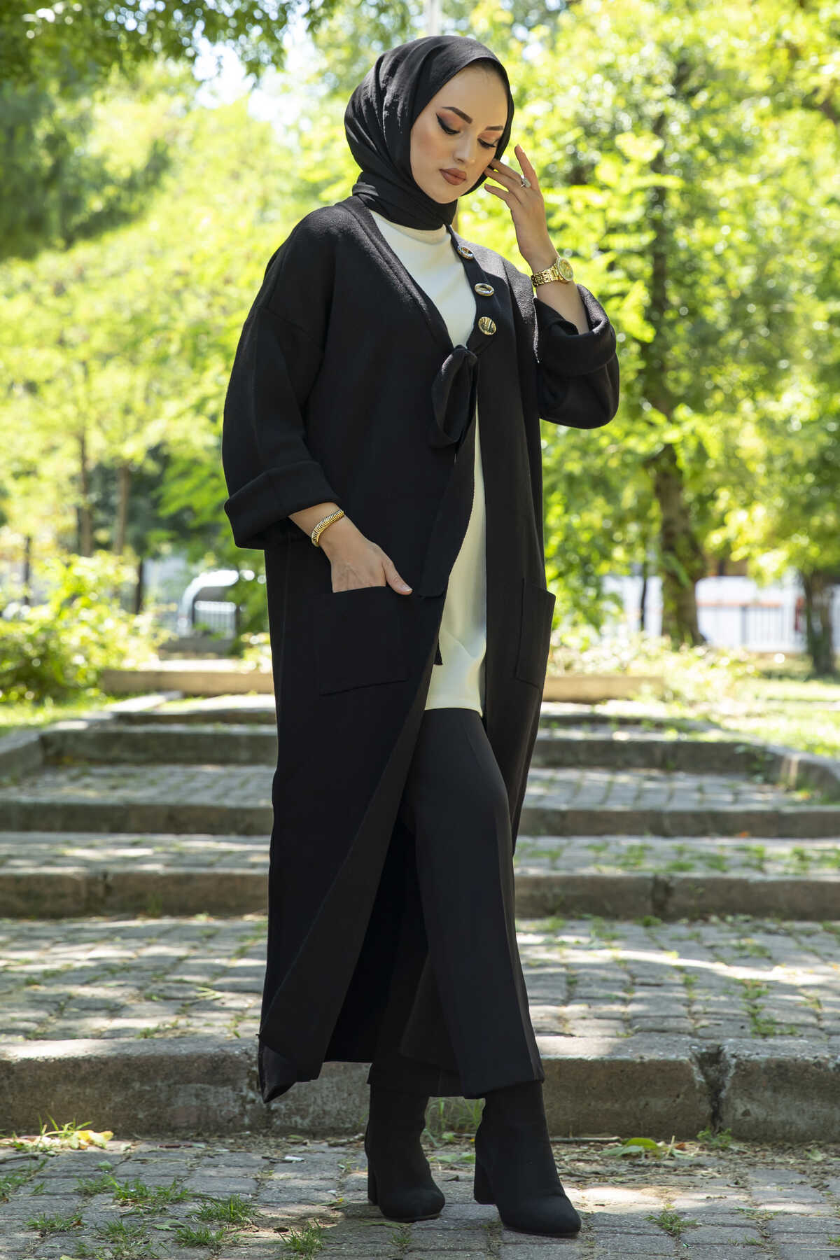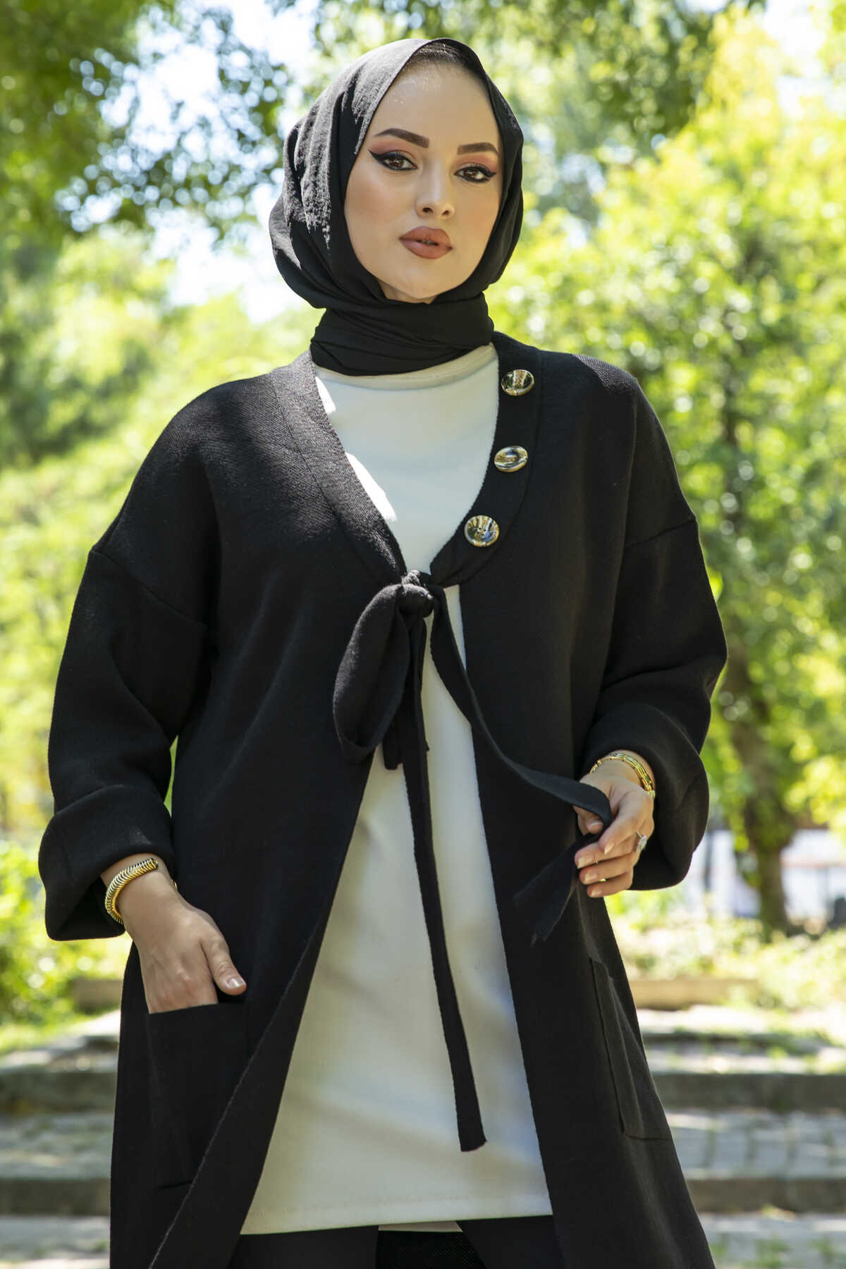 Düğme Detaylı Triko Tesettür Hırka Siyah